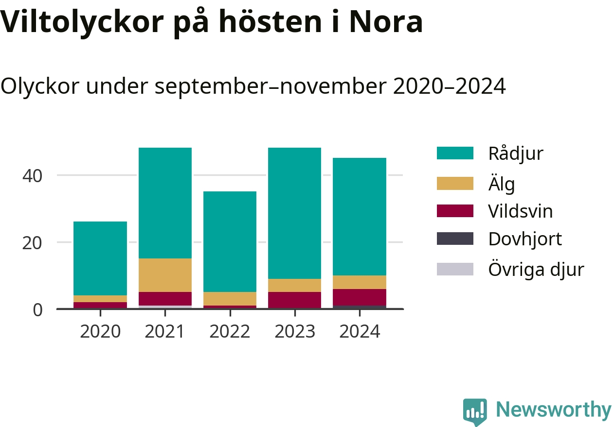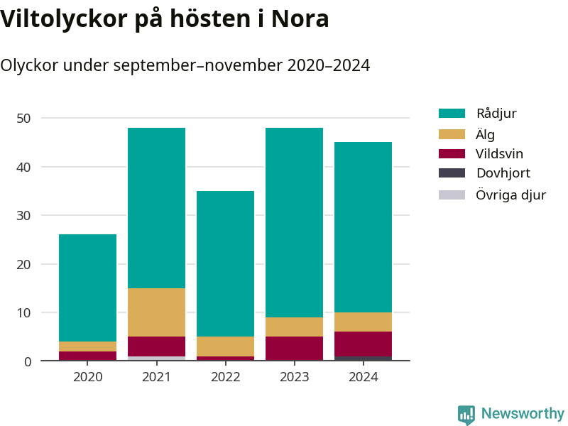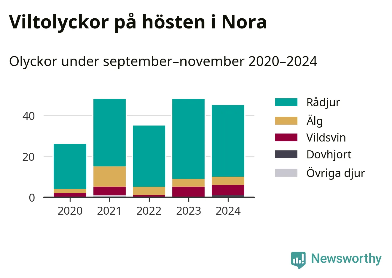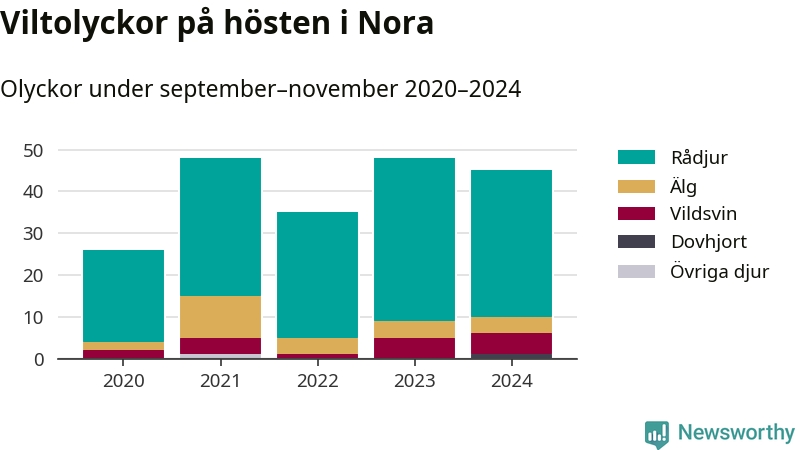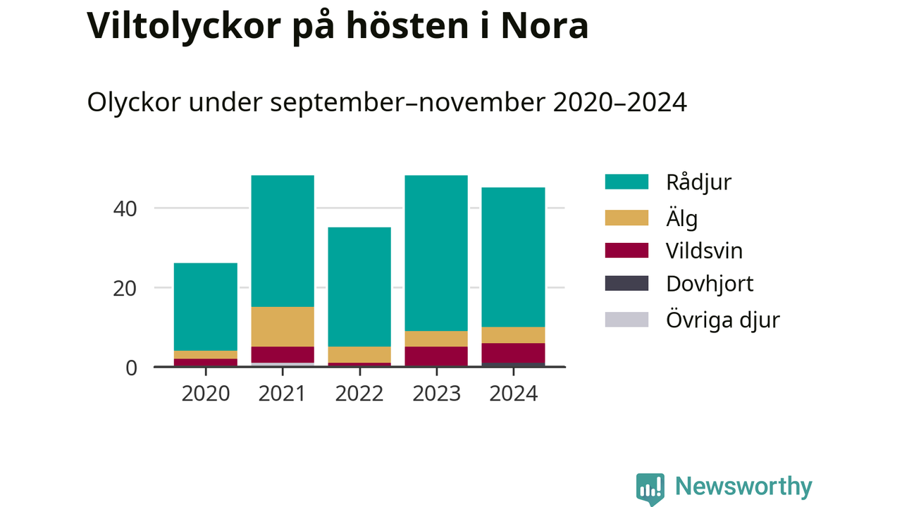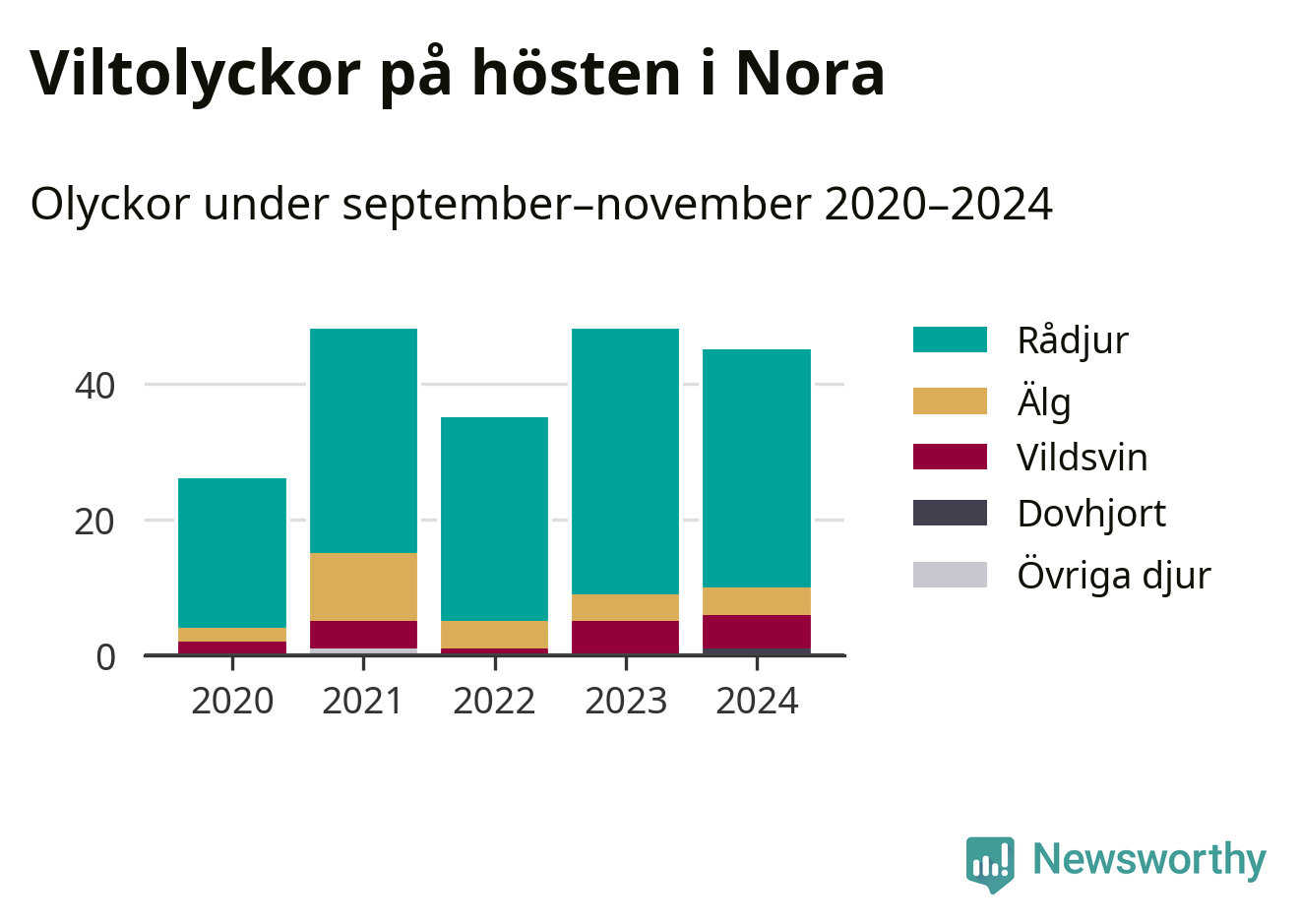 Under de senaste höstarna har antalet viltolyckor ökat i Sverige. Den höst med flest viltolyckor i Nora hittills under 2020-talet var 2021 och 2023, 48 olyckor. I fjol höst rapporterades totalt 45 olyckor.