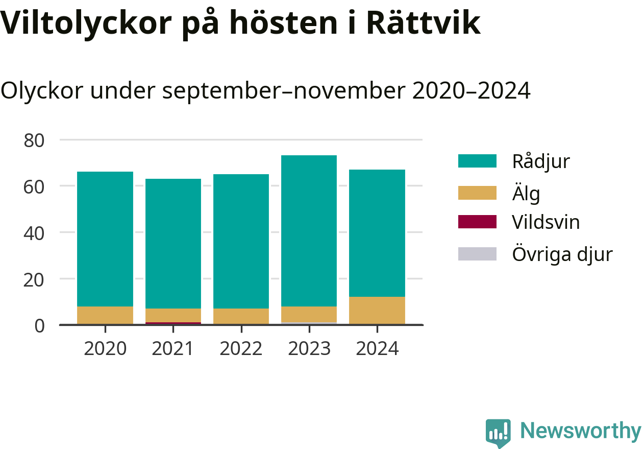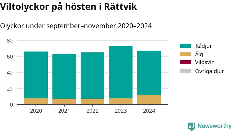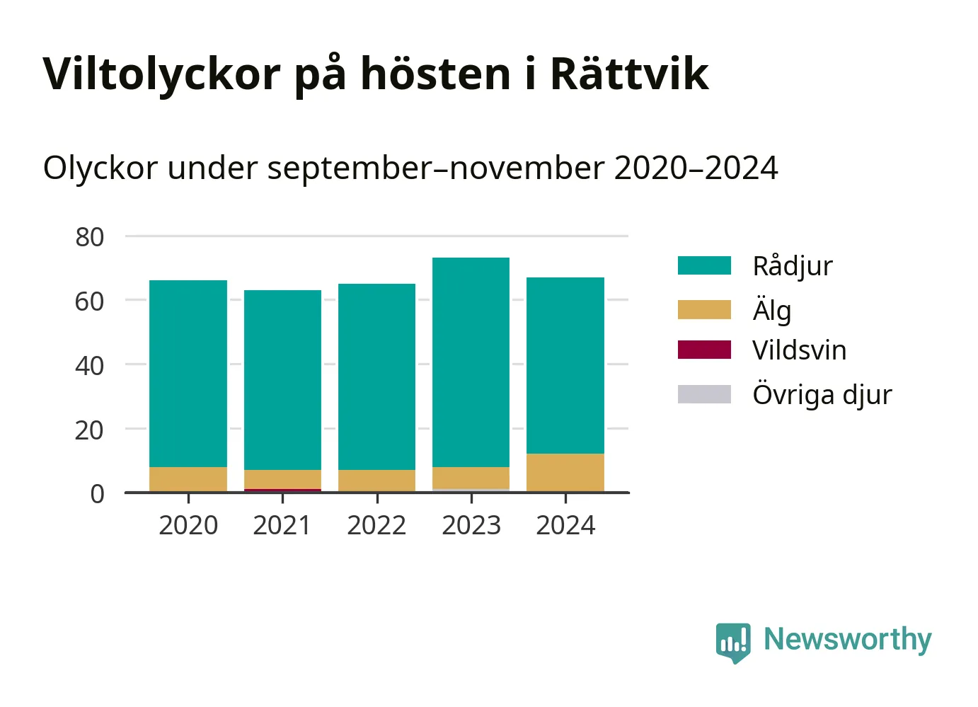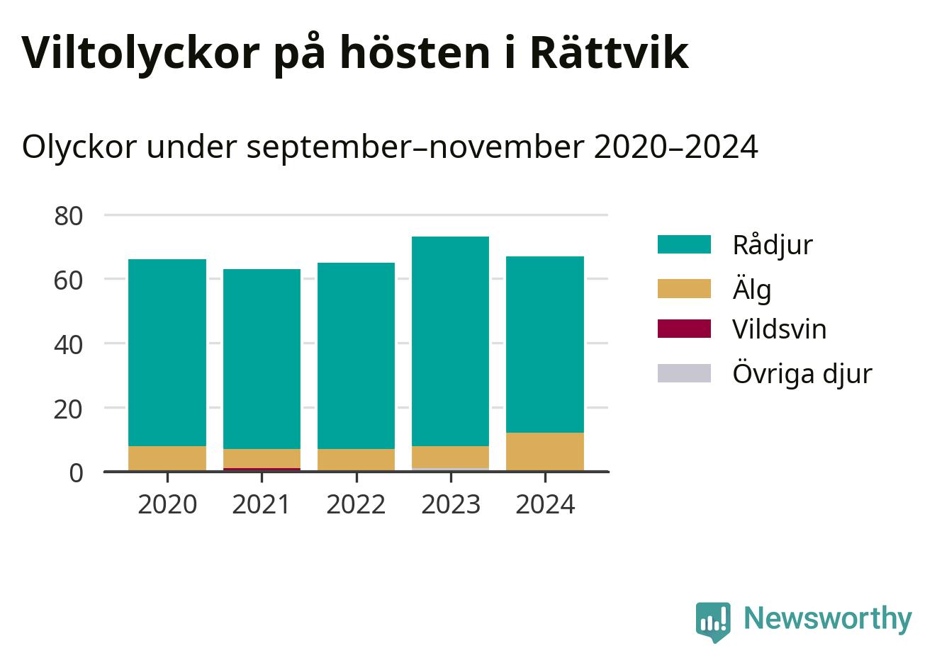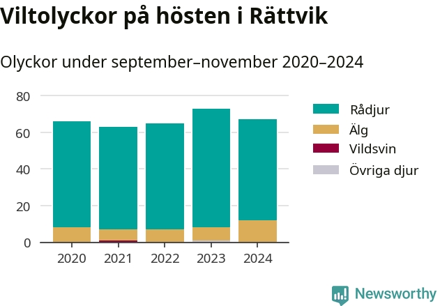 Under de senaste höstarna har antalet viltolyckor ökat i Sverige. Den höst med flest viltolyckor i Rättvik hittills under 2020-talet var 2023, 73 olyckor. I fjol höst rapporterades totalt 67 olyckor.