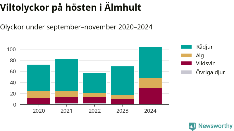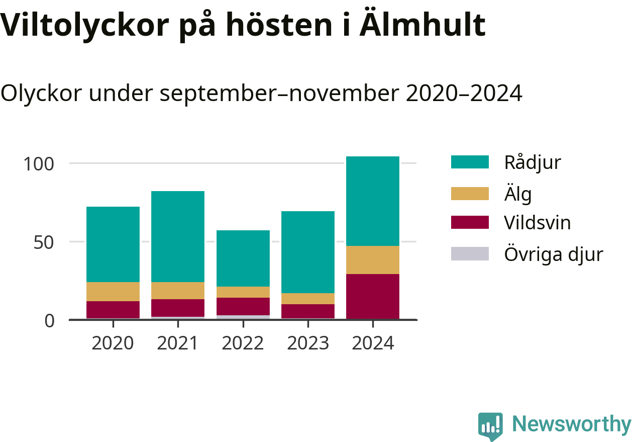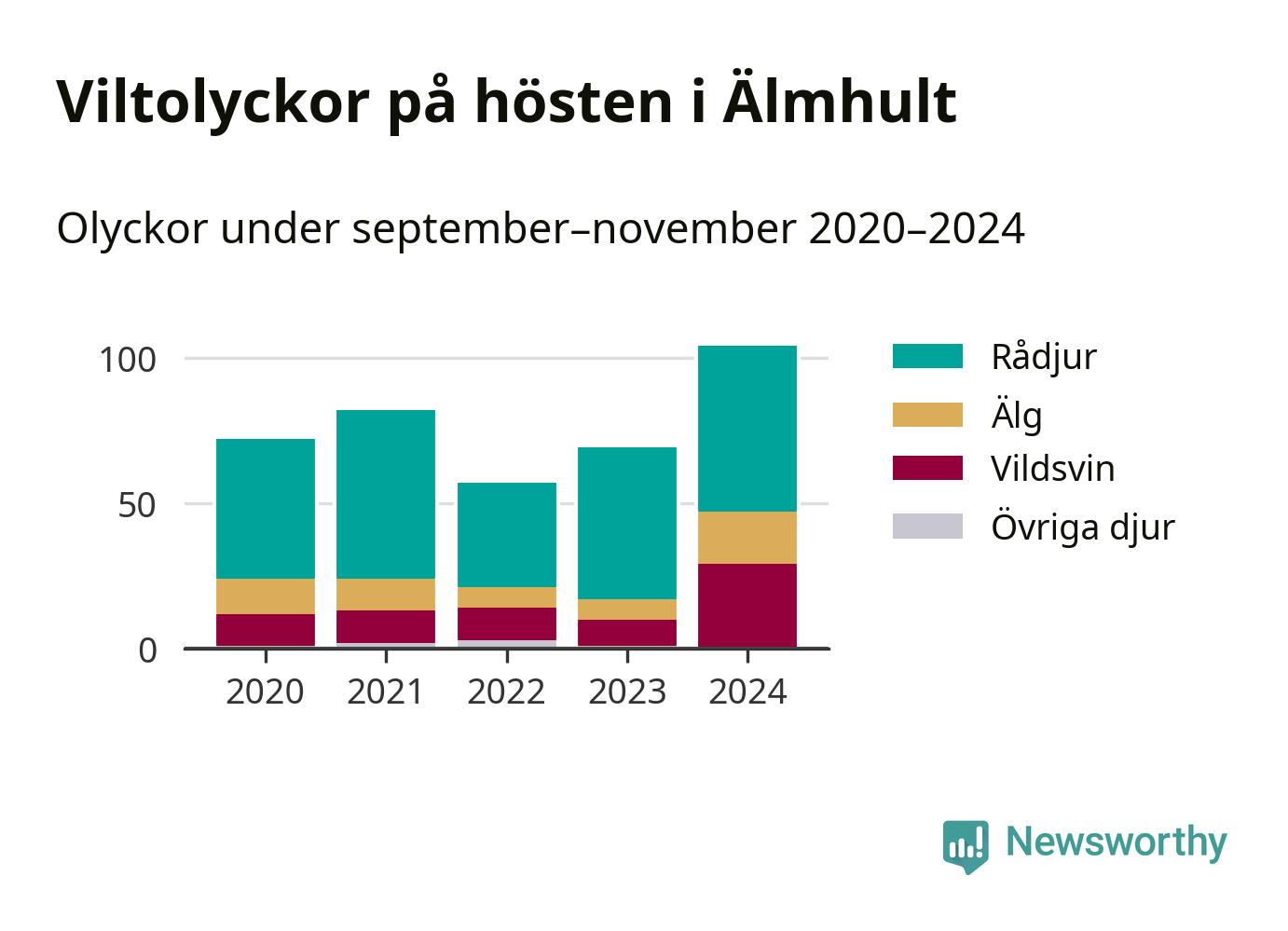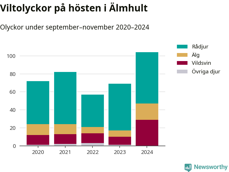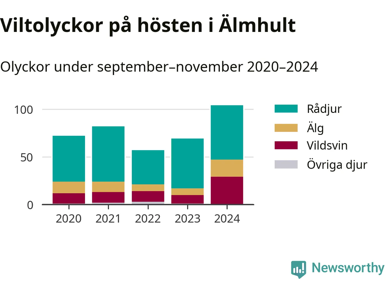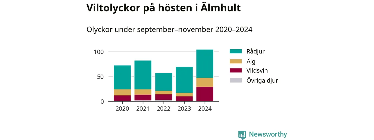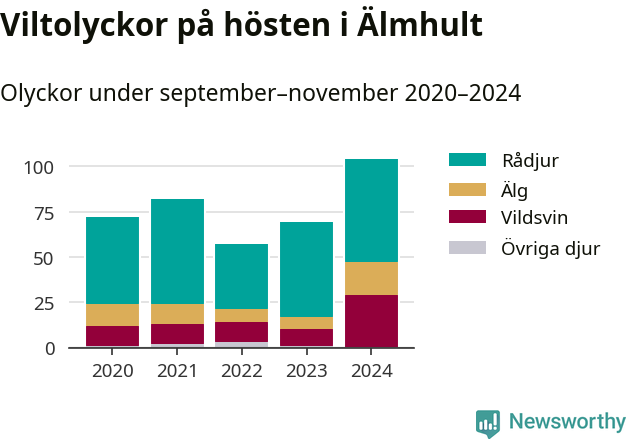 Viltolyckor i Älmhult 2020–2024 uppdelat på viltslag