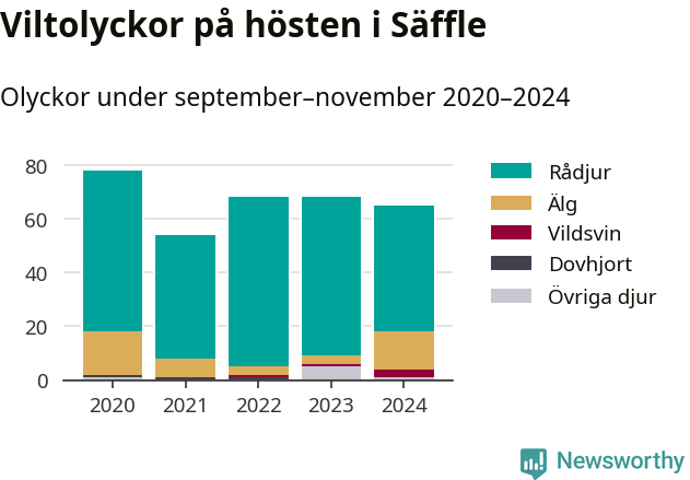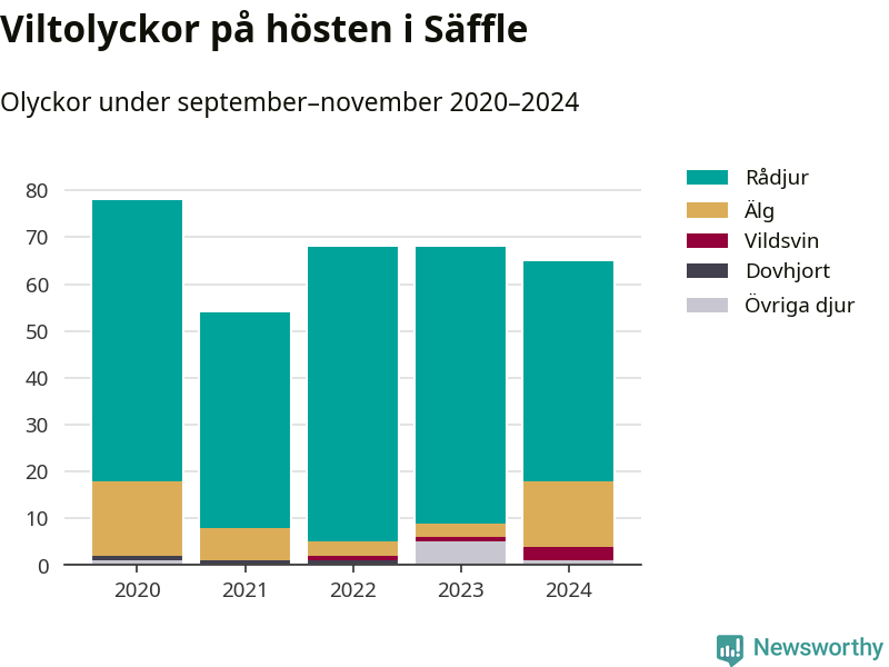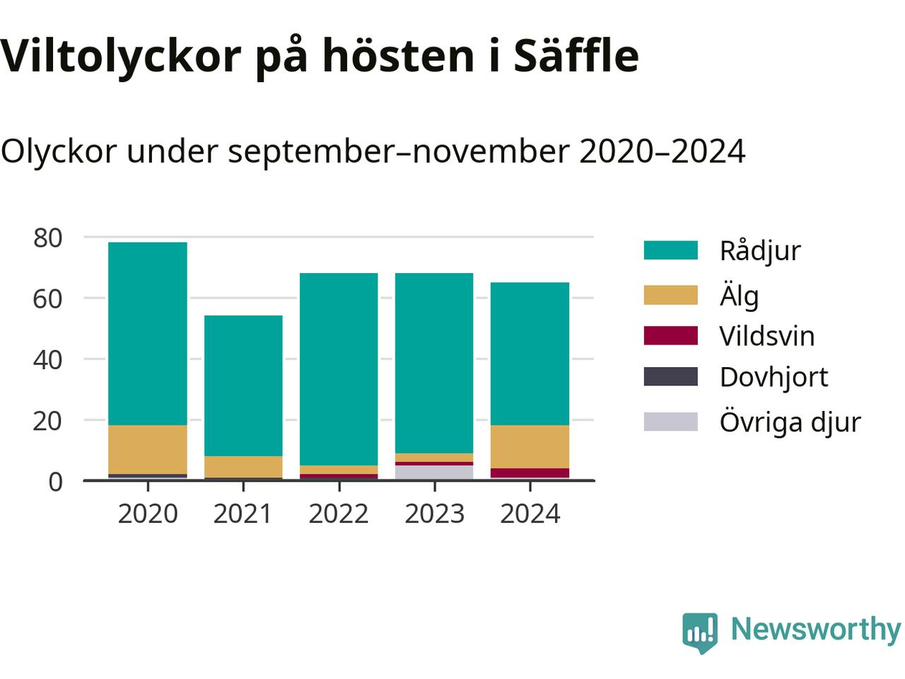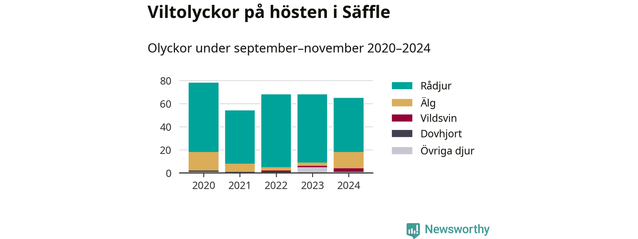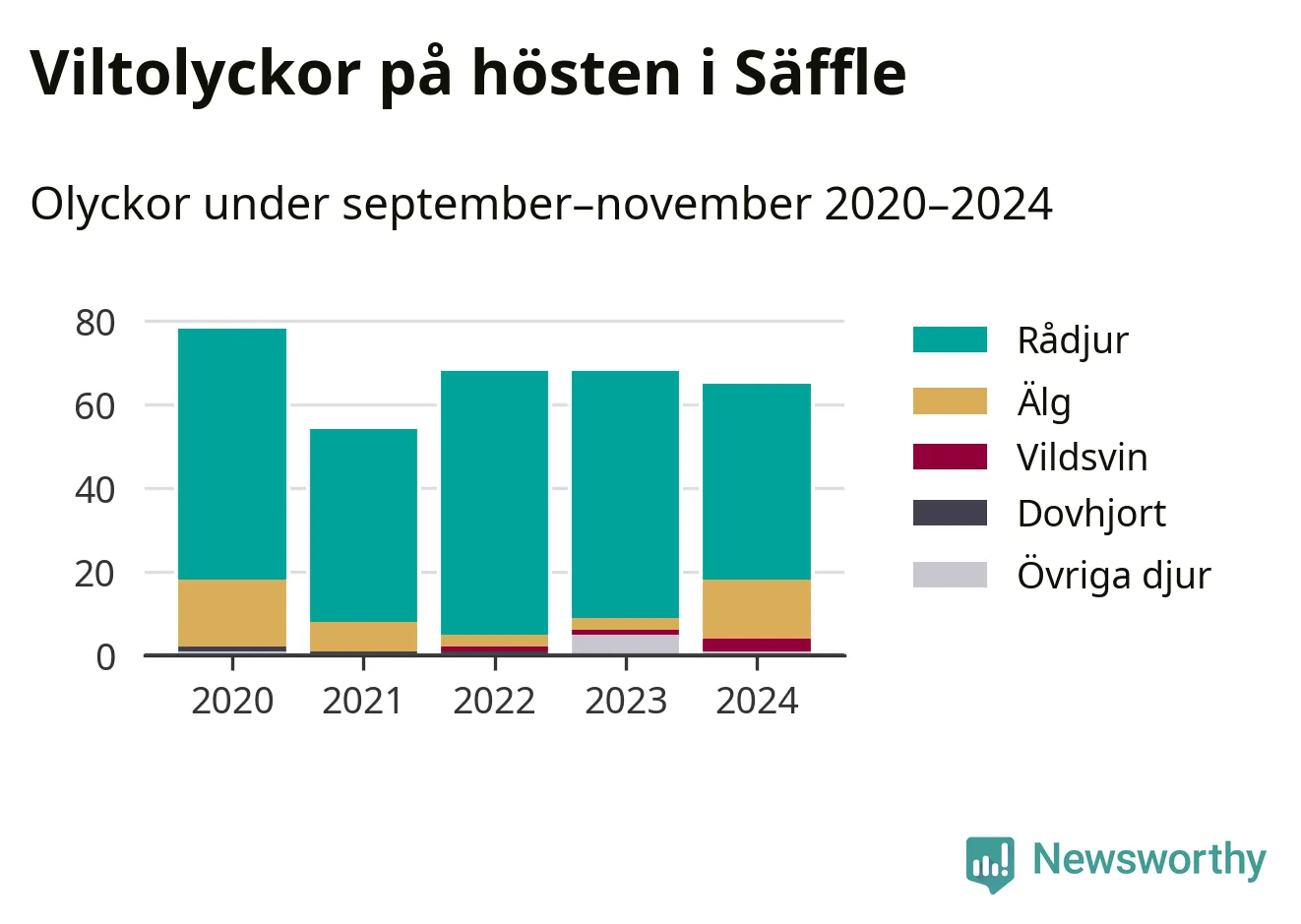 Under de senaste höstarna har antalet viltolyckor ökat i Sverige. Den höst med flest viltolyckor i Säffle hittills under 2020-talet var 2020, 78 olyckor. I fjol höst rapporterades totalt 65 olyckor.