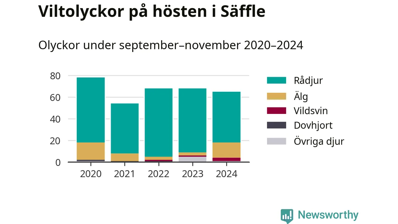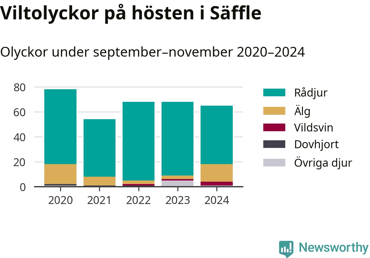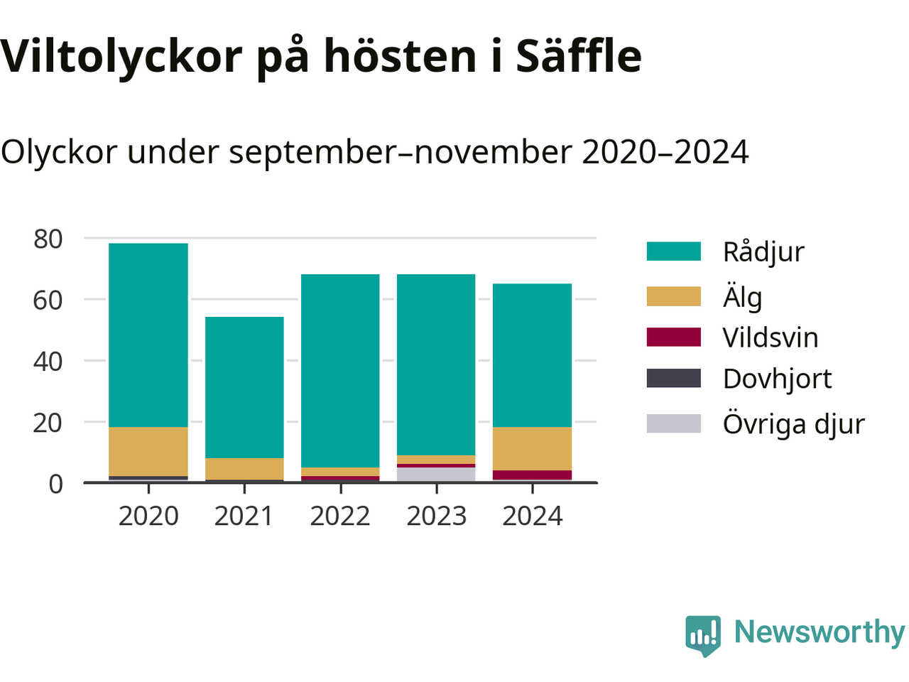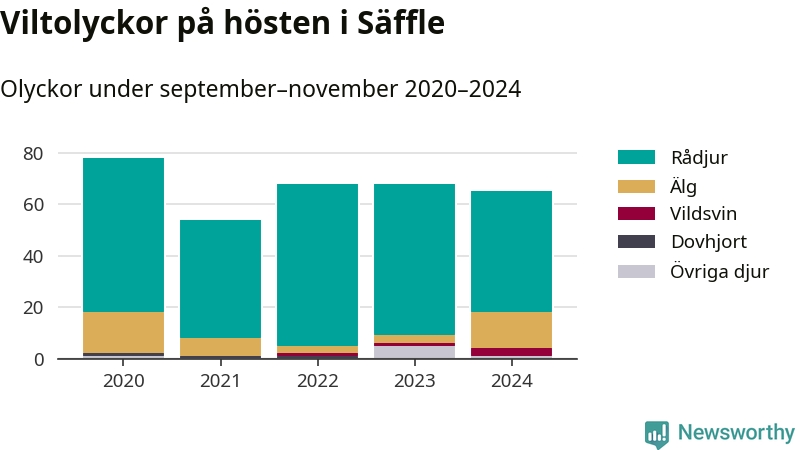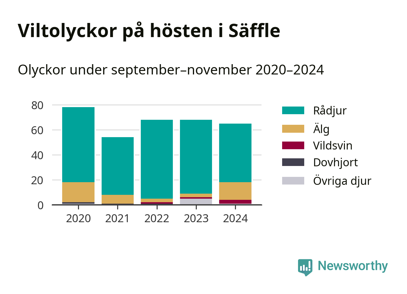 Under de senaste höstarna har antalet viltolyckor ökat i Sverige. Den höst med flest viltolyckor i Säffle hittills under 2020-talet var 2020, 78 olyckor. I fjol höst rapporterades totalt 65 olyckor.