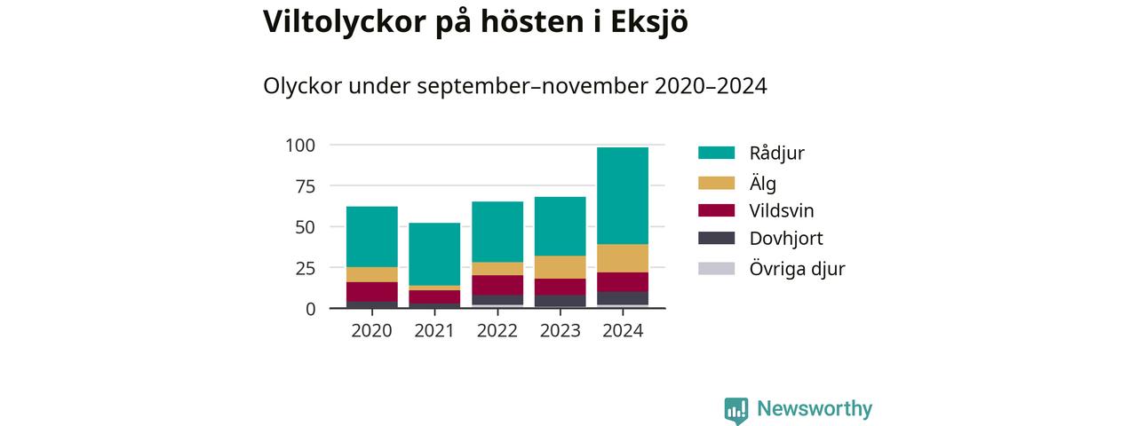 Viltolyckor i Eksjö 2020–2024 uppdelat på viltslag