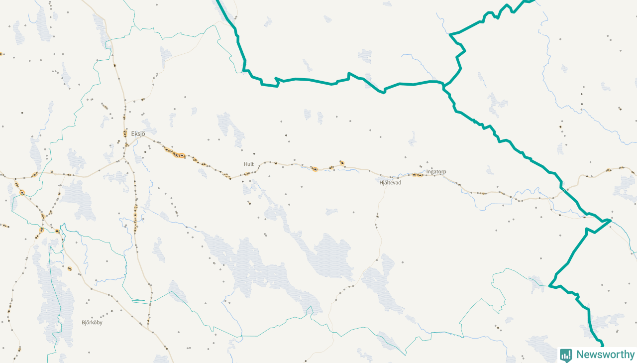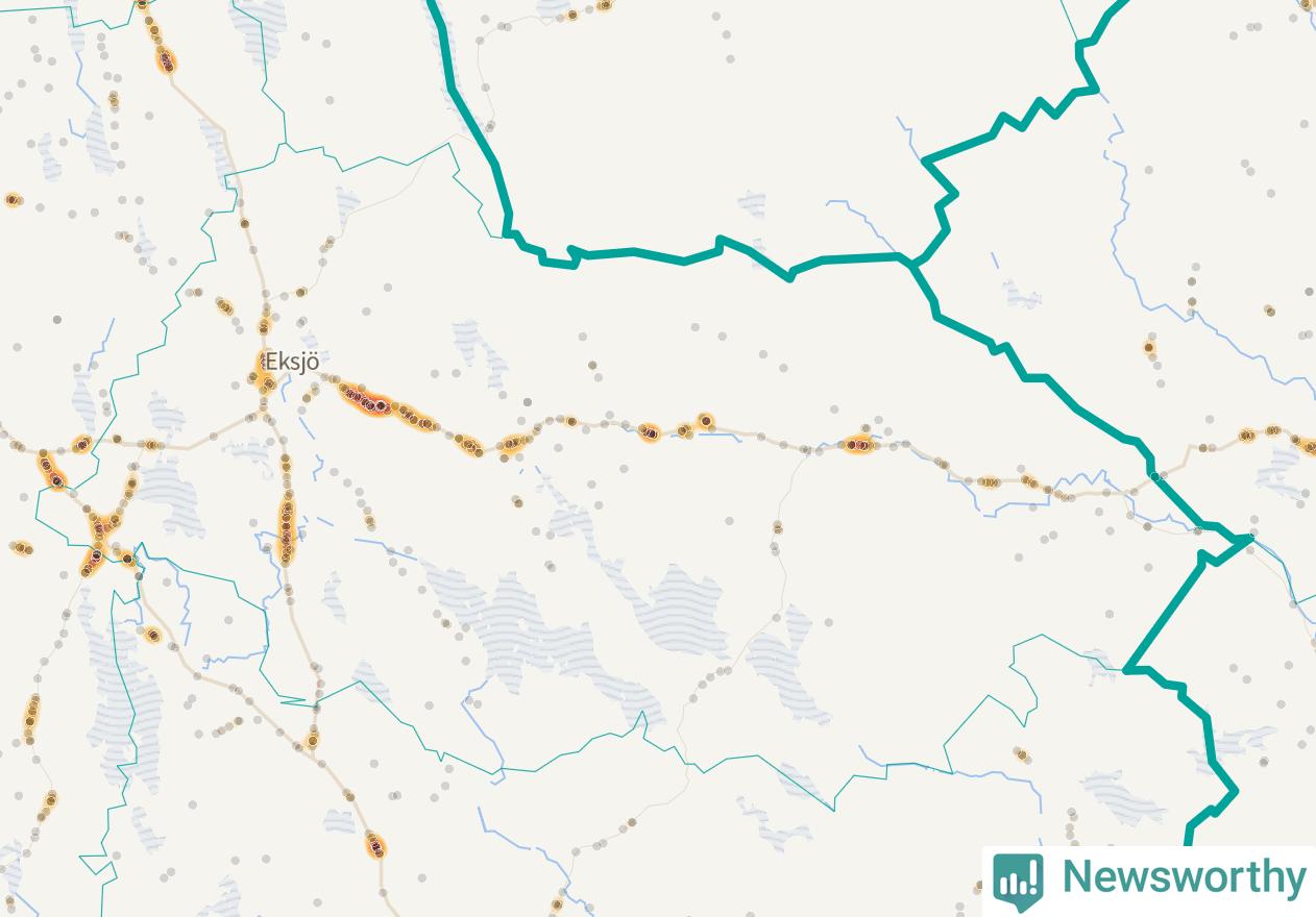 Flest olyckor i kommunen – 129 stycken – har skett längs väg 40 (då räknar vi in två olyckor där väg 40 har gemensam sträckning med väg 32). Av dessa orsakades 77 av rådjur. Längs väg 32 har 59 viltolyckor rapporterats under motsvarande period.