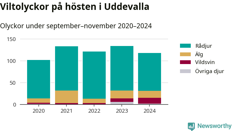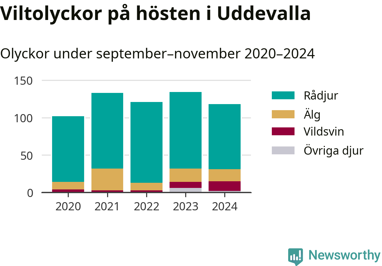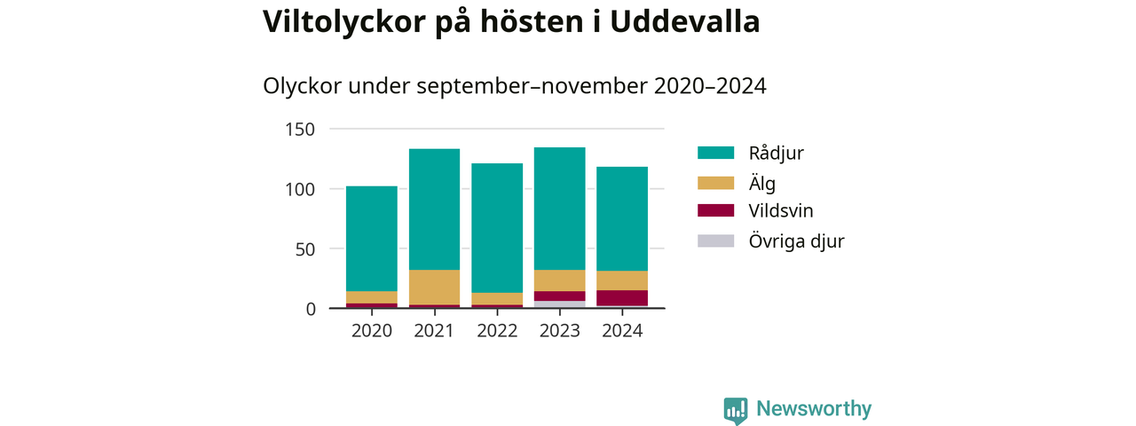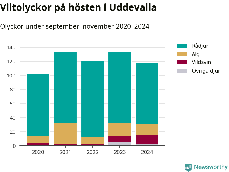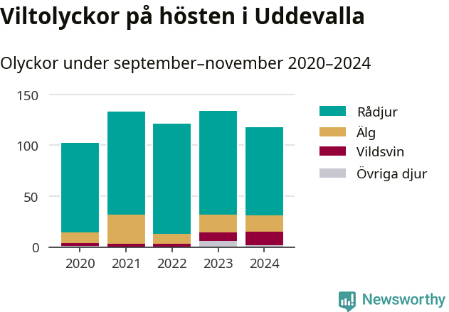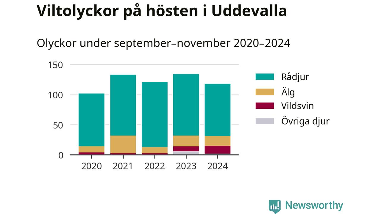 Under de senaste höstarna har antalet viltolyckor ökat i Sverige. Den höst med flest viltolyckor i Uddevalla hittills under 2020-talet var 2023, 134 olyckor. I fjol höst rapporterades totalt 118 olyckor.