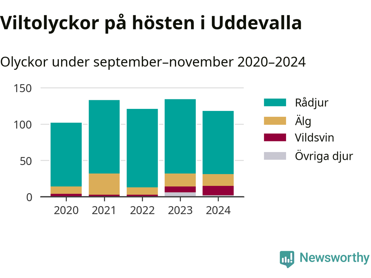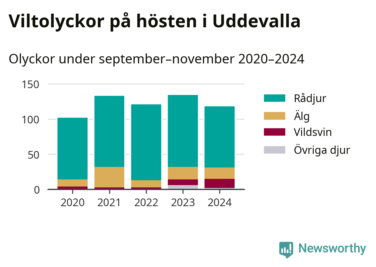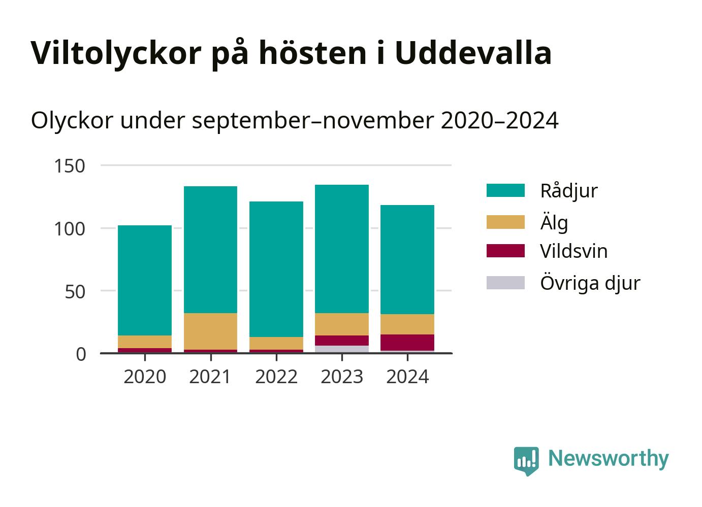 Under de senaste höstarna har antalet viltolyckor ökat i Sverige. Den höst med flest viltolyckor i Uddevalla hittills under 2020-talet var 2023, 134 olyckor. I fjol höst rapporterades totalt 118 olyckor.