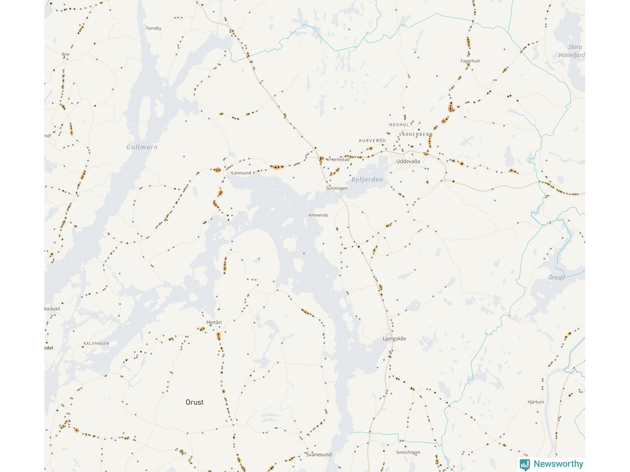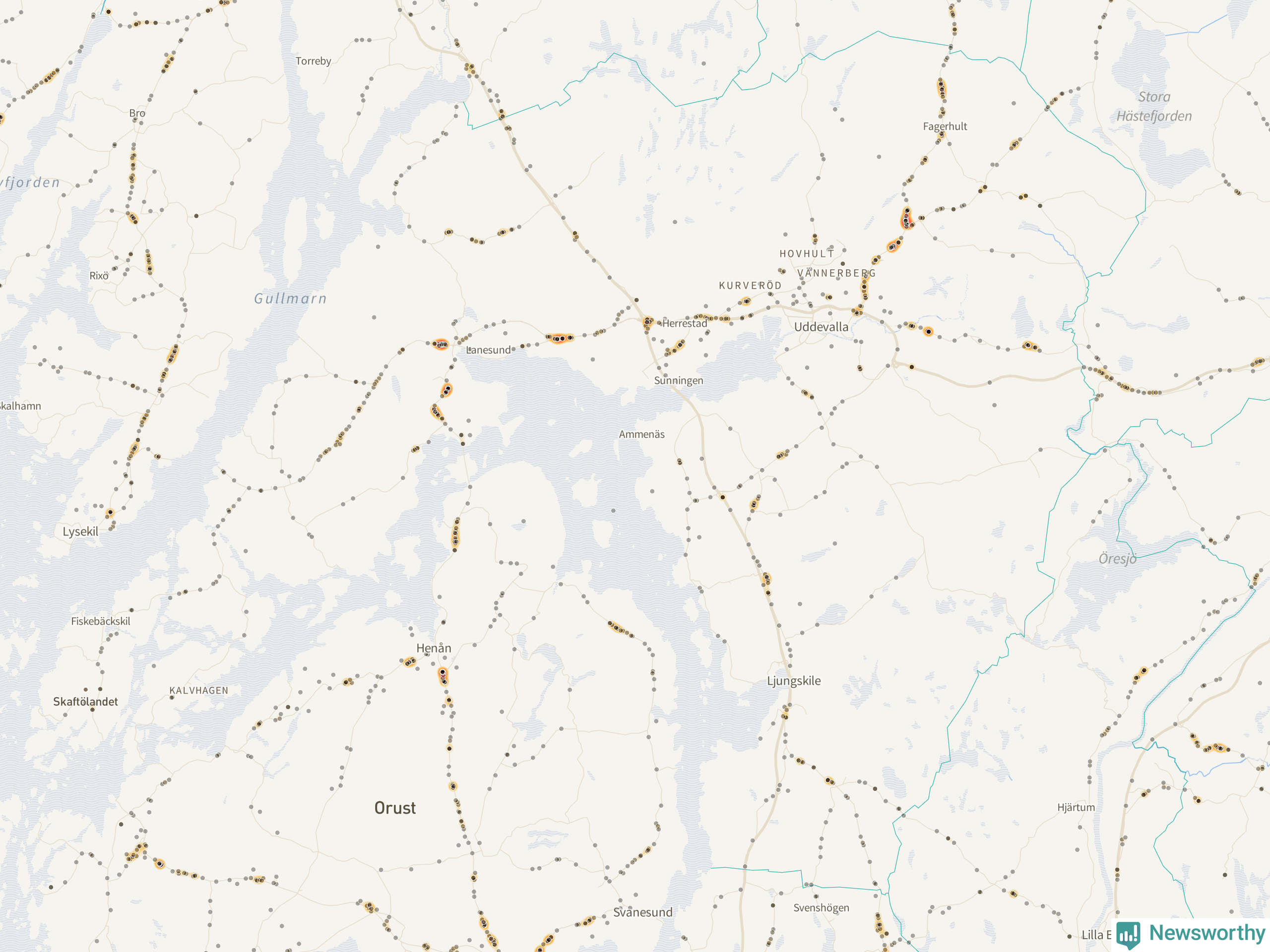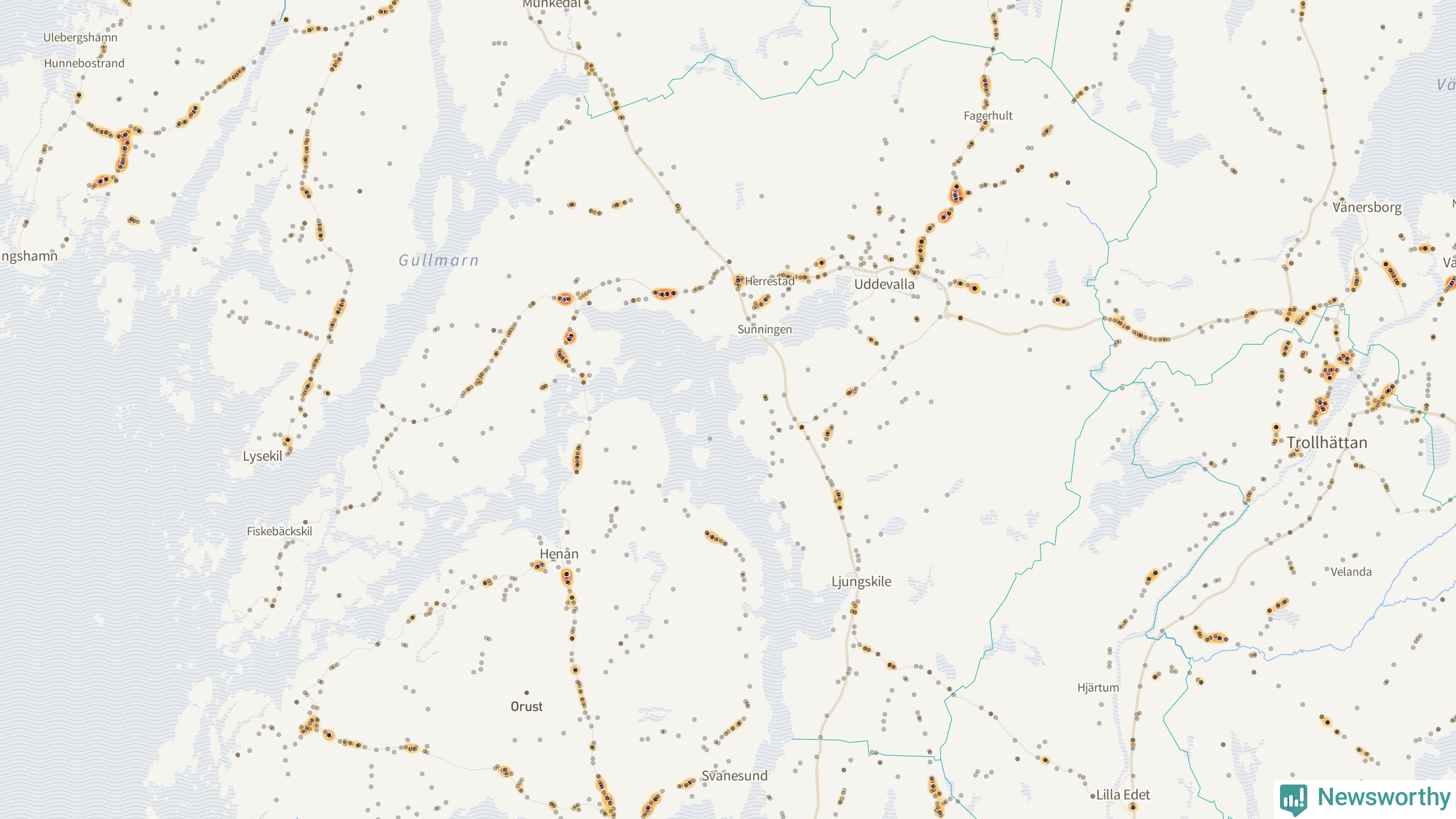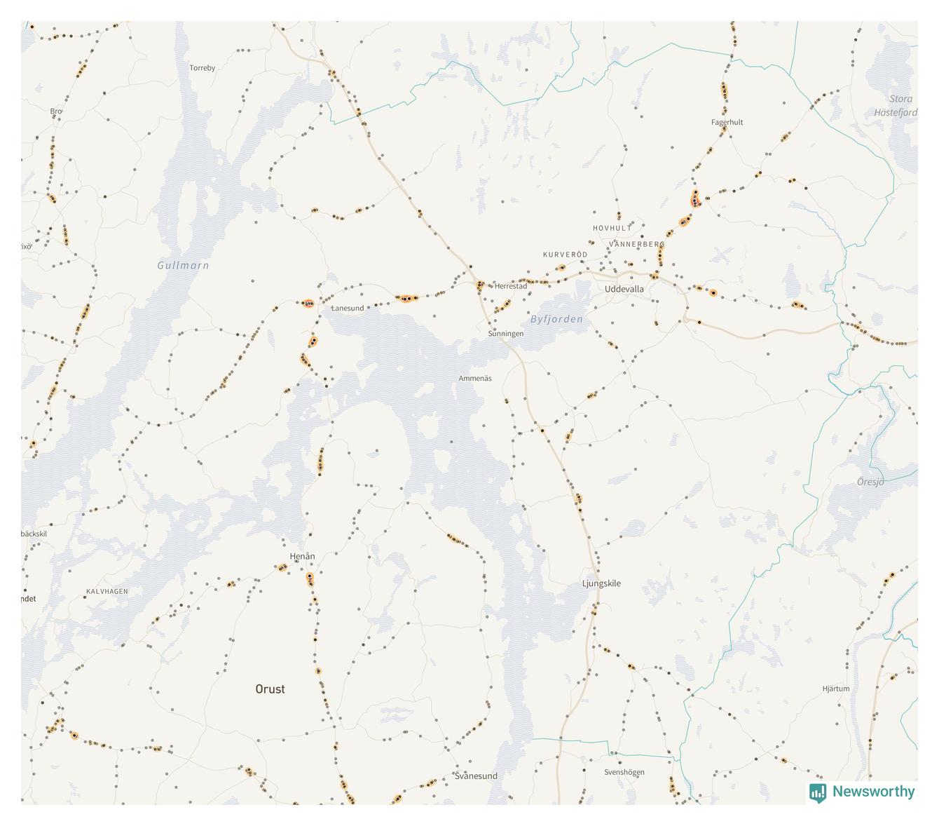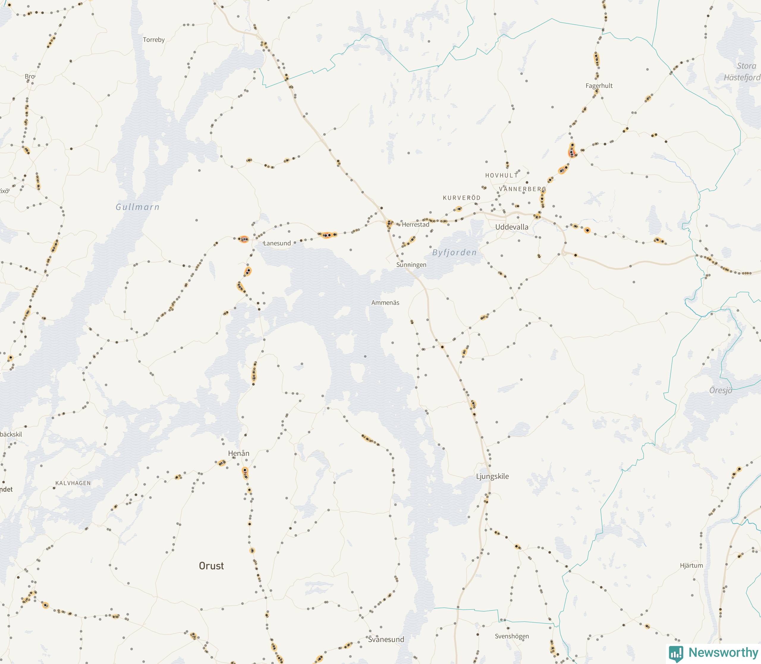 | Väg 680 (Uddevallavägen) | 25 | rådjur (23 olyckor) |