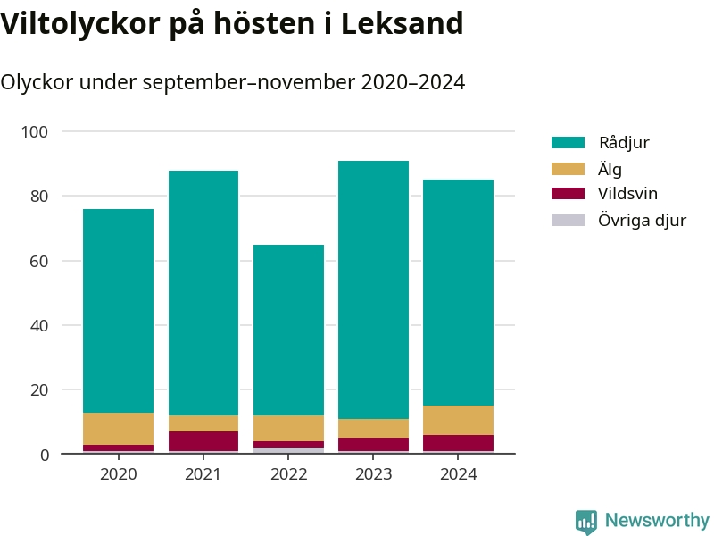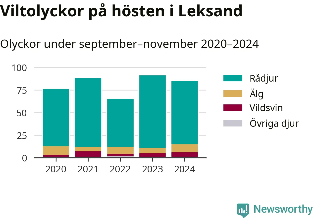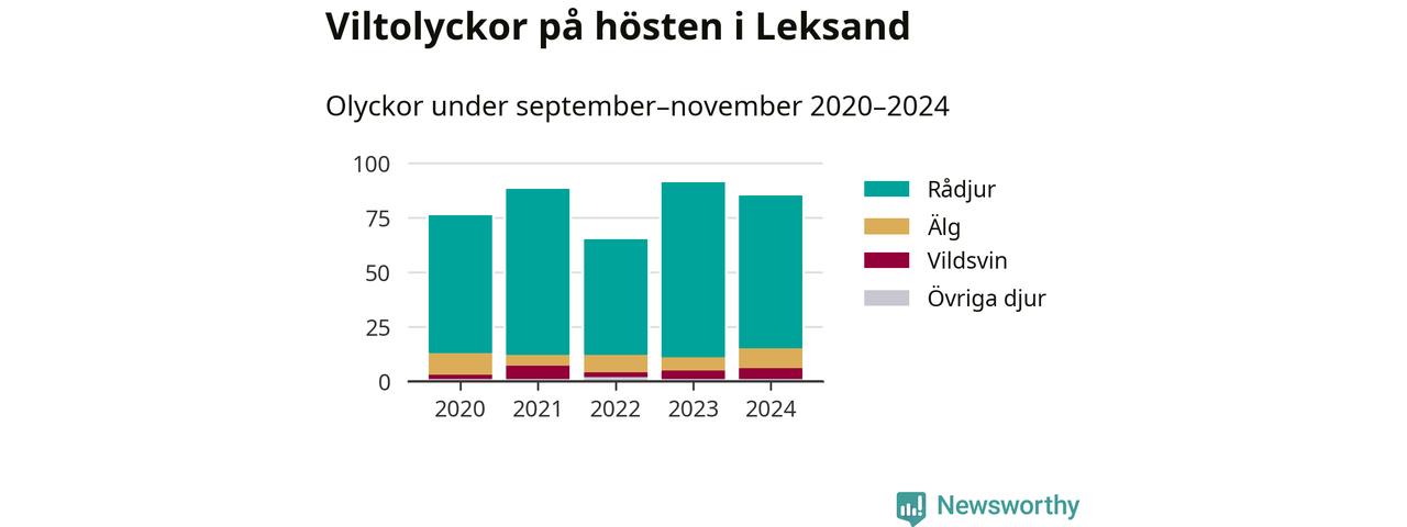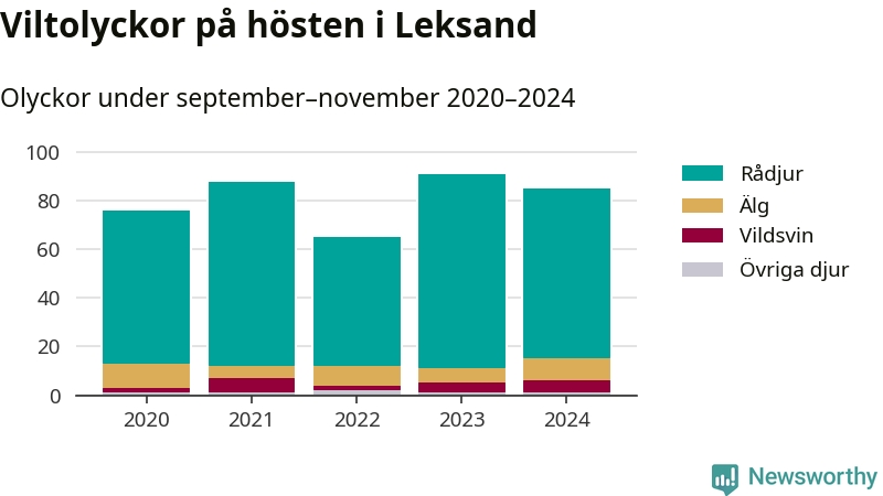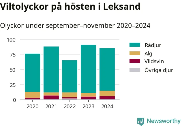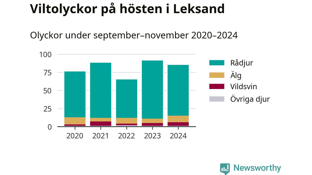 Under de senaste höstarna har antalet viltolyckor ökat i Sverige. Den höst med flest viltolyckor i Leksand hittills under 2020-talet var 2023, 91 olyckor. I fjol höst rapporterades totalt 85 olyckor.