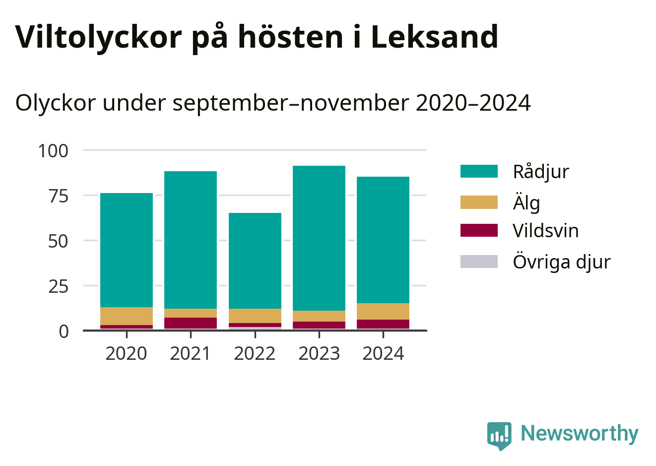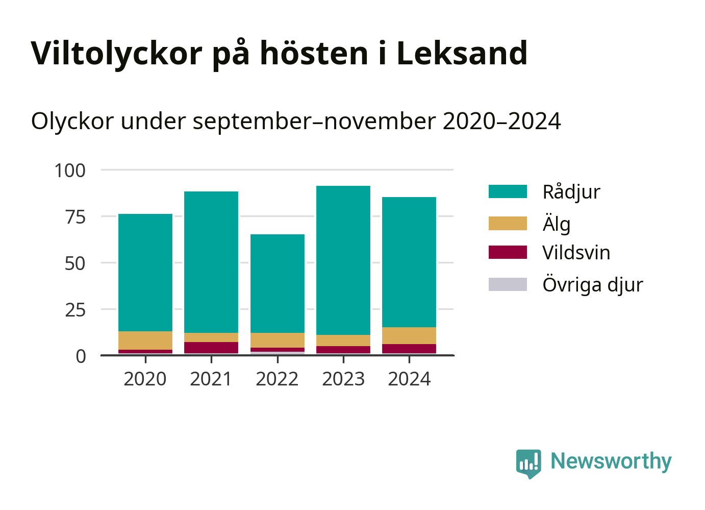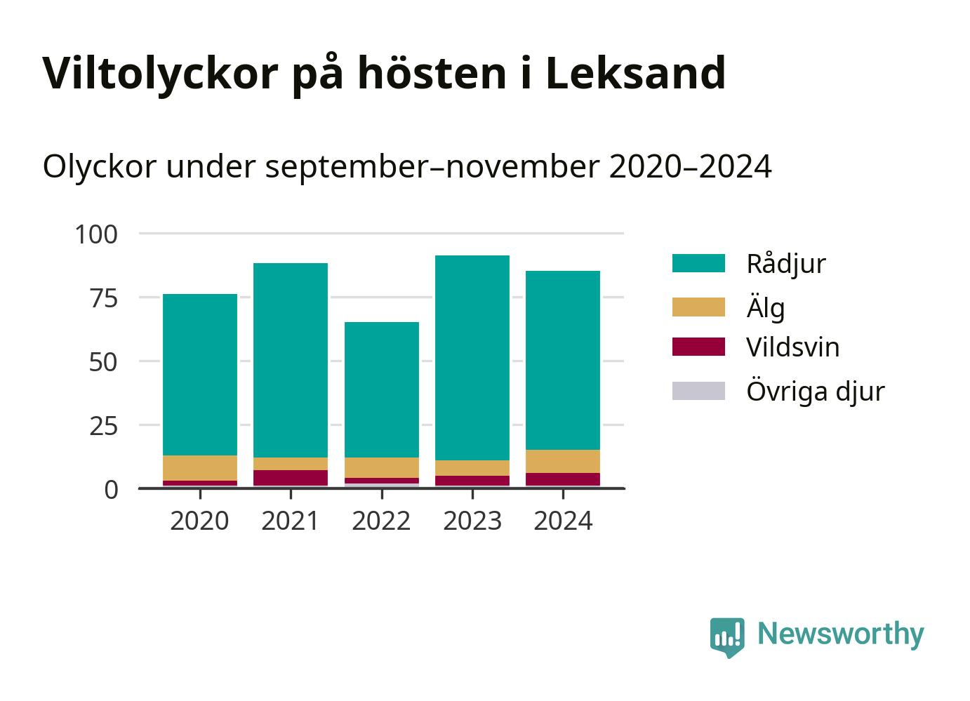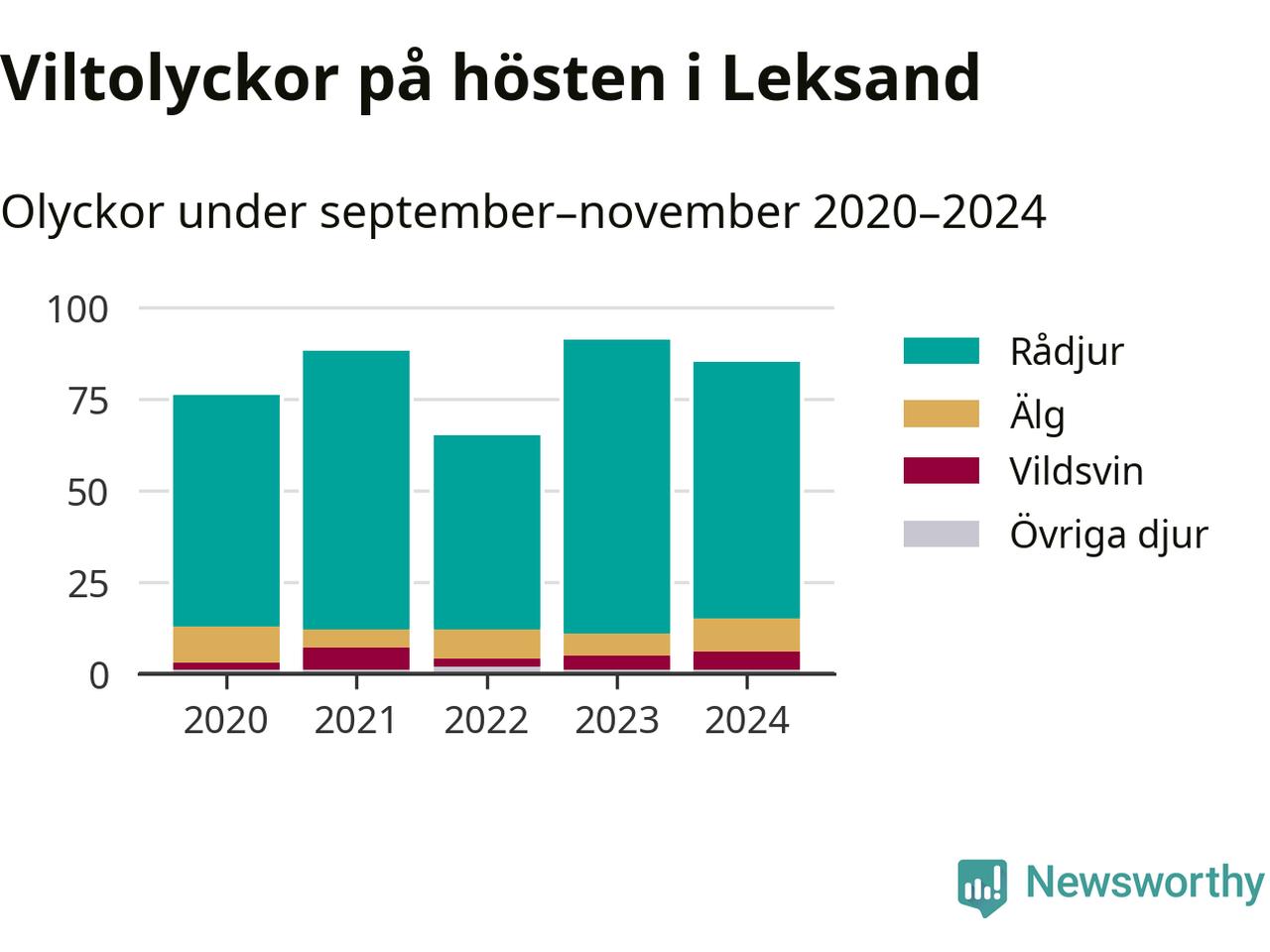 Under de senaste höstarna har antalet viltolyckor ökat i Sverige. Den höst med flest viltolyckor i Leksand hittills under 2020-talet var 2023, 91 olyckor. I fjol höst rapporterades totalt 85 olyckor.