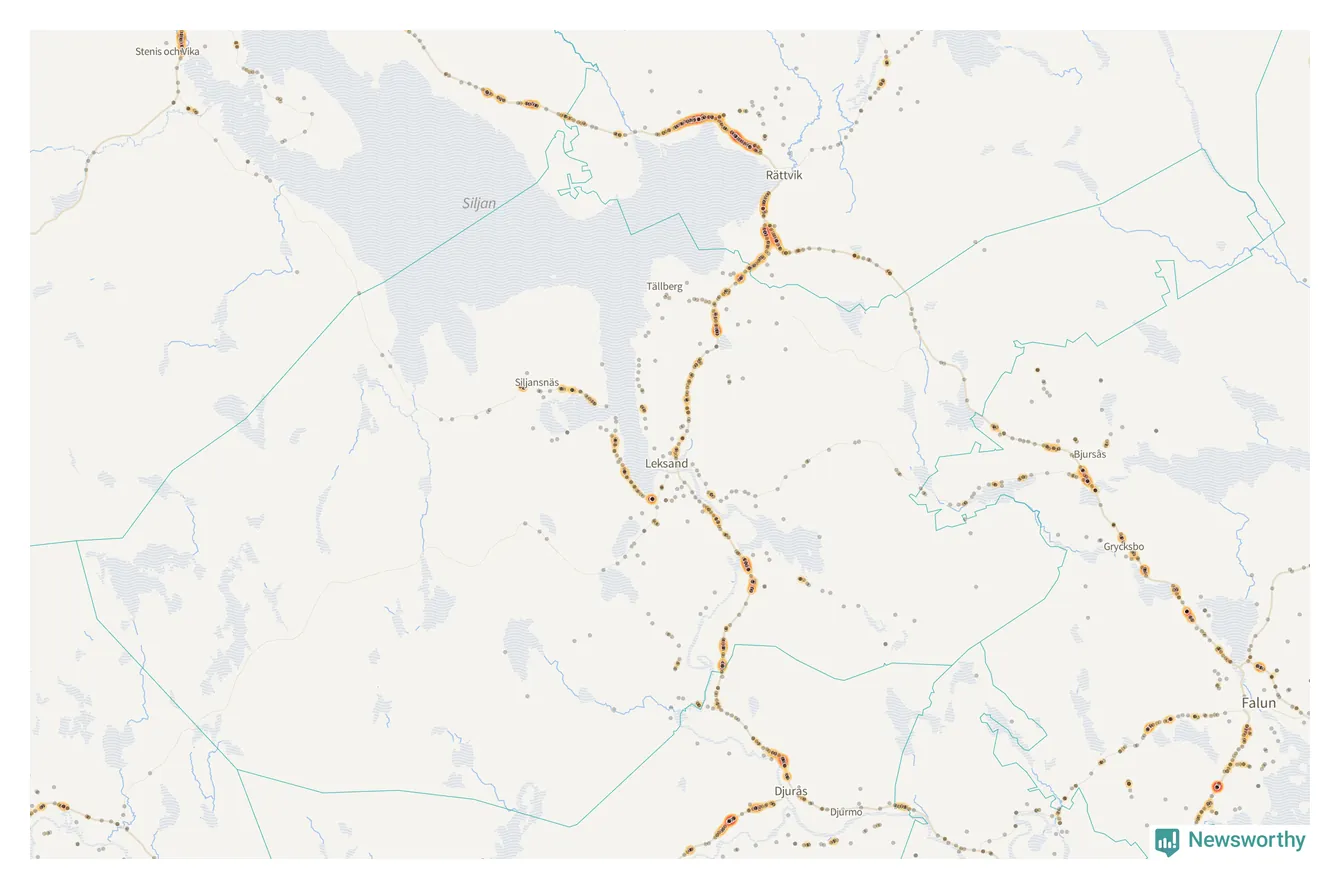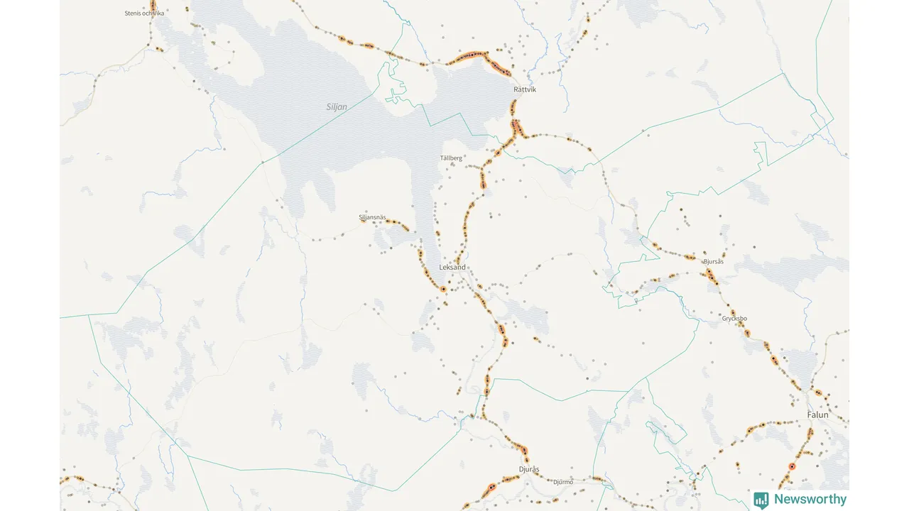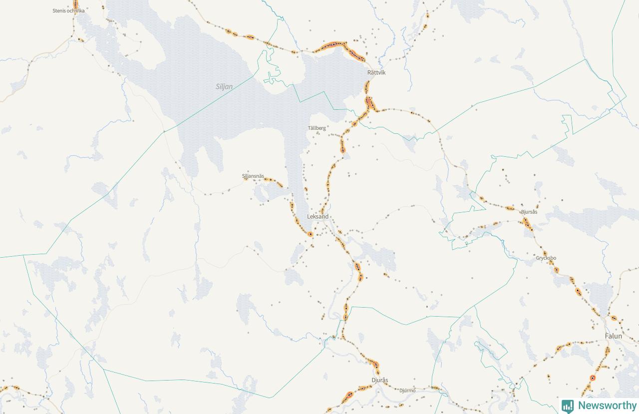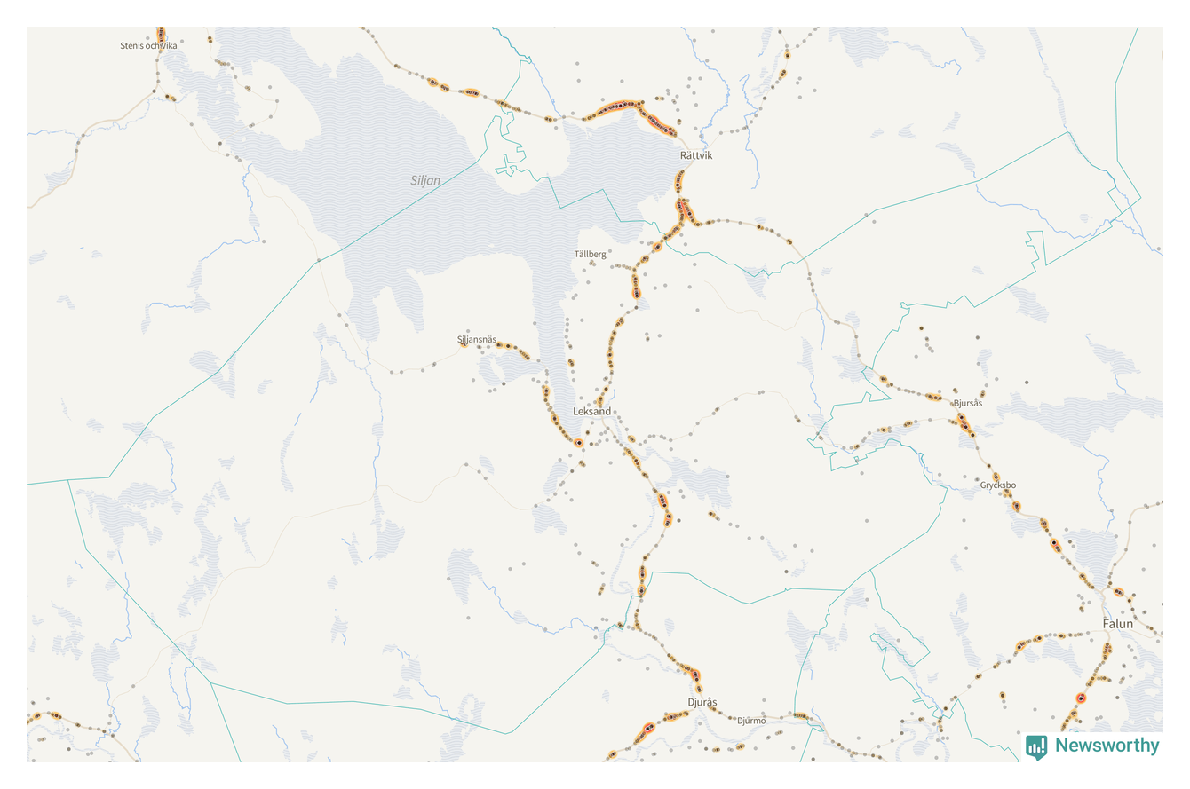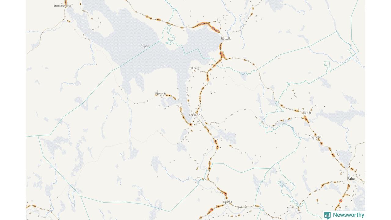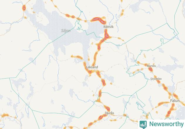 | Väg 938 (Gassarvet Moravägen, Tasbäck Moravägen, Västanvik Siljansnäsvägen, Grytnäs Siljansnäsvägen, Fornby Moravägen, Karlsarvet Siljansnäsvägen, Moravägen, Sundsnäs Siljansnäsvägen, Lundbjörken Moravägen) | 59 | rådjur (55 olyckor) |