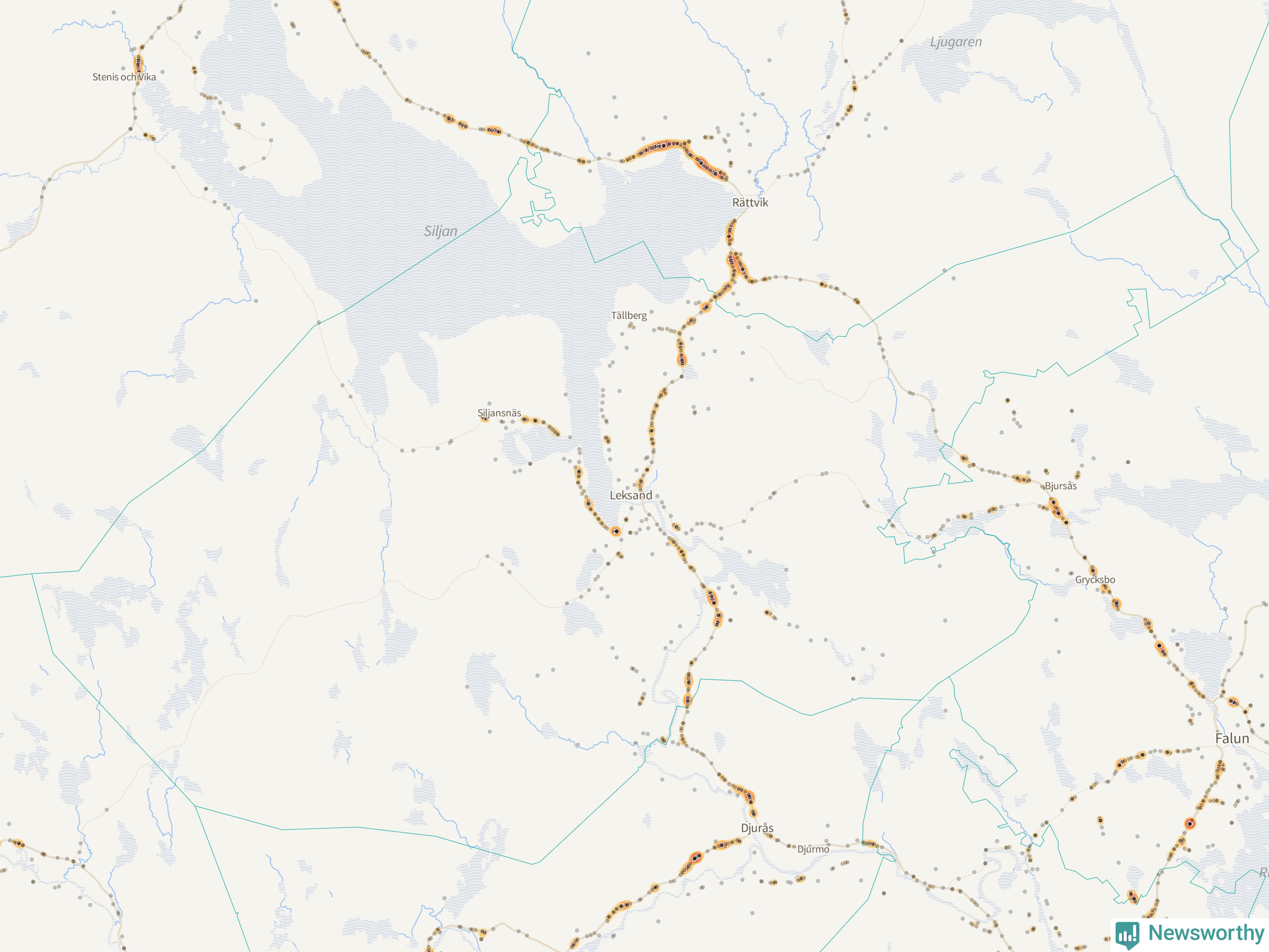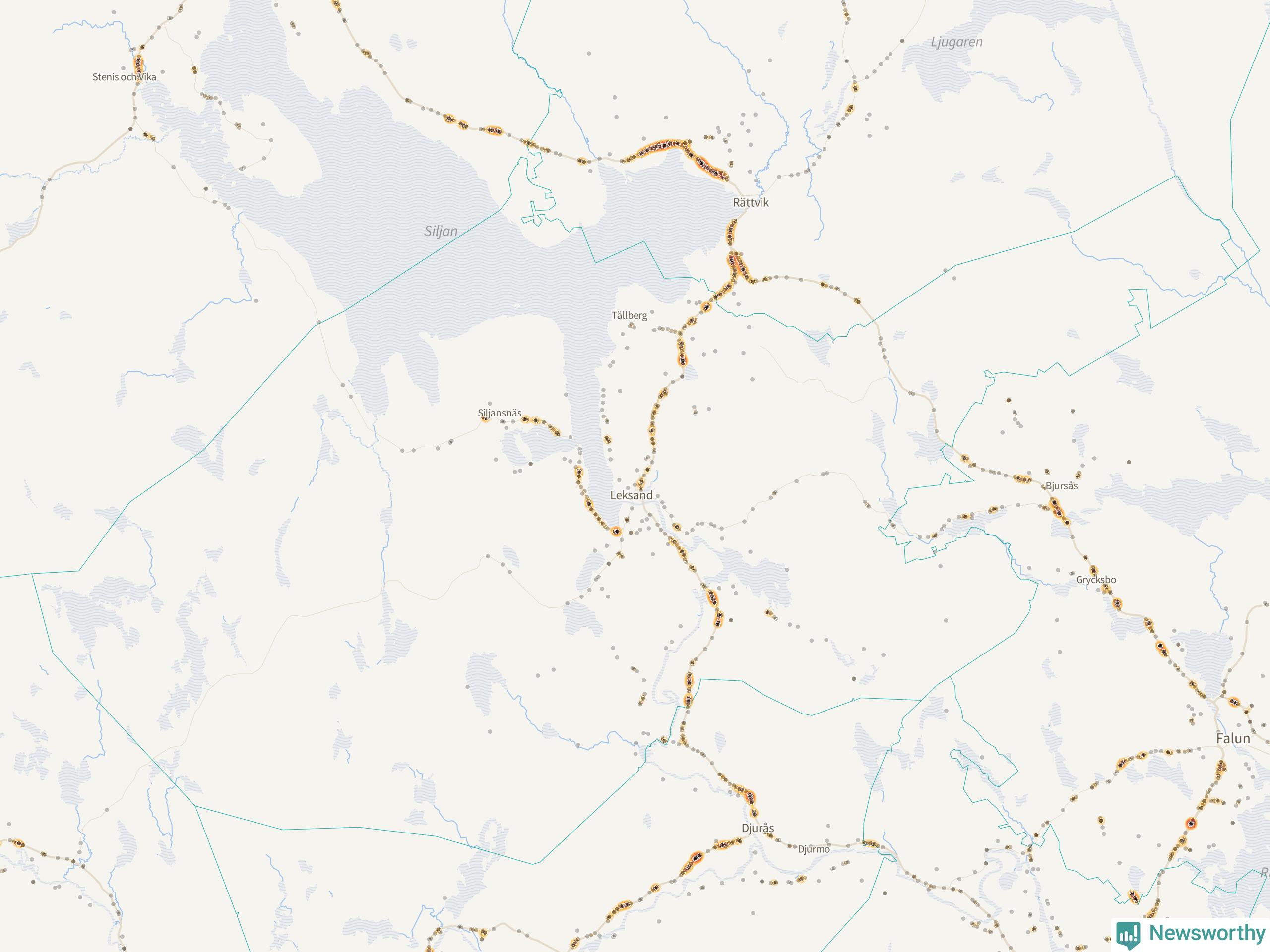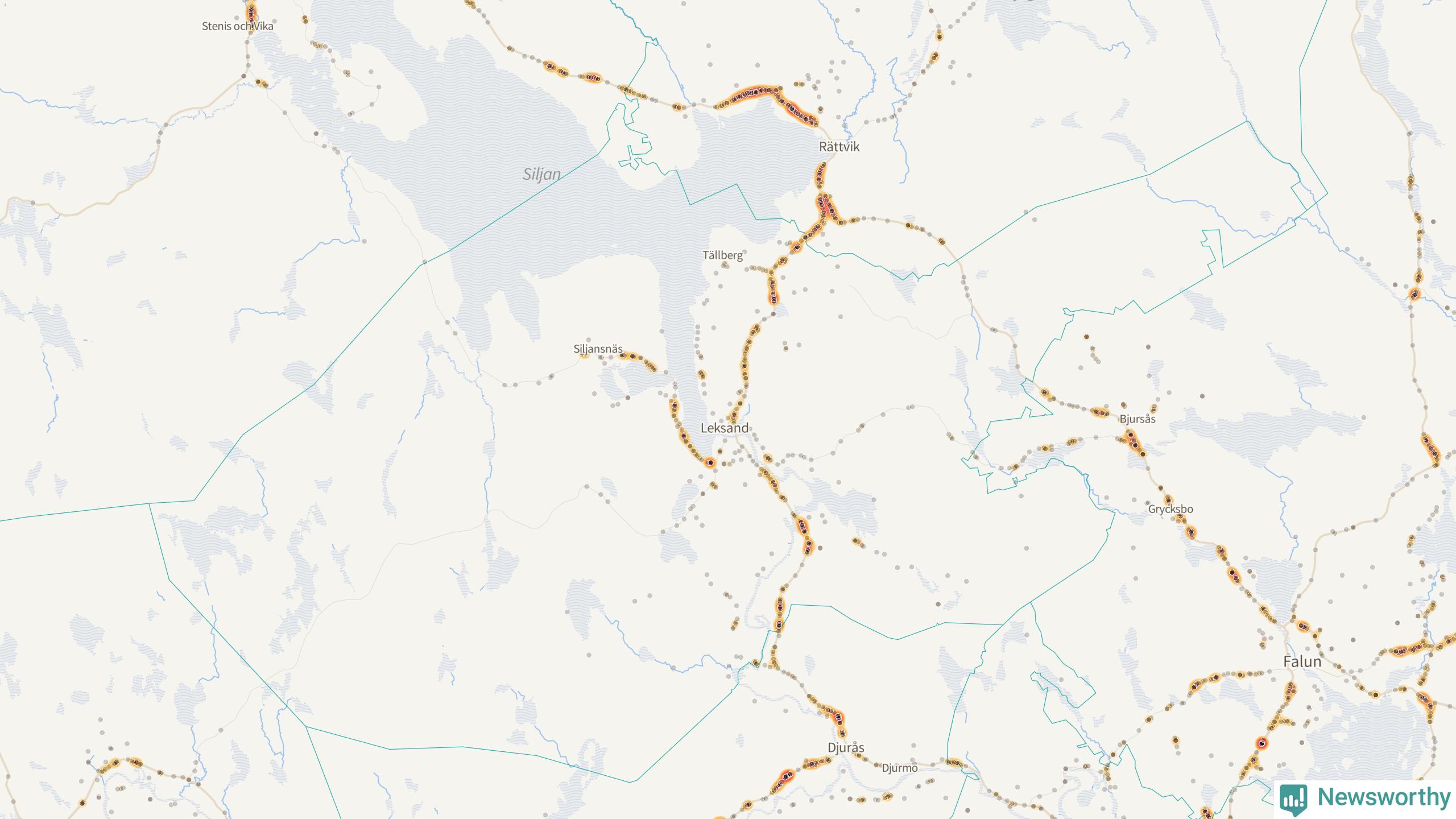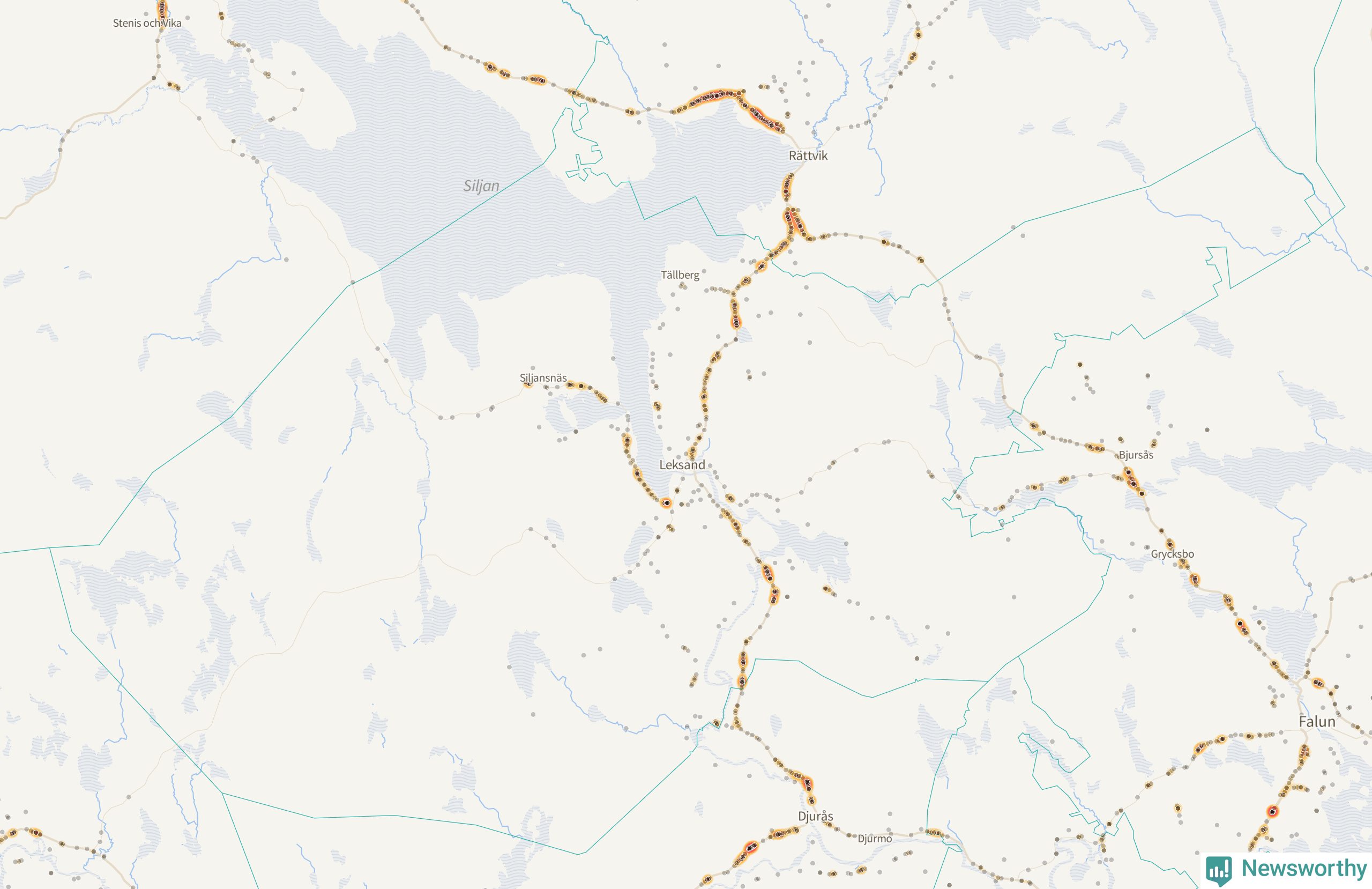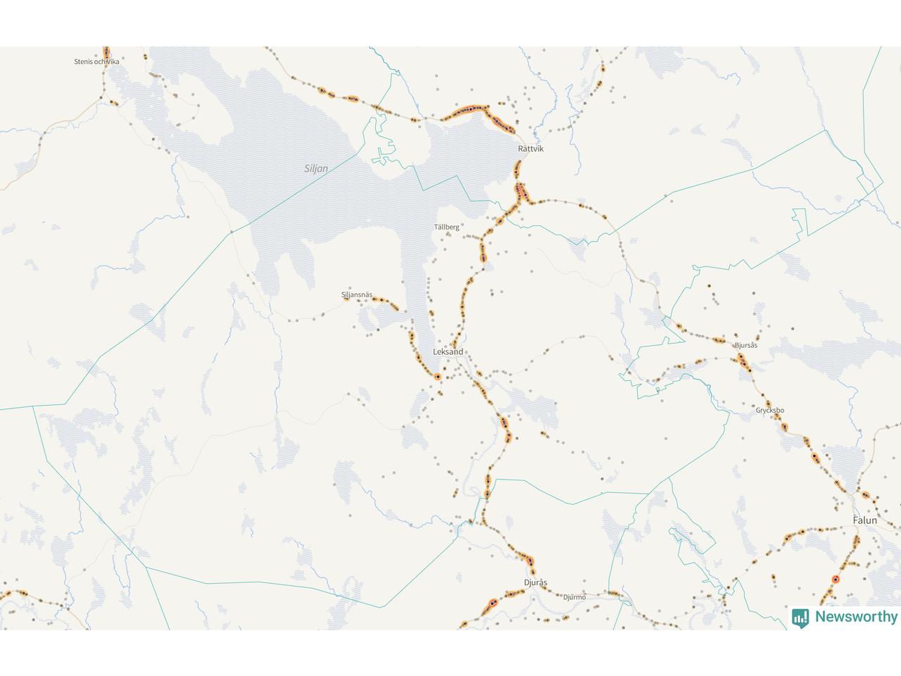 | Väg 938 (Gassarvet Moravägen, Tasbäck Moravägen, Västanvik Siljansnäsvägen, Grytnäs Siljansnäsvägen, Fornby Moravägen, Karlsarvet Siljansnäsvägen, Moravägen, Sundsnäs Siljansnäsvägen, Lundbjörken Moravägen) | 59 | rådjur (55 olyckor) |