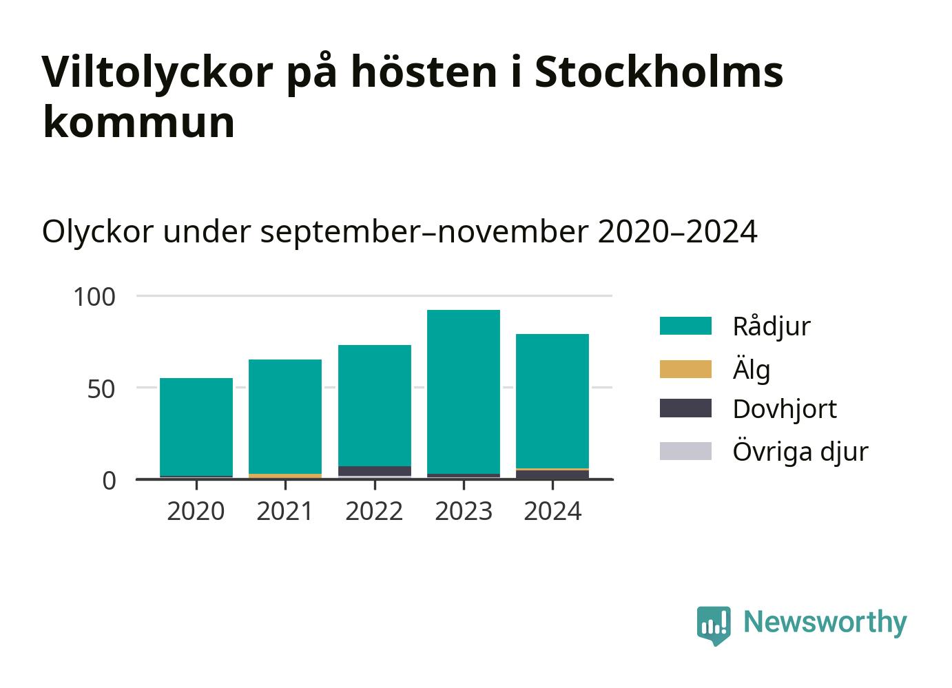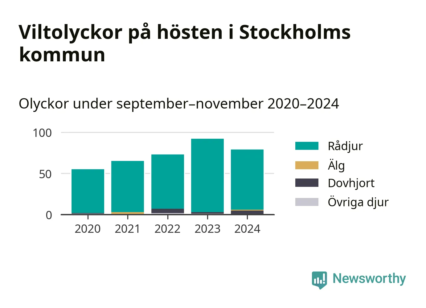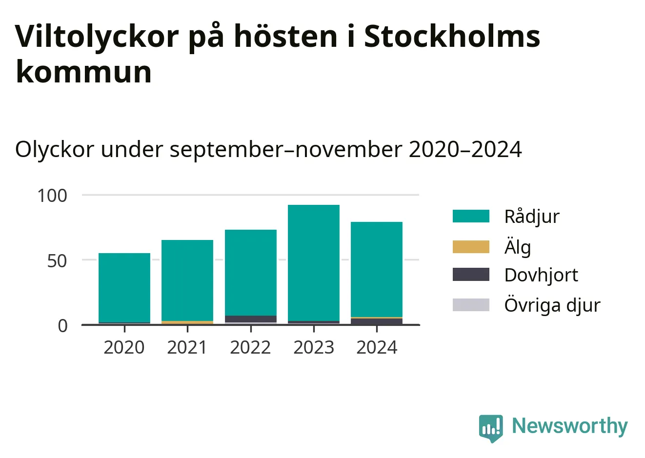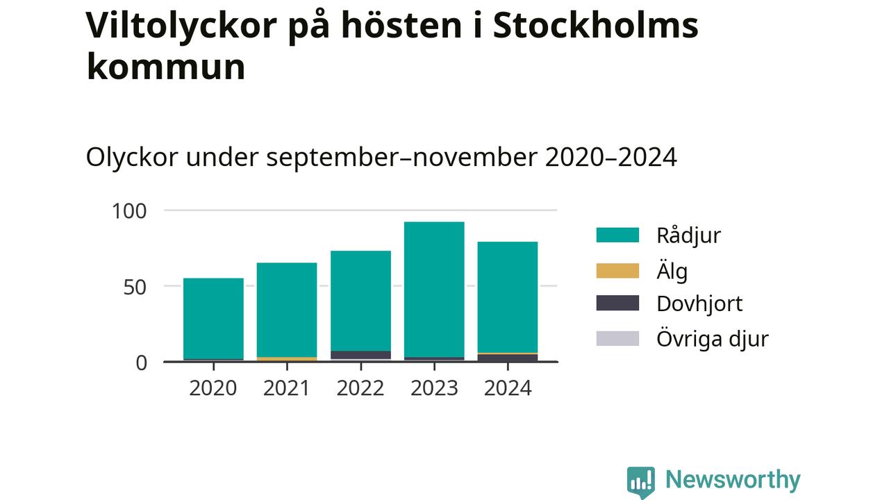 Under de senaste höstarna har antalet viltolyckor ökat i Sverige. Den höst med flest viltolyckor i Stockholms kommun hittills under 2020-talet var 2023, 92 olyckor. I fjol höst rapporterades totalt 79 olyckor.
