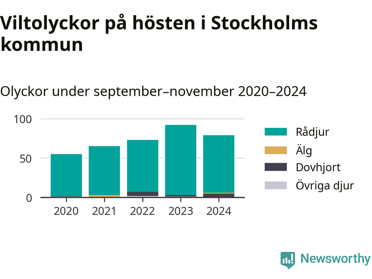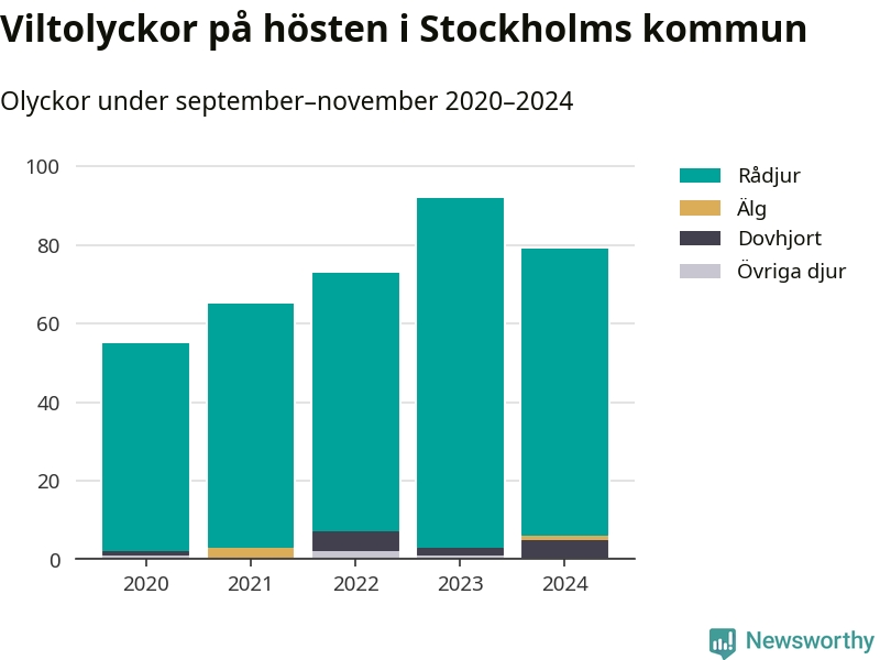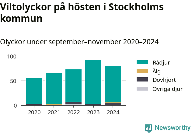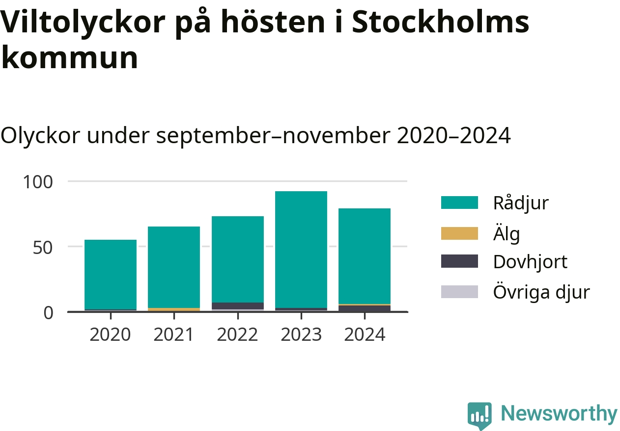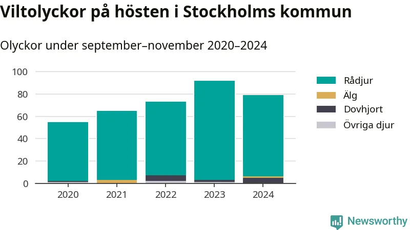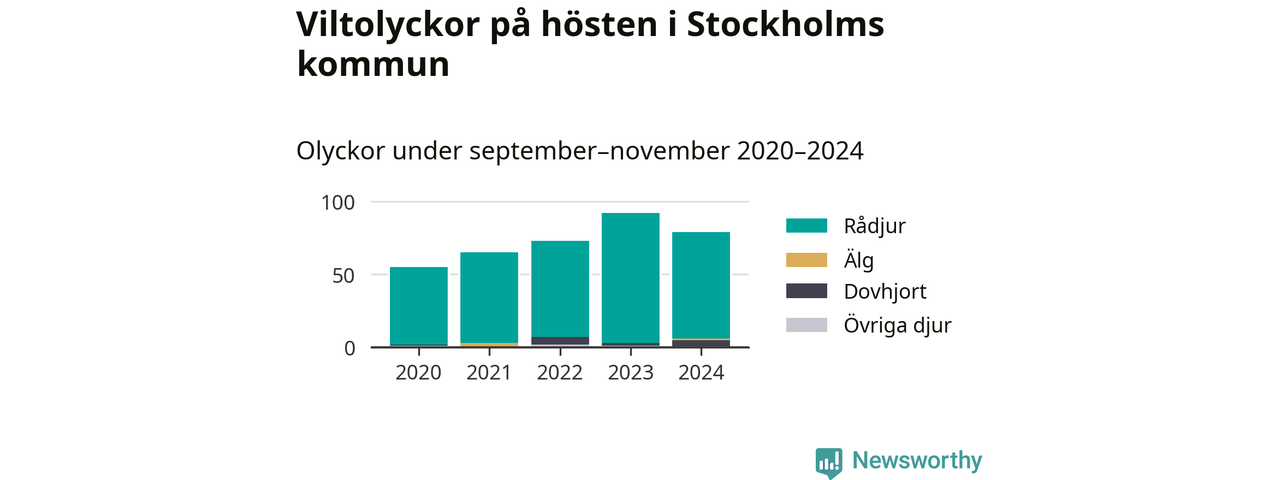 Under de senaste höstarna har antalet viltolyckor ökat i Sverige. Den höst med flest viltolyckor i Stockholms kommun hittills under 2020-talet var 2023, 92 olyckor. I fjol höst rapporterades totalt 79 olyckor.