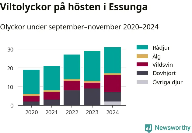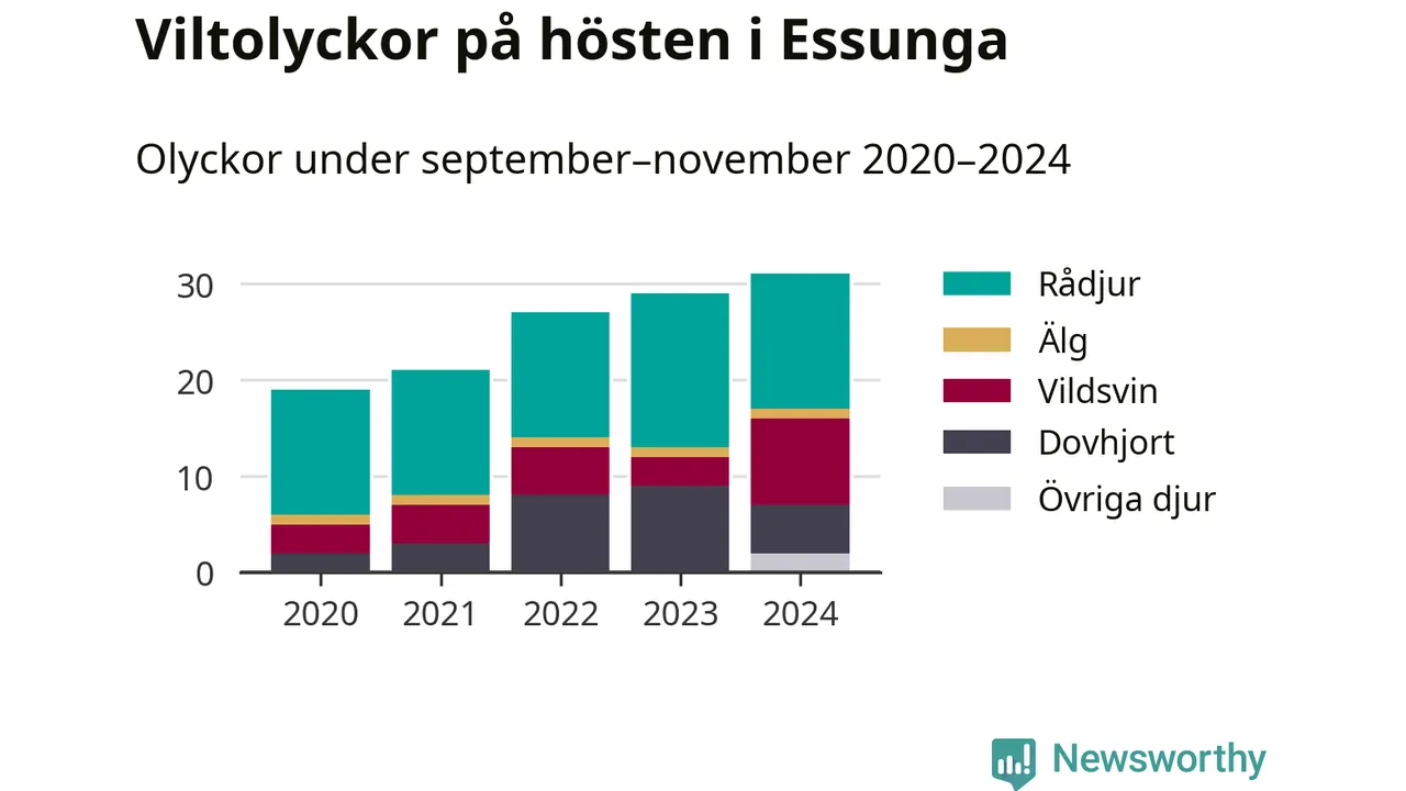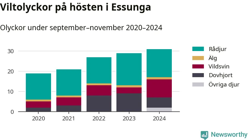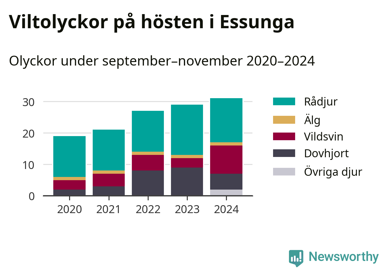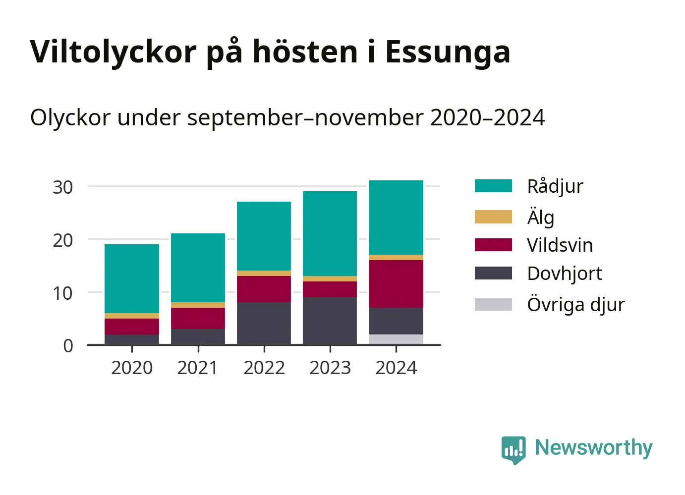 Under de senaste höstarna har antalet viltolyckor ökat i Sverige. Så också i Essunga, där antalet viltolyckor stadigt blivit fler – från 19 hösten 2020 till 31 olyckor i fjol.
