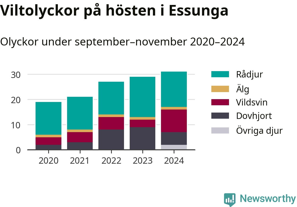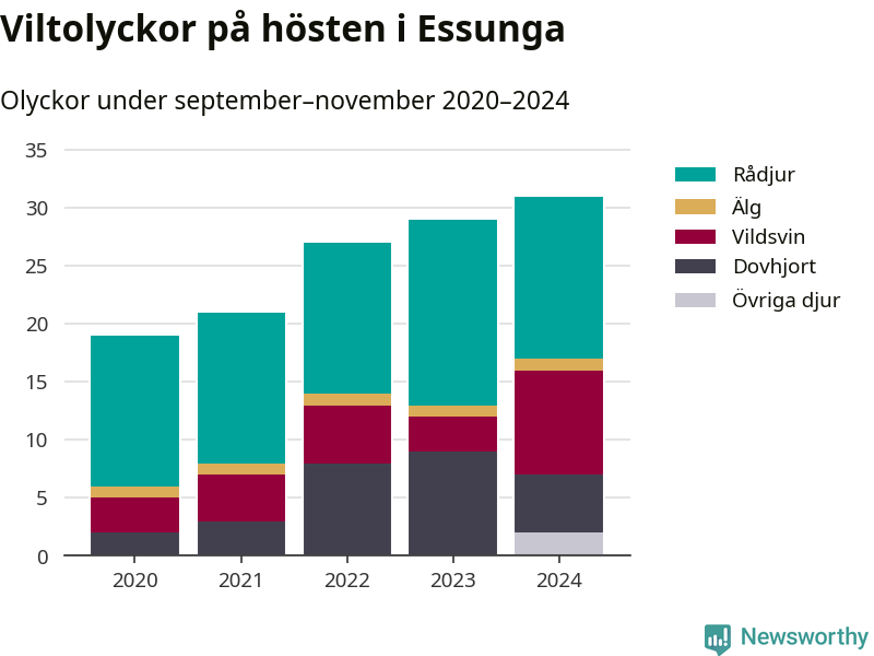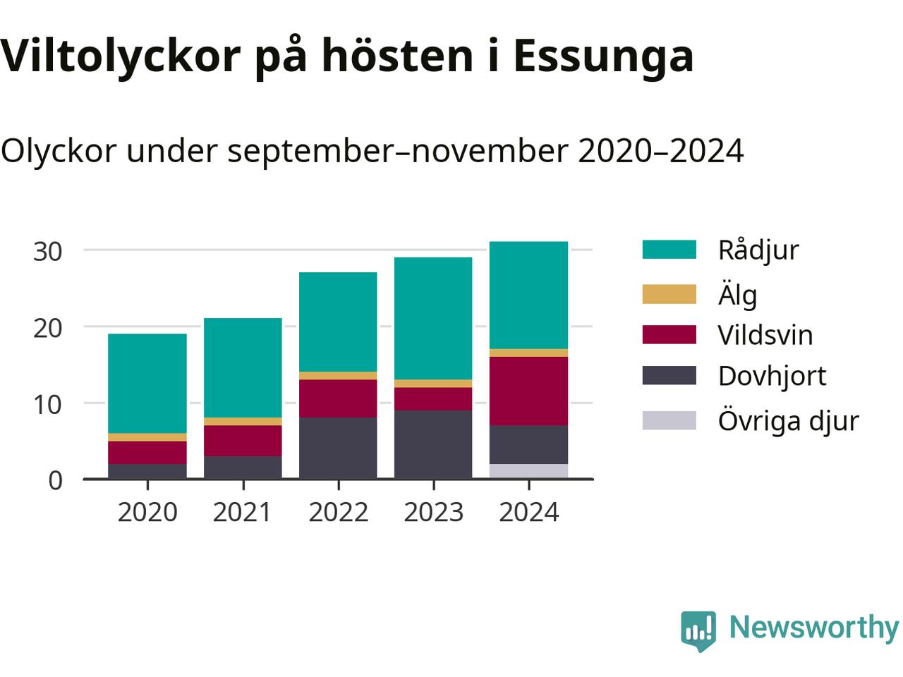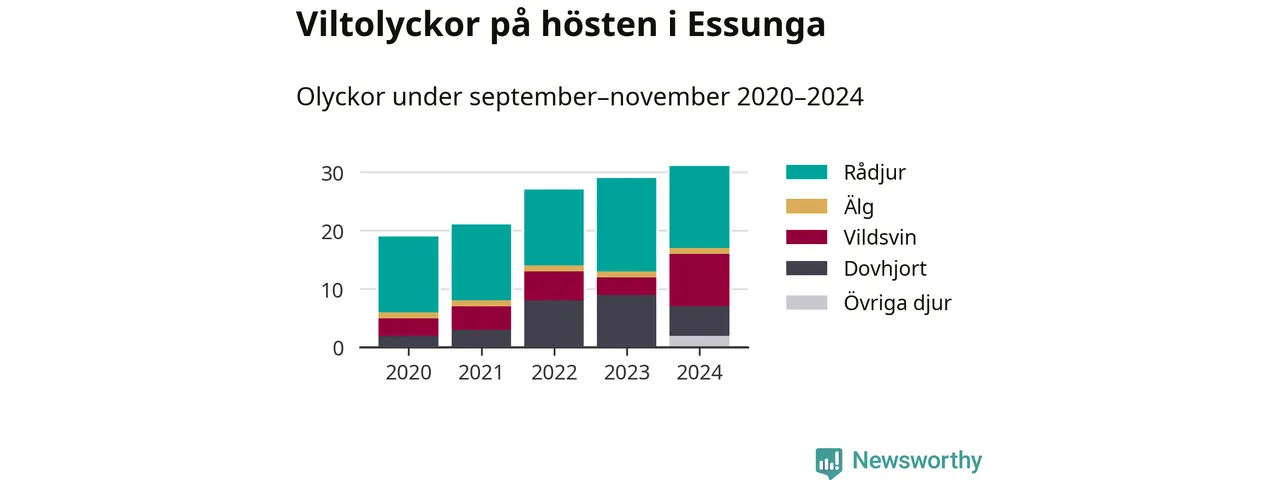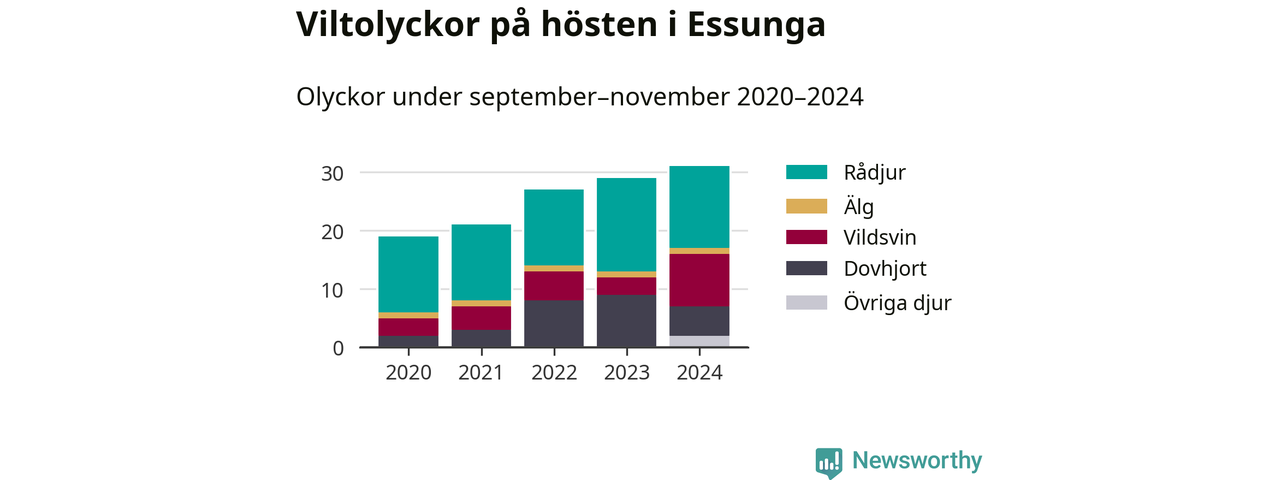 Under de senaste höstarna har antalet viltolyckor ökat i Sverige. Så också i Essunga, där antalet viltolyckor stadigt blivit fler – från 19 hösten 2020 till 31 olyckor i fjol.