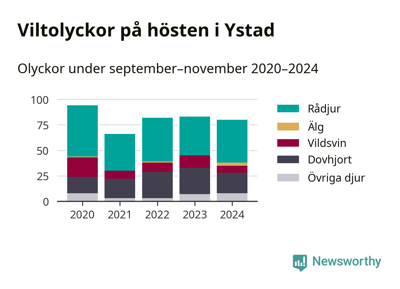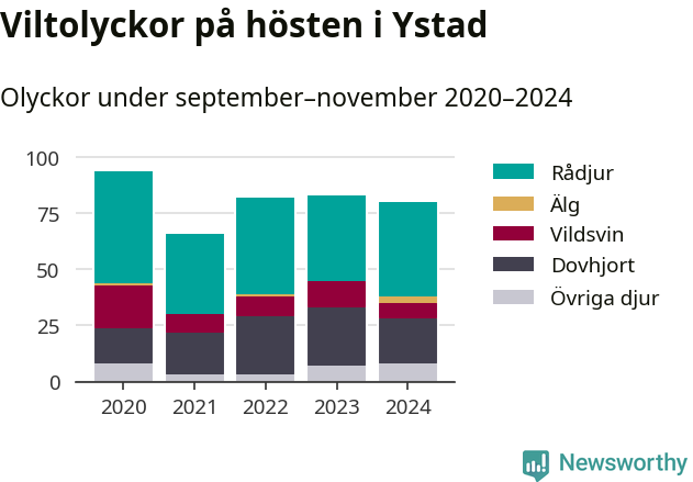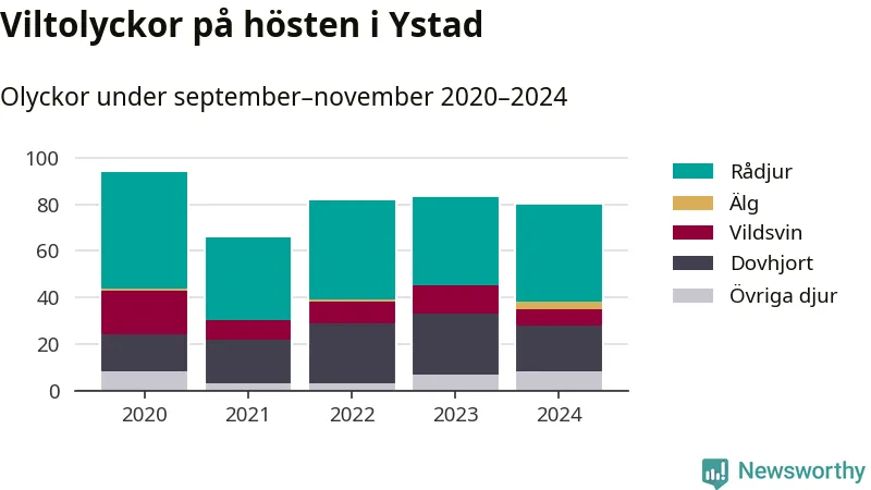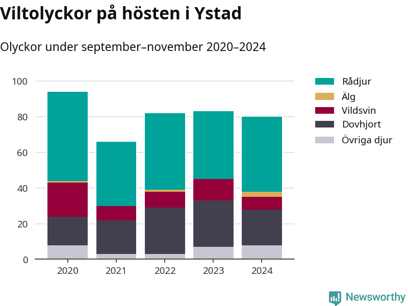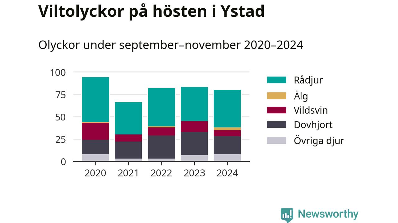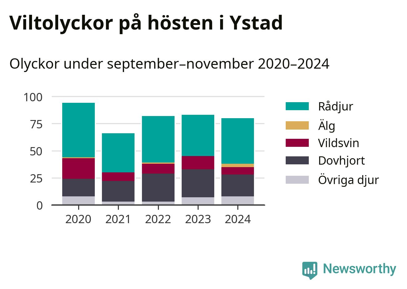 Under de senaste höstarna har antalet viltolyckor ökat i Sverige. Den höst med flest viltolyckor i Ystad hittills under 2020-talet var 2020, 94 olyckor. I fjol höst rapporterades totalt 80 olyckor.
