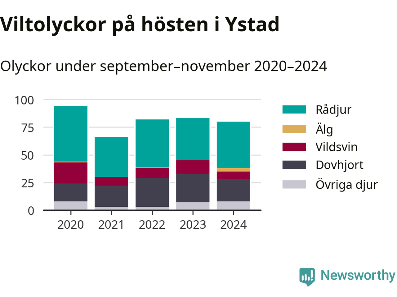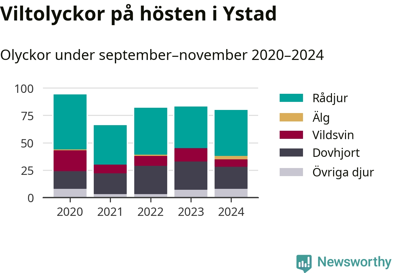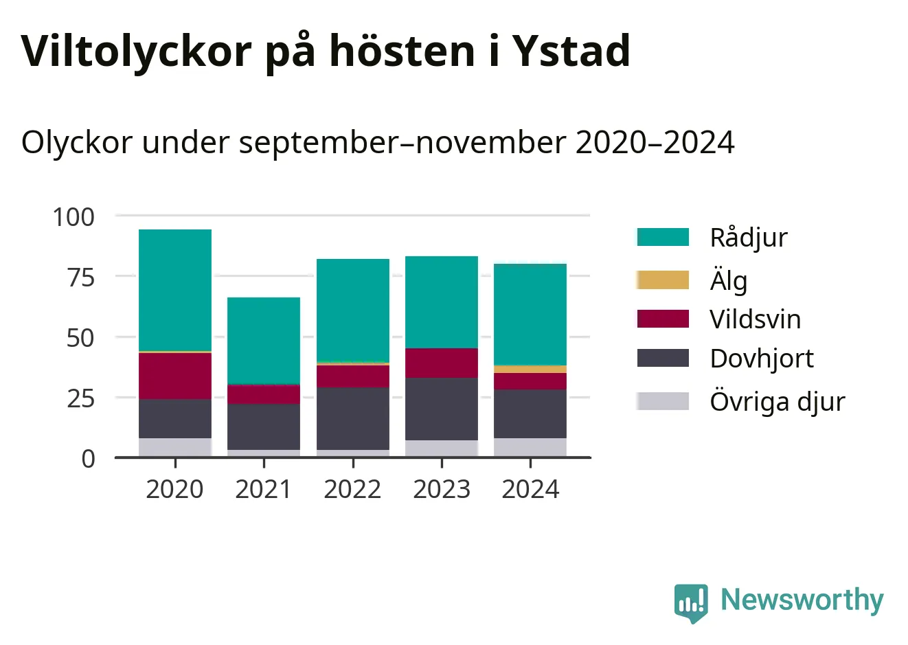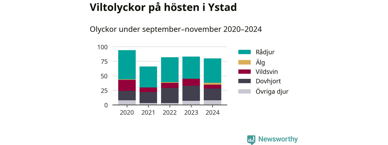 Under de senaste höstarna har antalet viltolyckor ökat i Sverige. Den höst med flest viltolyckor i Ystad hittills under 2020-talet var 2020, 94 olyckor. I fjol höst rapporterades totalt 80 olyckor.