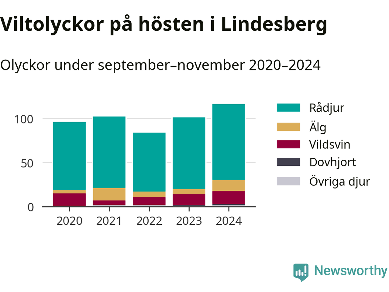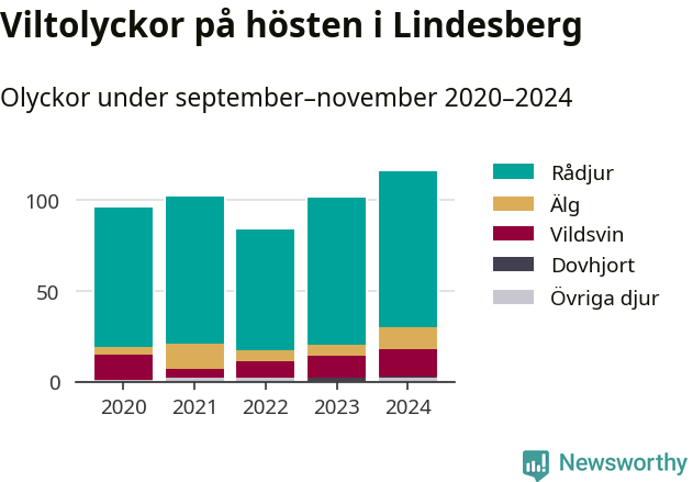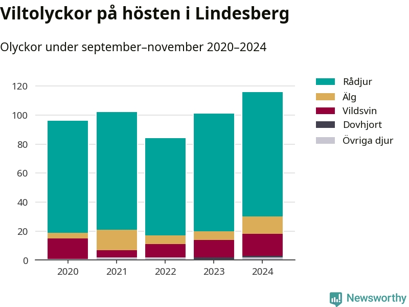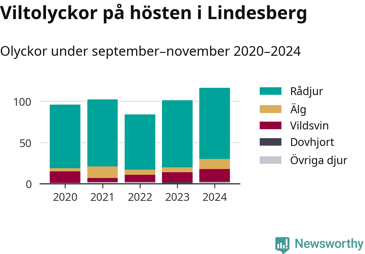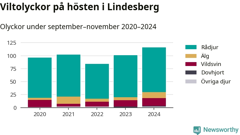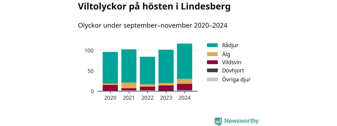Viltolyckor i Lindesberg 2020–2024 uppdelat på viltslag