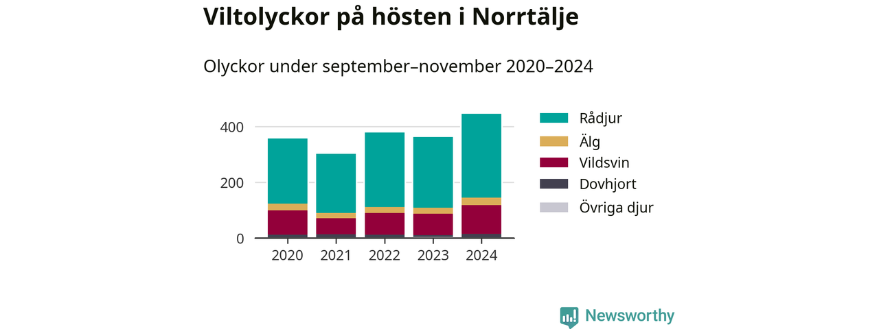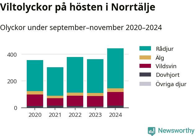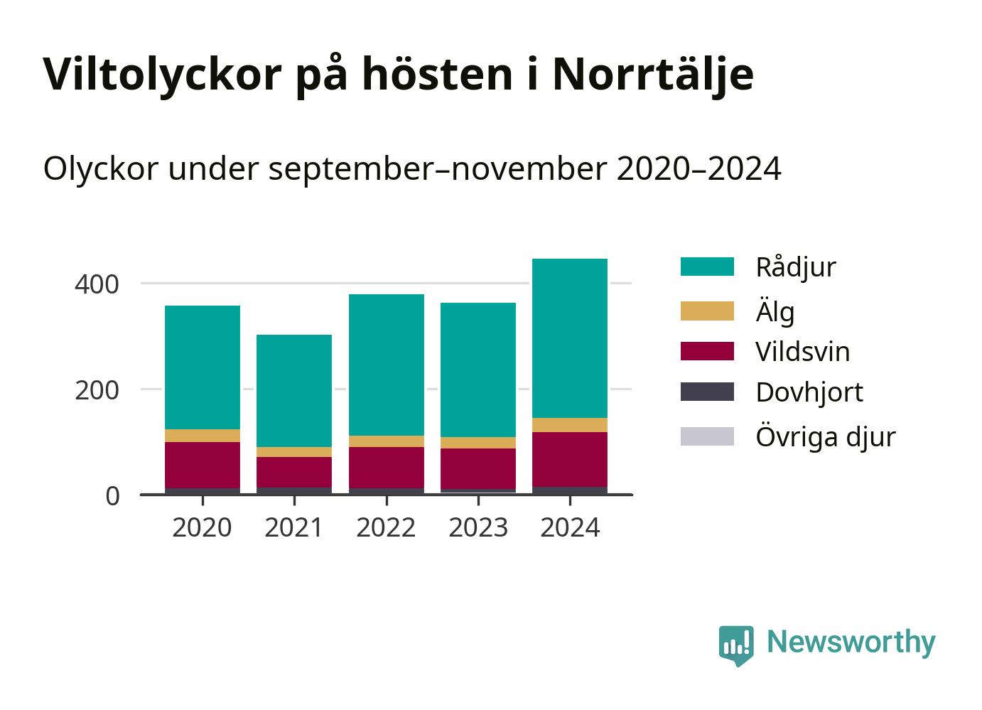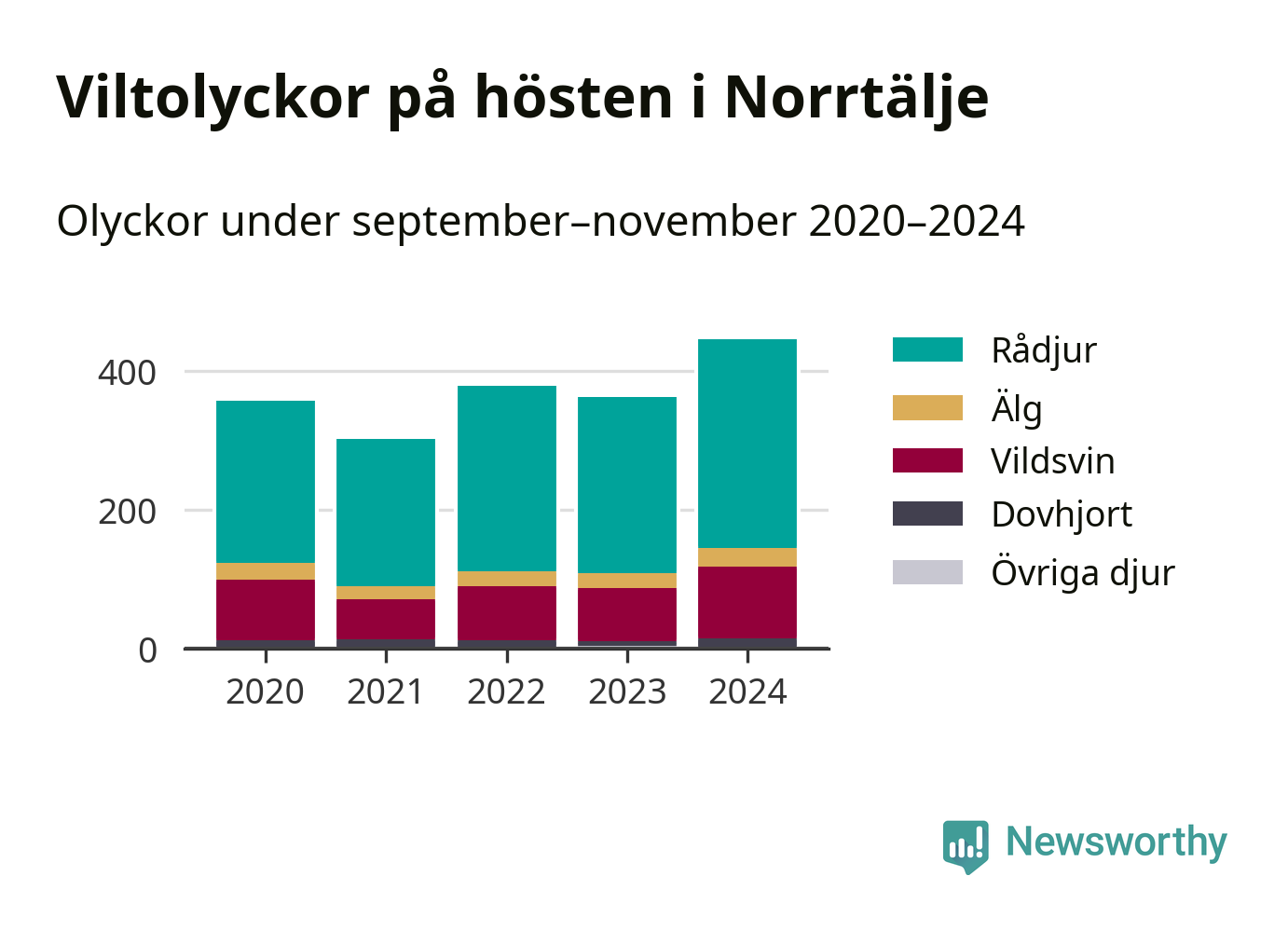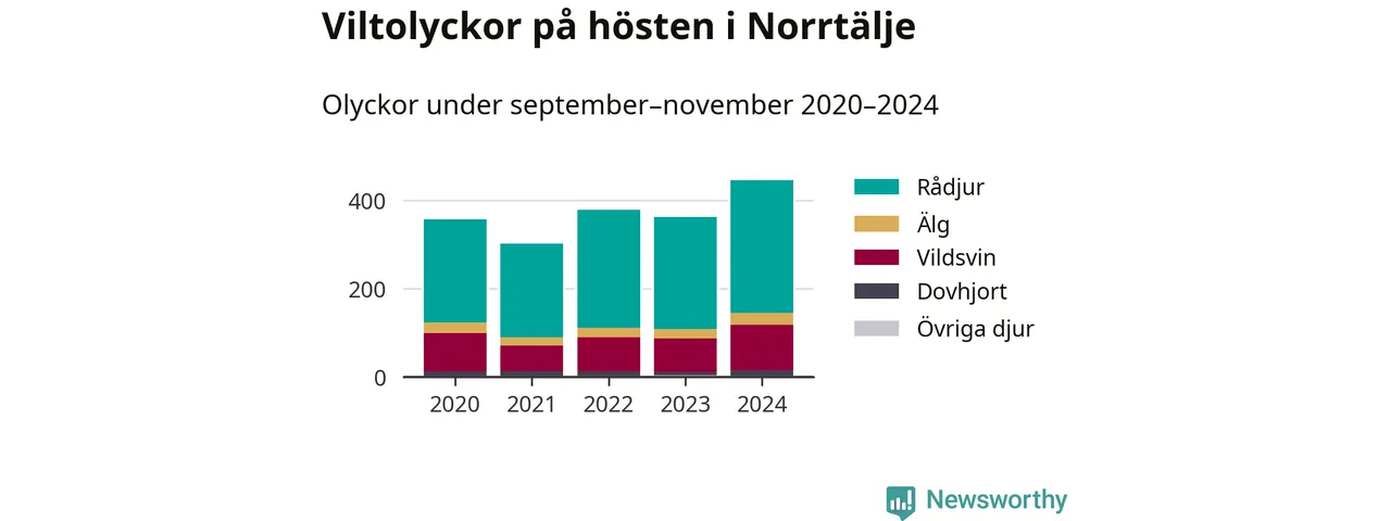Viltolyckor i Norrtälje 2020–2024 uppdelat på viltslag
