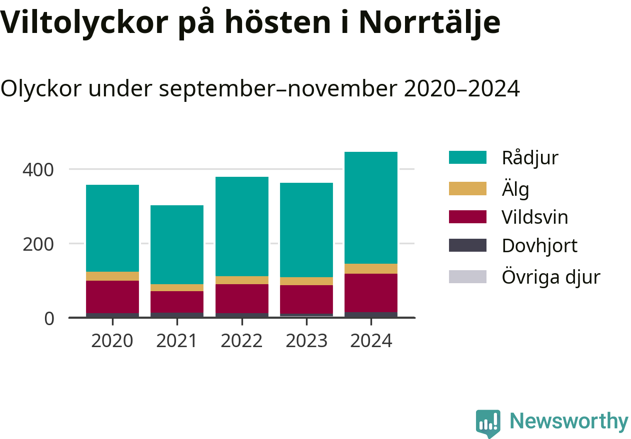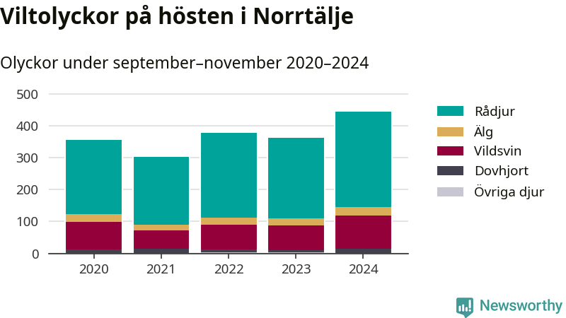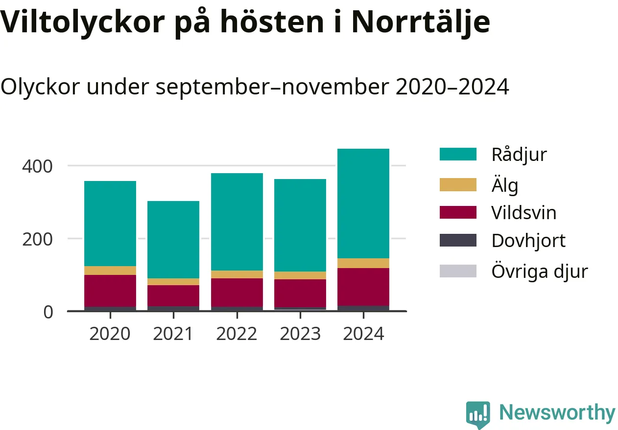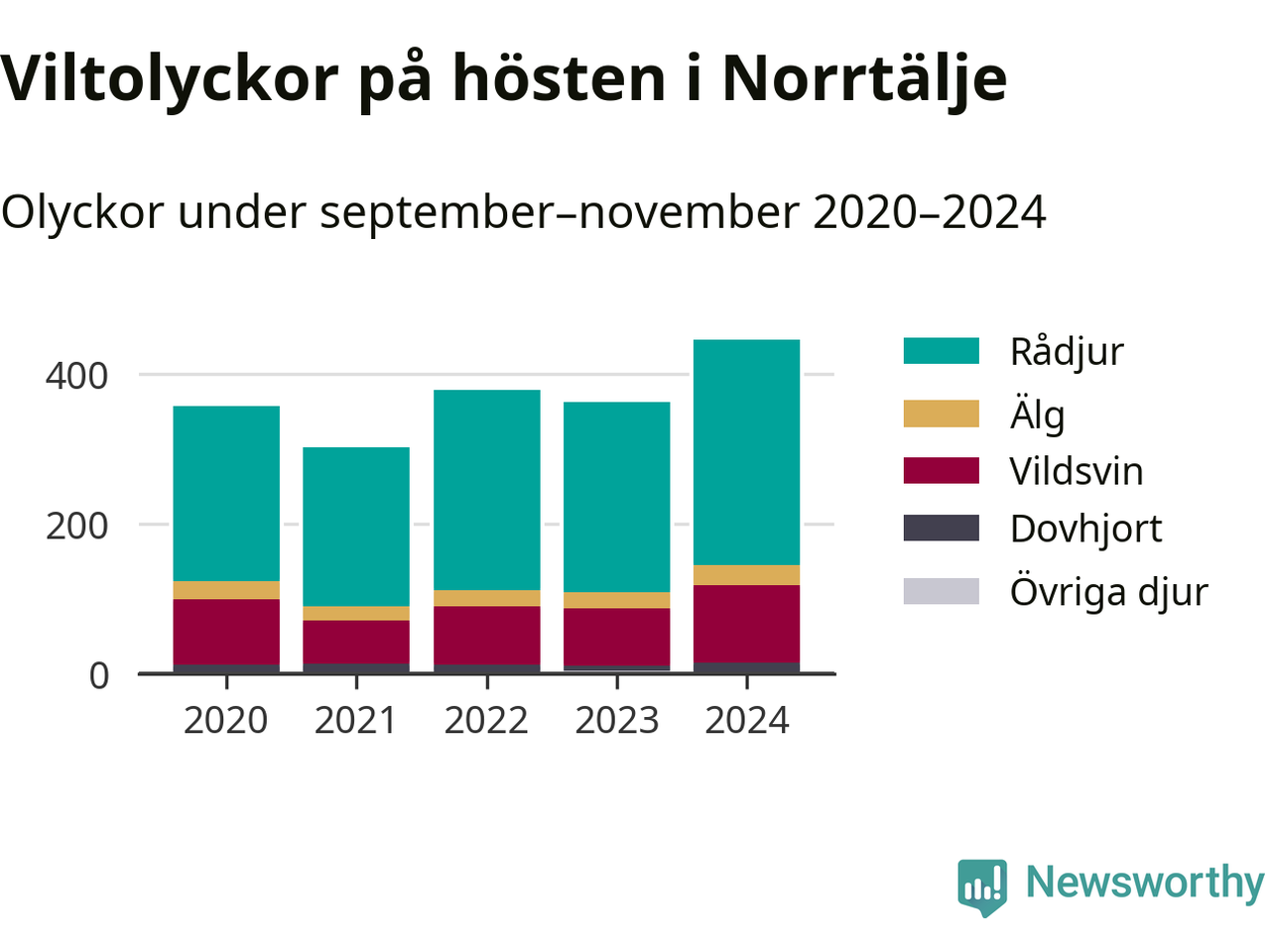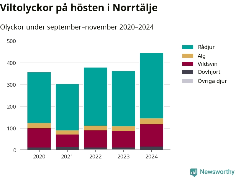 Viltolyckor i Norrtälje 2020–2024 uppdelat på viltslag