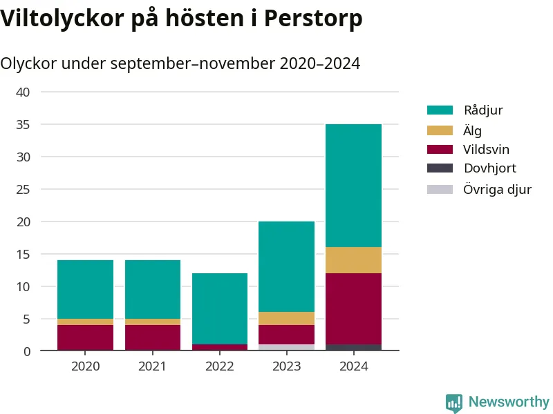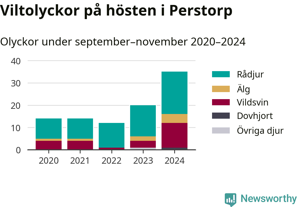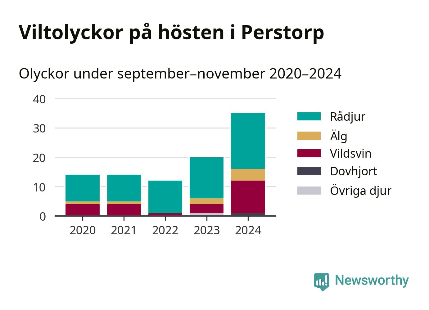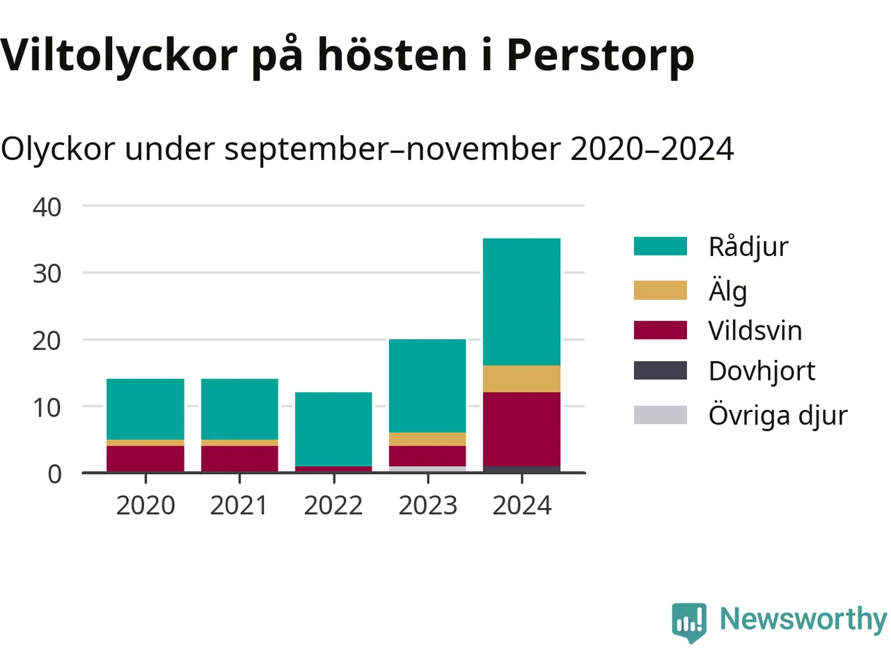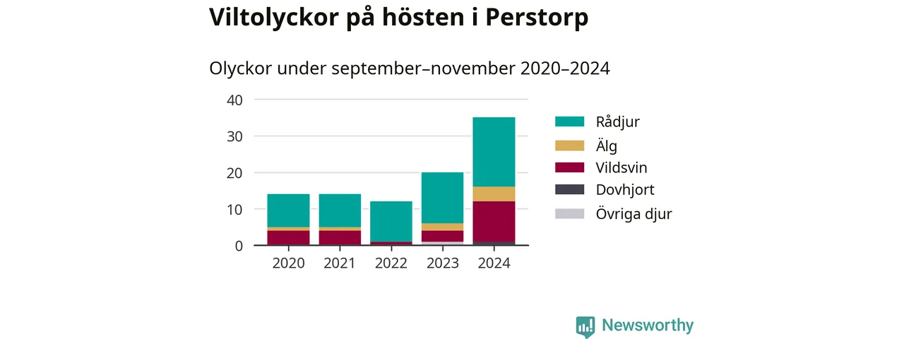 Viltolyckor i Perstorp 2020–2024 uppdelat på viltslag