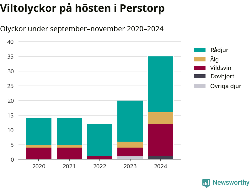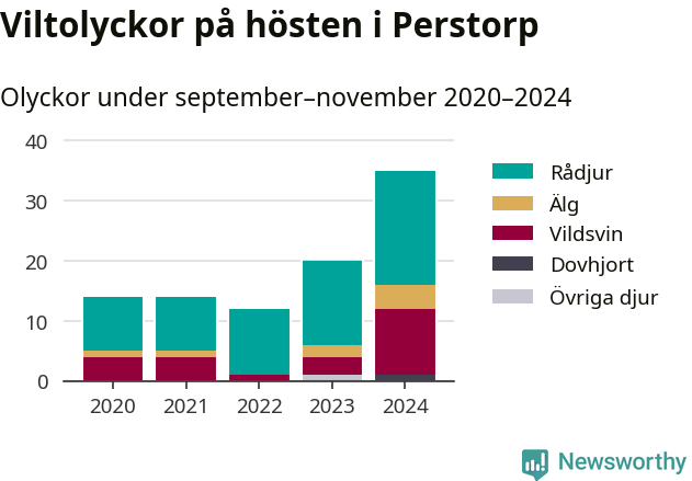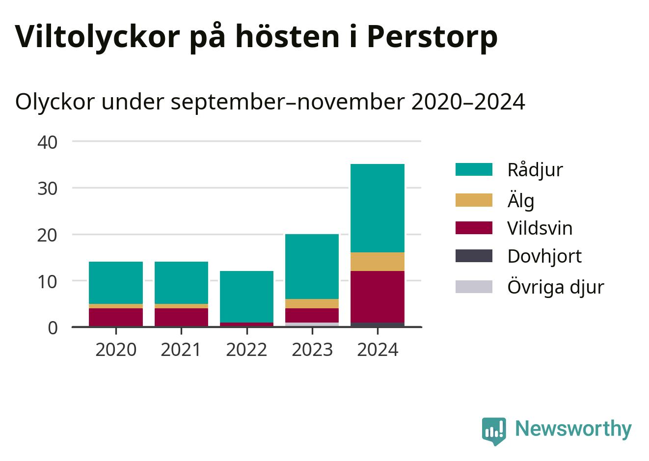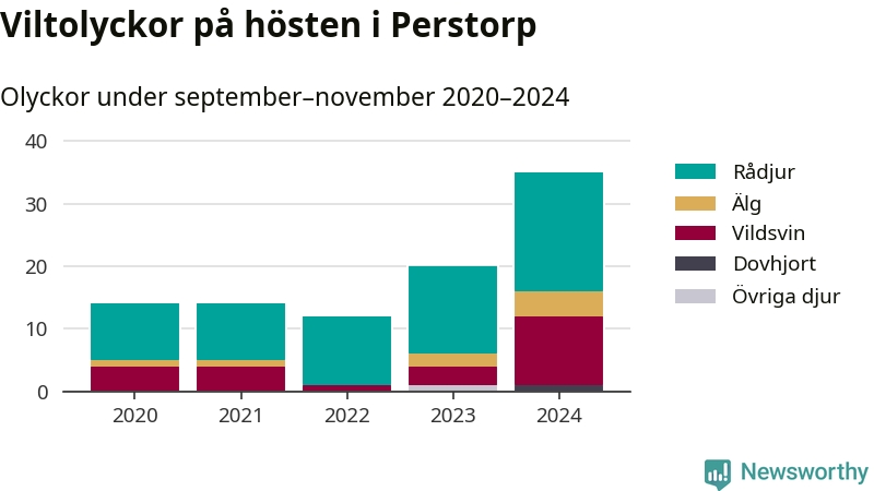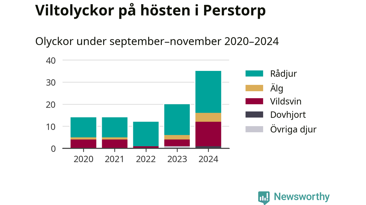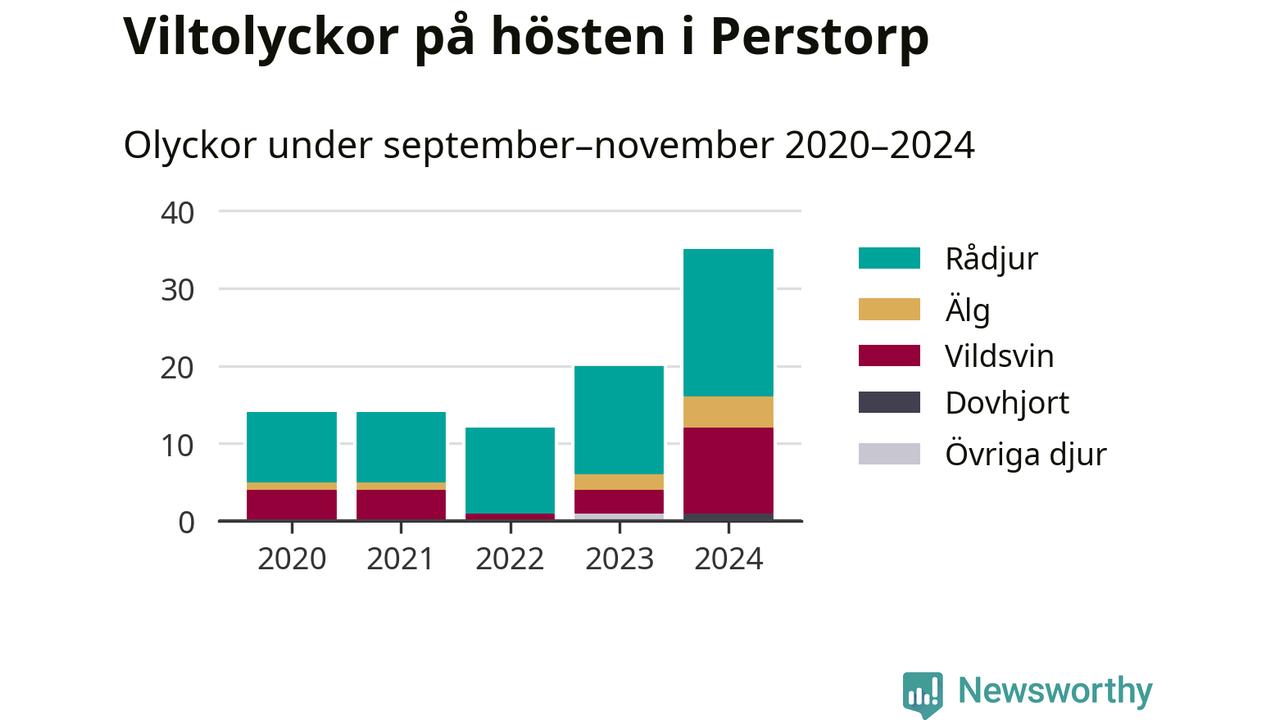 Viltolyckor i Perstorp 2020–2024 uppdelat på viltslag