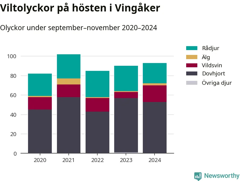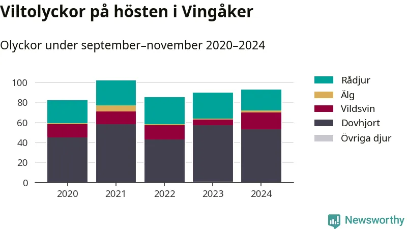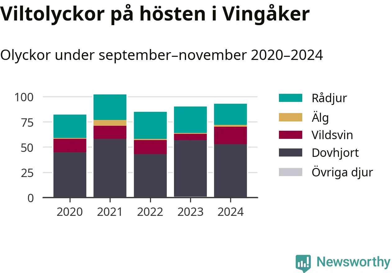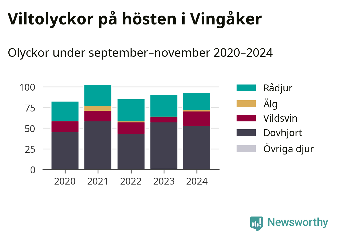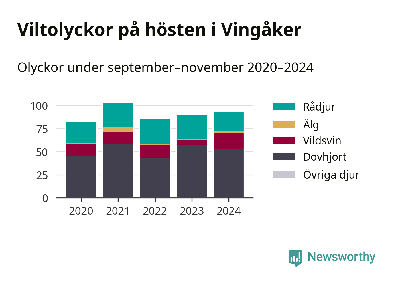 Under de senaste höstarna har antalet viltolyckor ökat i Sverige. Den höst med flest viltolyckor i Vingåker hittills under 2020-talet var 2021, 102 olyckor. I fjol höst rapporterades totalt 93 olyckor.