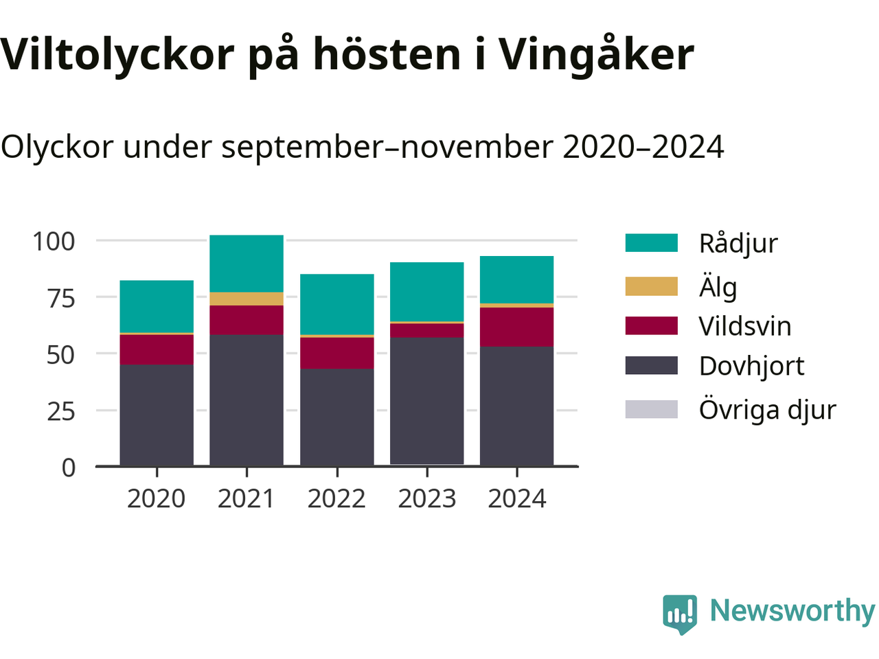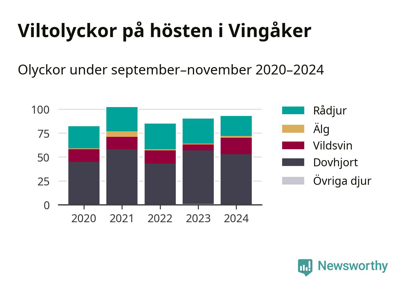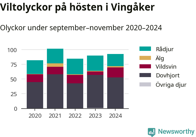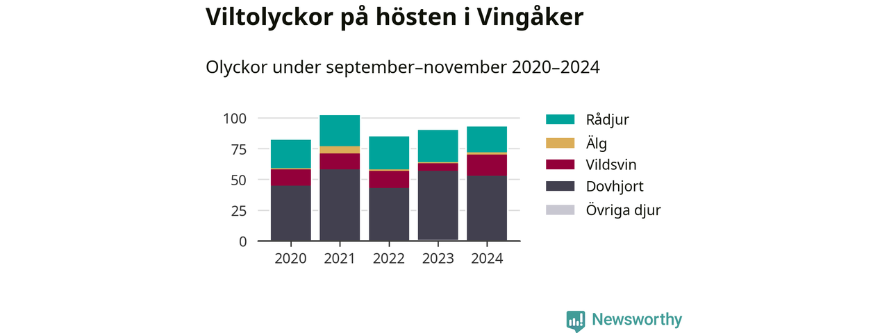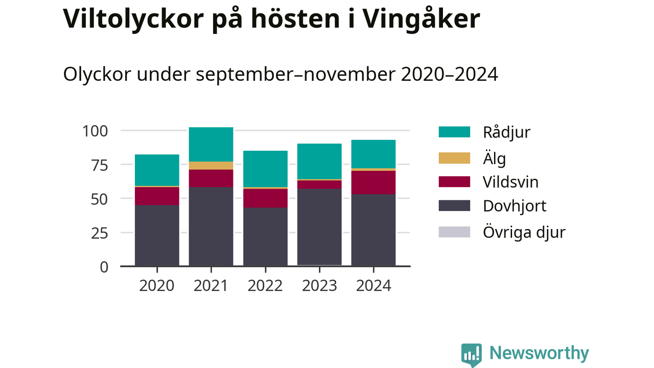 Under de senaste höstarna har antalet viltolyckor ökat i Sverige. Den höst med flest viltolyckor i Vingåker hittills under 2020-talet var 2021, 102 olyckor. I fjol höst rapporterades totalt 93 olyckor.