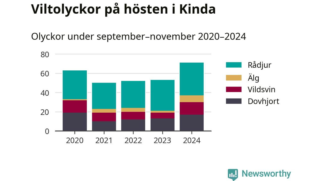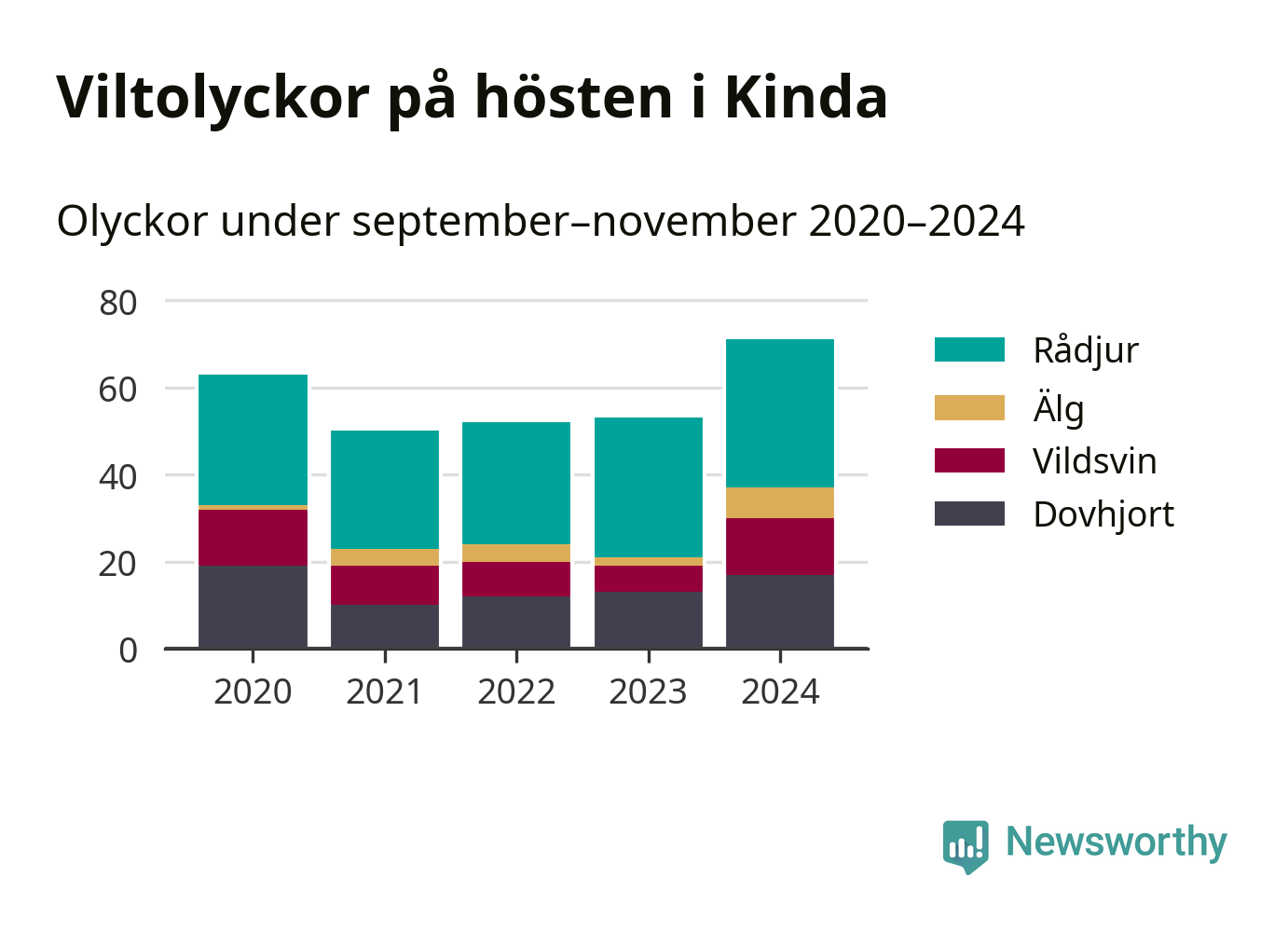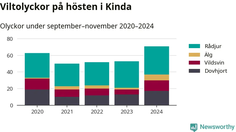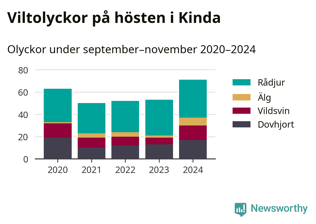 Under de senaste höstarna har antalet viltolyckor ökat i Sverige. I fjol höst noterades också flest viltolyckor i Kinda hittills under 2020-talet, totalt 71 stycken.