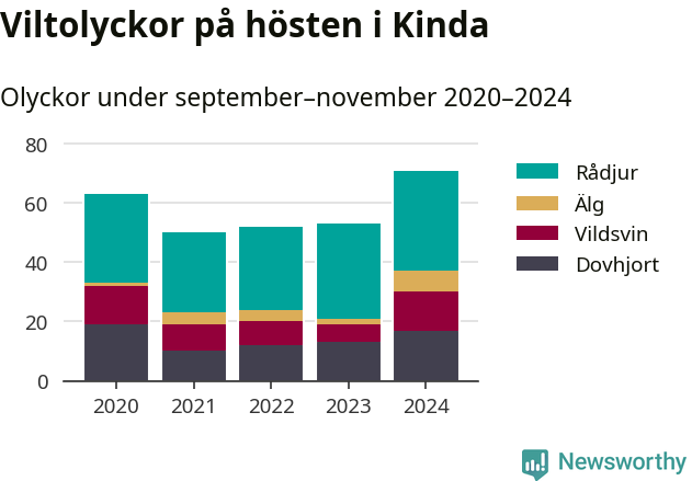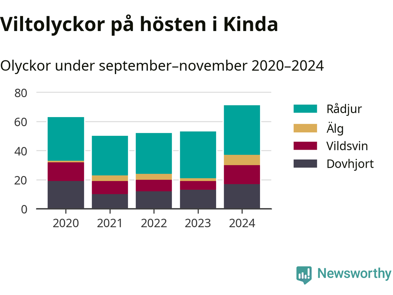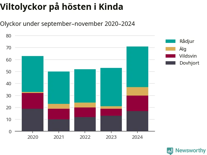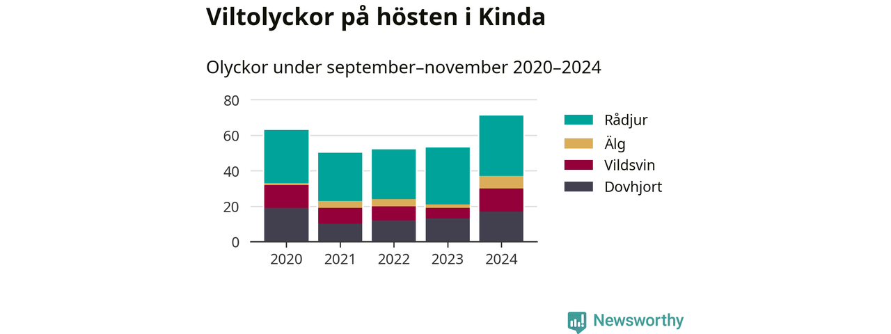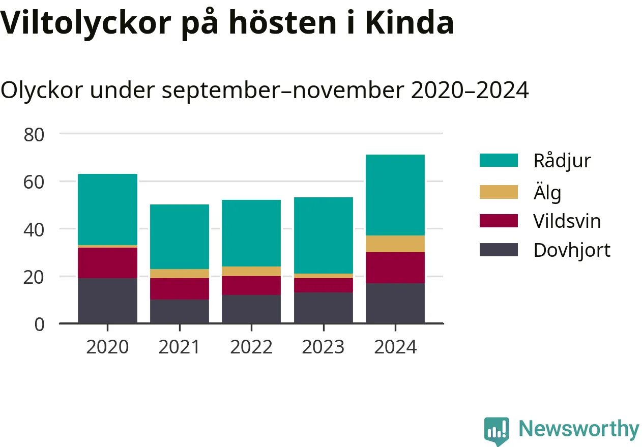 Under de senaste höstarna har antalet viltolyckor ökat i Sverige. I fjol höst noterades också flest viltolyckor i Kinda hittills under 2020-talet, totalt 71 stycken.