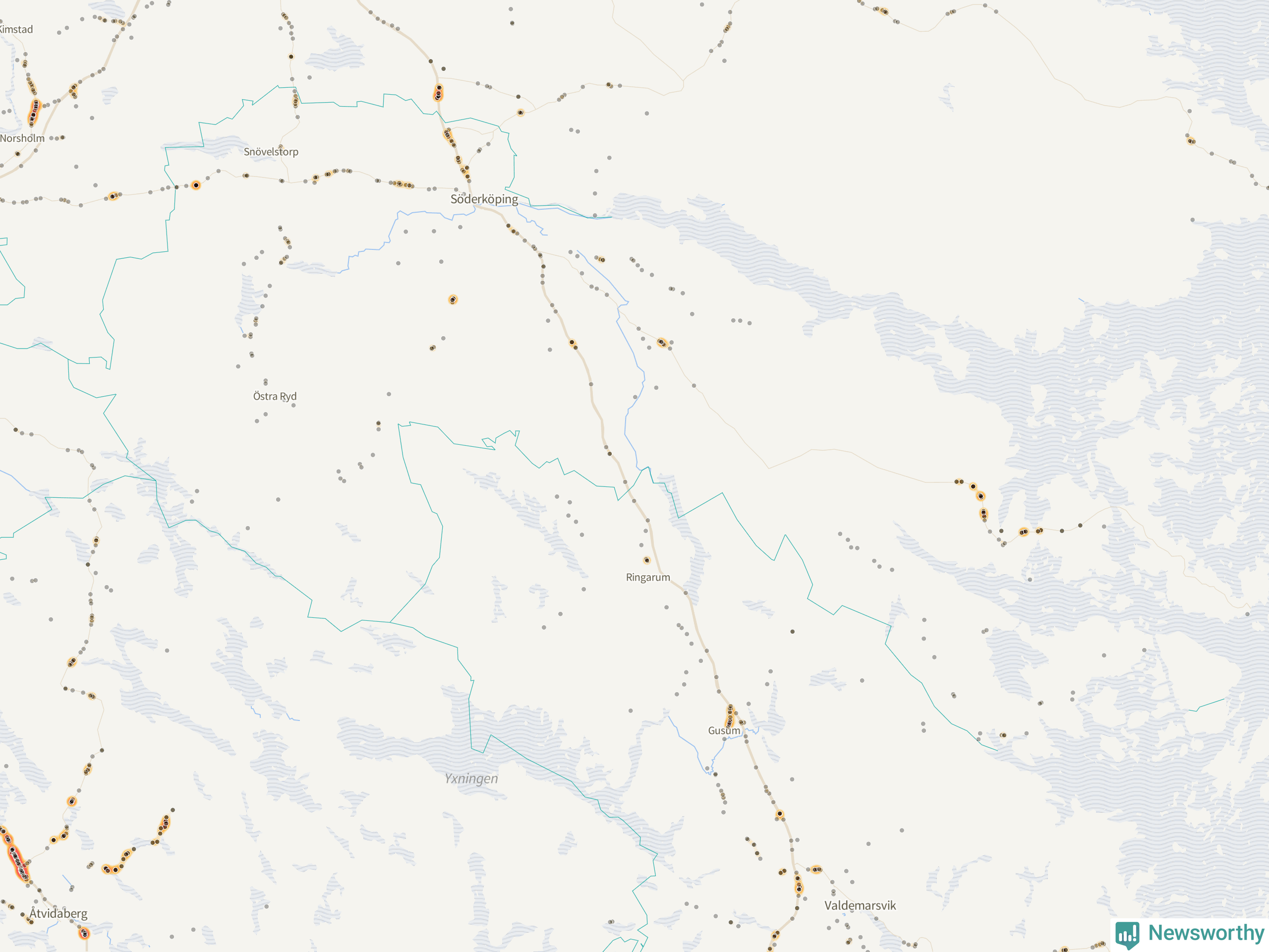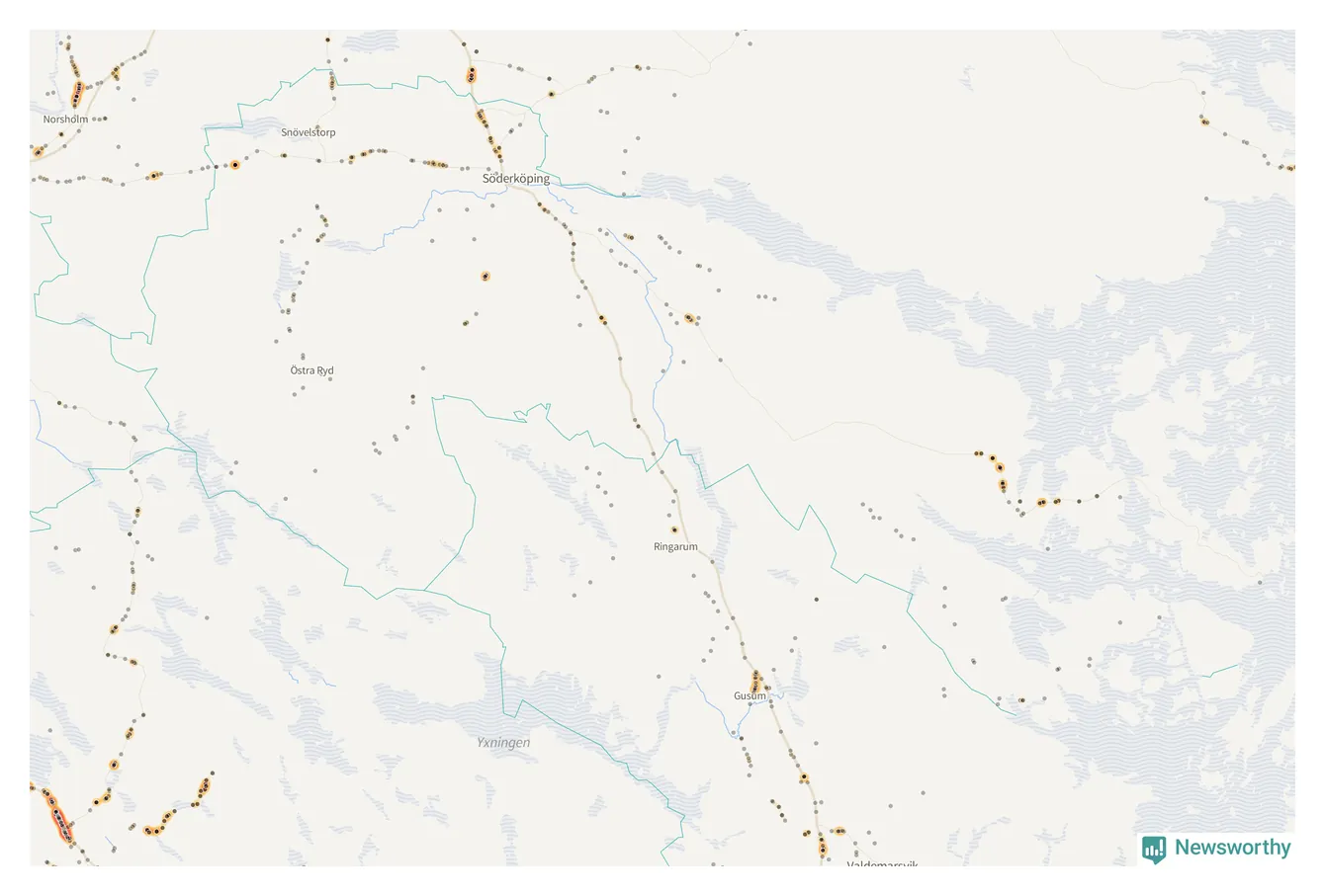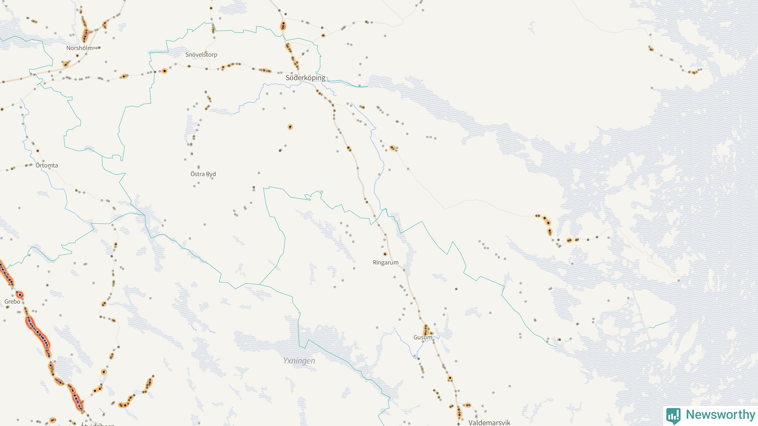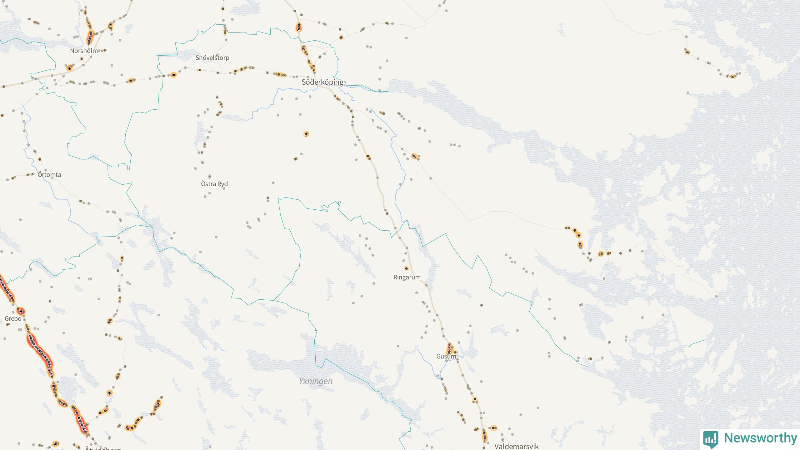 Den mest olycksdrabbade vägen i Östergötland är väg 35, med totalt 465 rapporterade viltolyckor i länet under femårsperioden. Flest olyckor längs väg 35 – 362 stycken – skedde i Åtvidabergs kommun. Linköping är den kommun med flest registrerade viltolyckor i länet totalt, 1 194 stycken under perioden september–november 2020–2024.