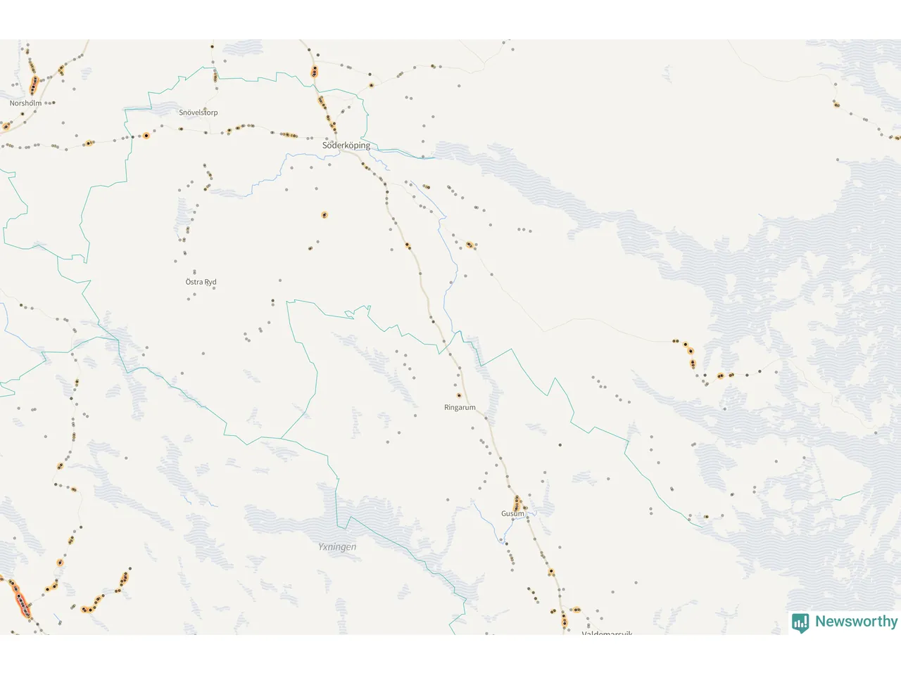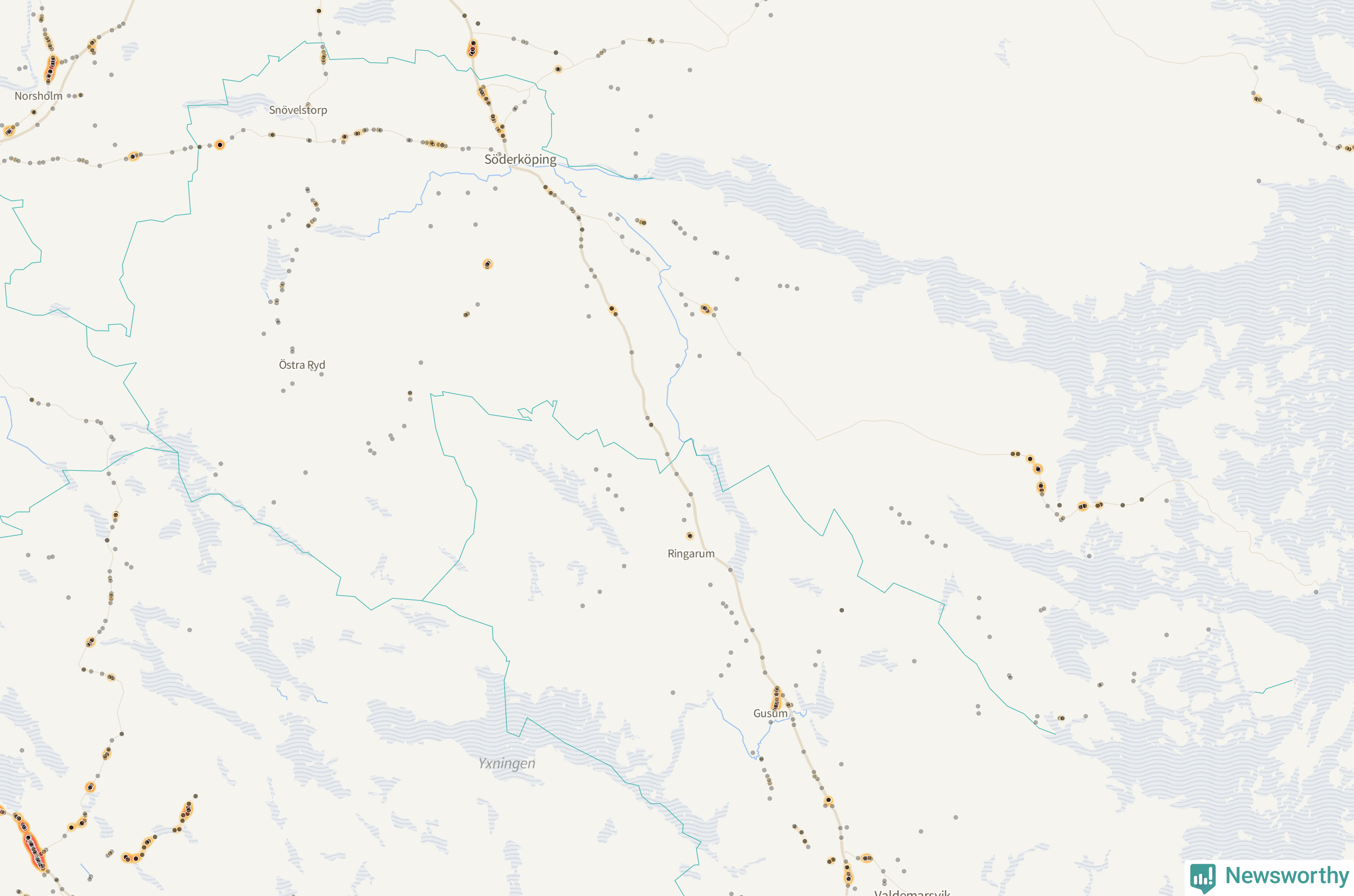 Flest olyckor i kommunen – 79 stycken – har skett längs väg 210 (då räknar vi in åtta olyckor där väg 210 har gemensam sträckning med E22). Av dessa orsakades 54 av rådjur. Längs E22 har 42 viltolyckor rapporterats under motsvarande period.