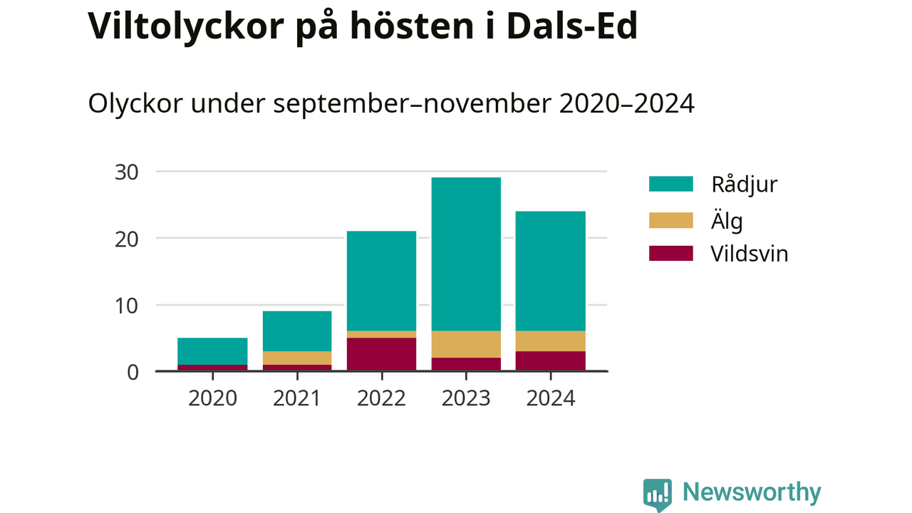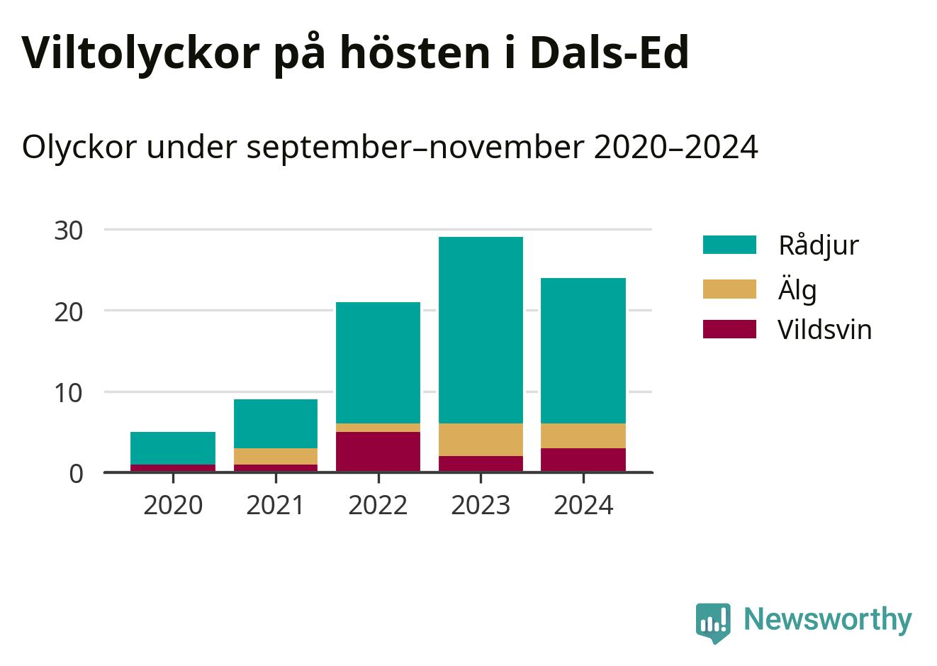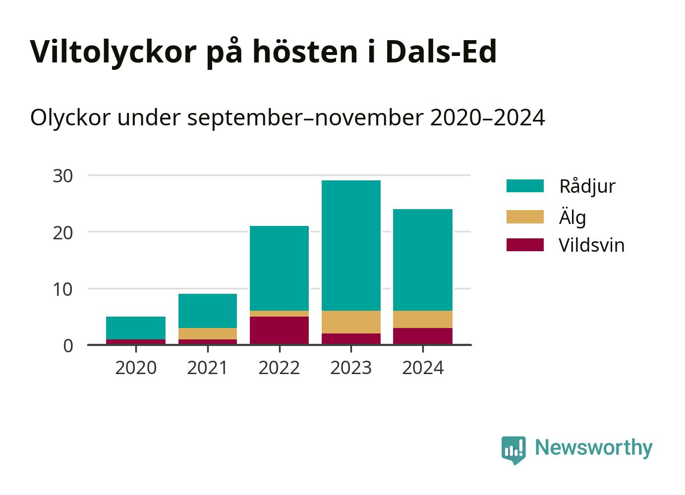 Under de senaste höstarna har antalet viltolyckor ökat i Sverige. Den höst med flest viltolyckor i Dals-Ed hittills under 2020-talet var 2023, 29 olyckor. I fjol höst rapporterades totalt 24 olyckor.