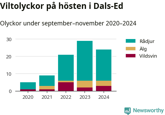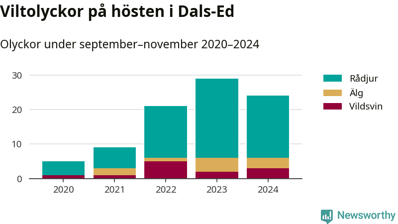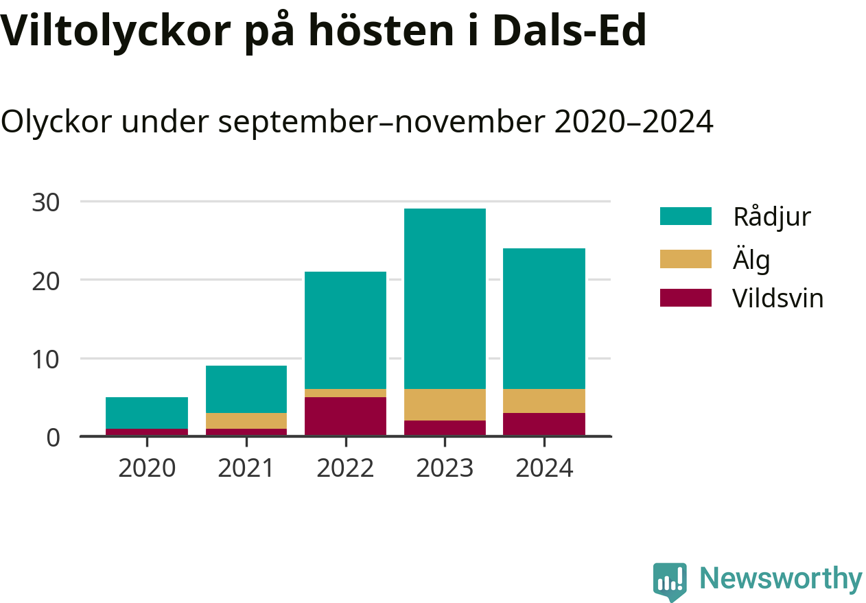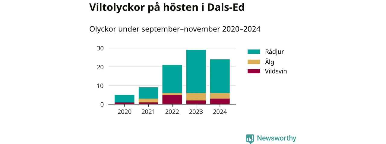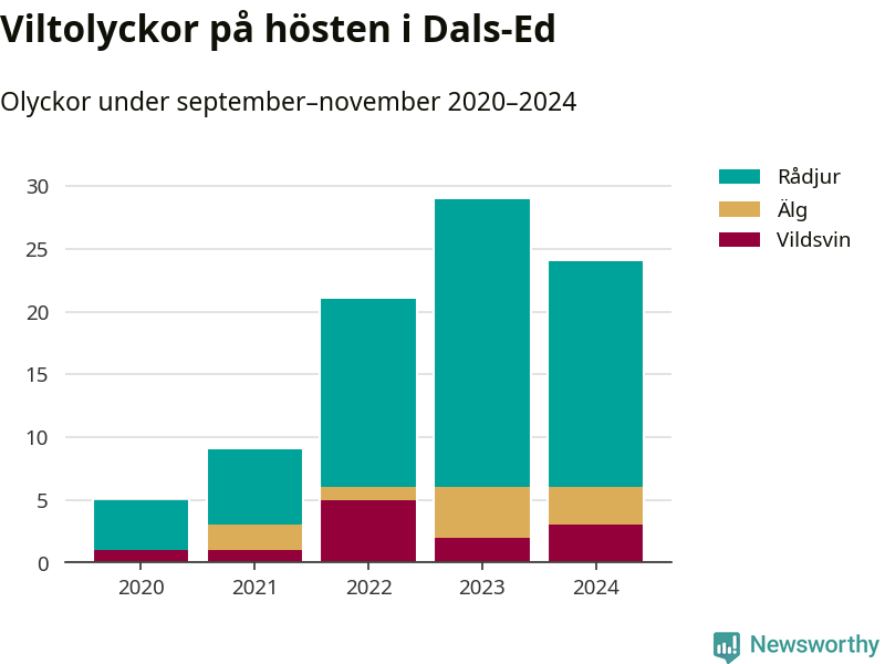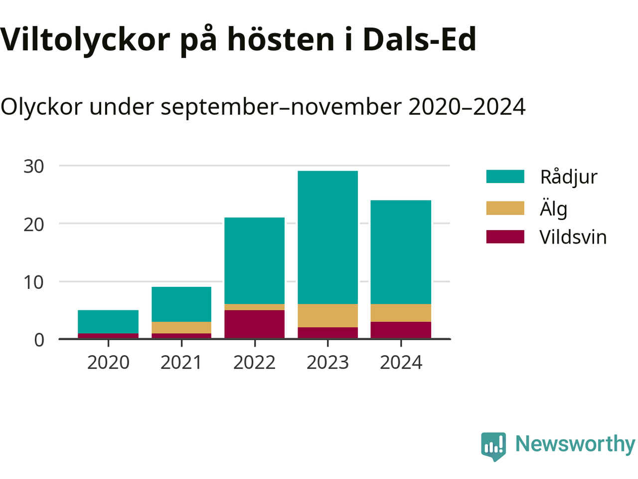 Under de senaste höstarna har antalet viltolyckor ökat i Sverige. Den höst med flest viltolyckor i Dals-Ed hittills under 2020-talet var 2023, 29 olyckor. I fjol höst rapporterades totalt 24 olyckor.