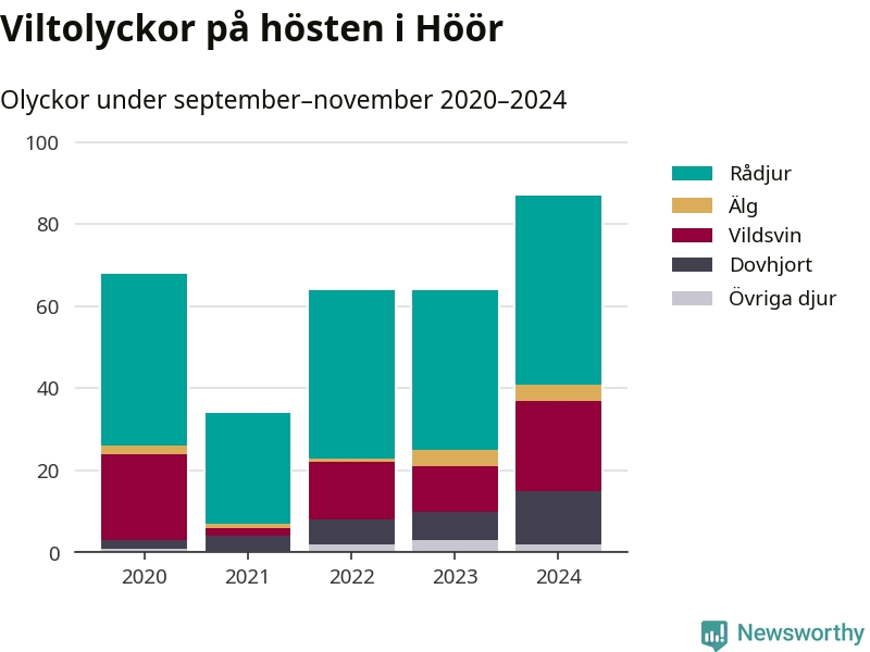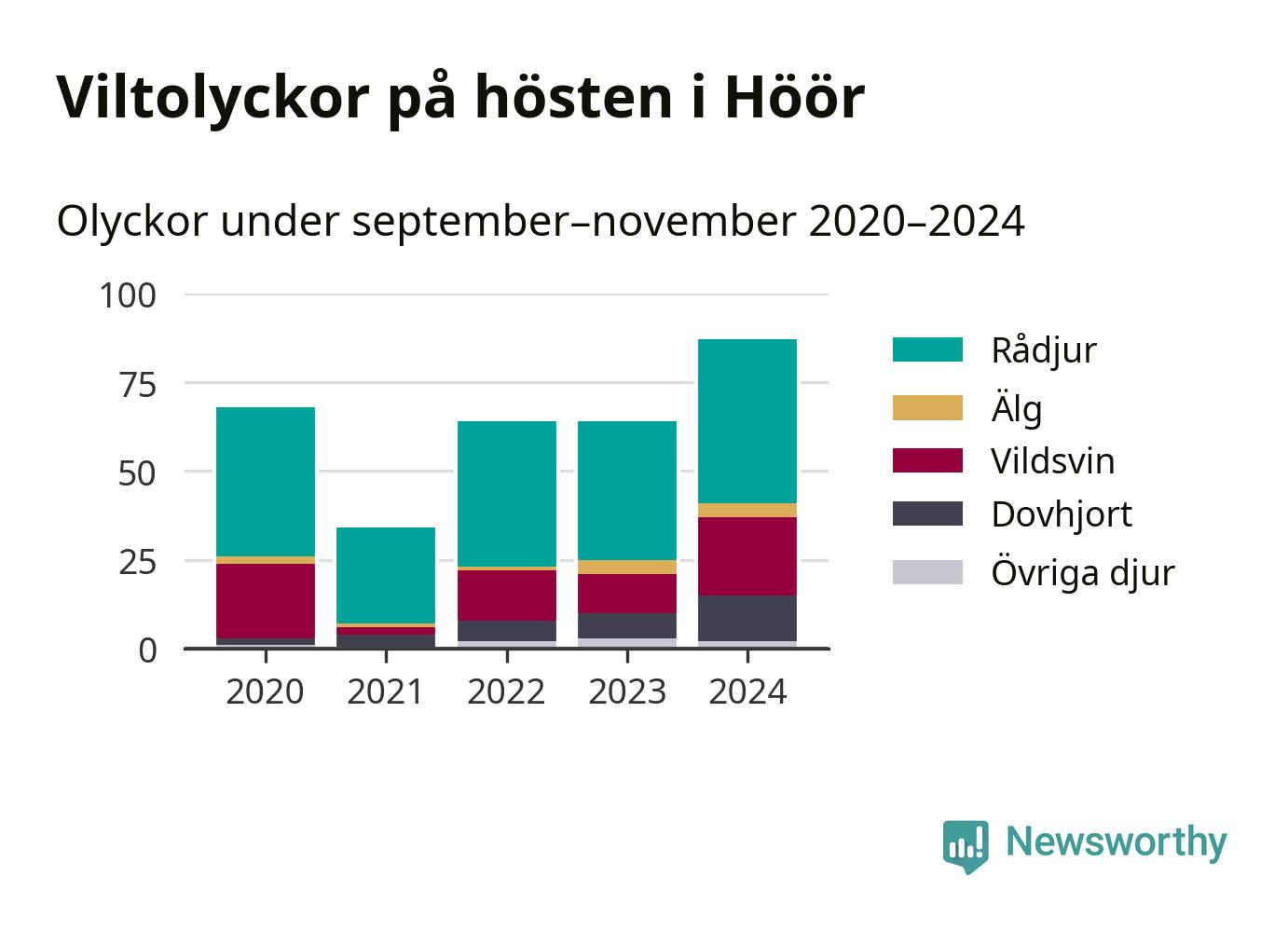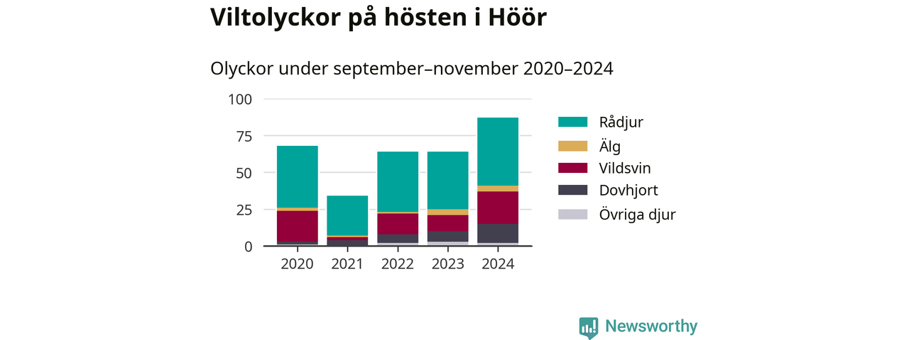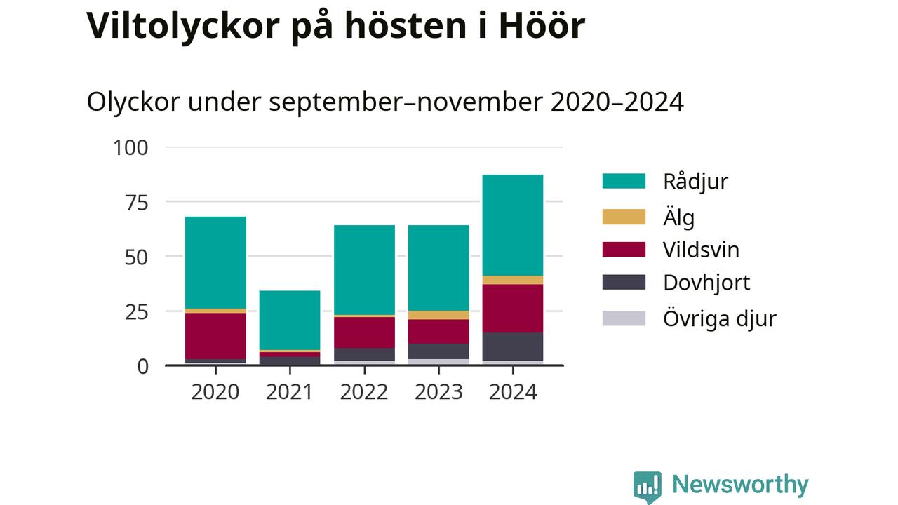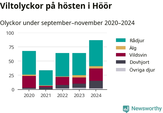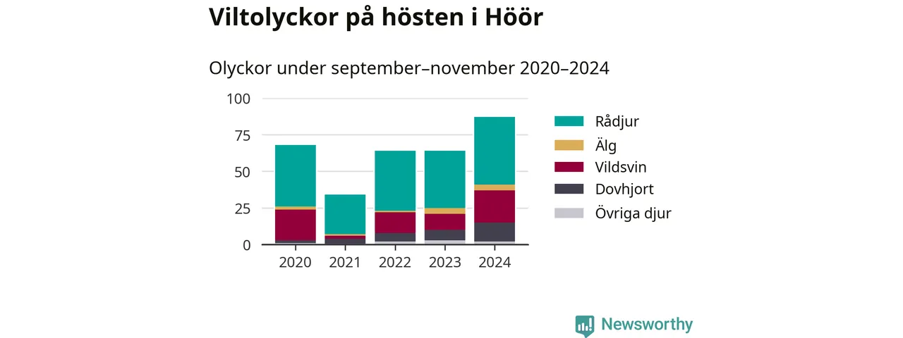 Viltolyckor i Höör 2020–2024 uppdelat på viltslag
