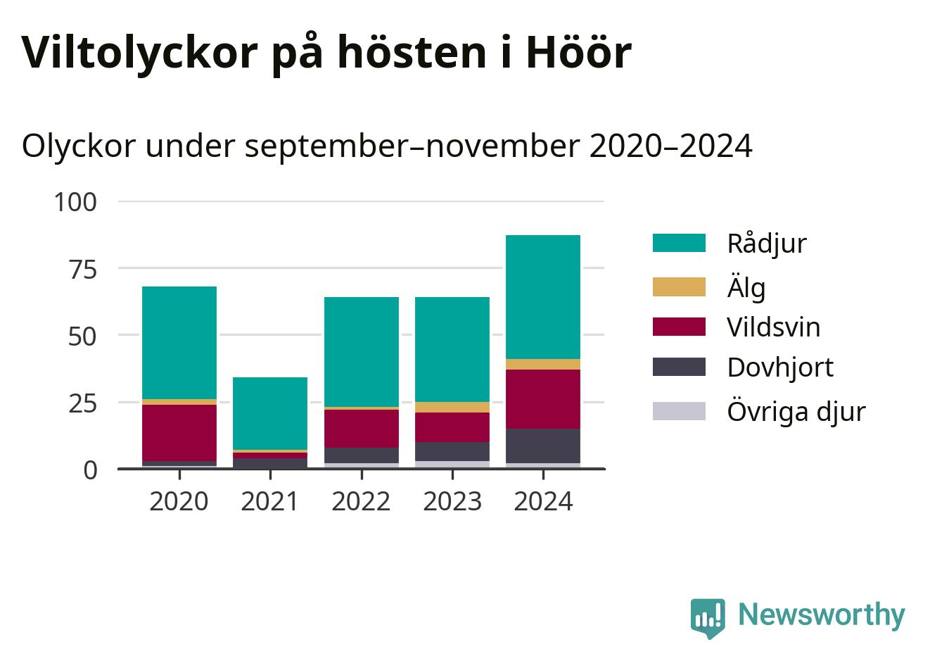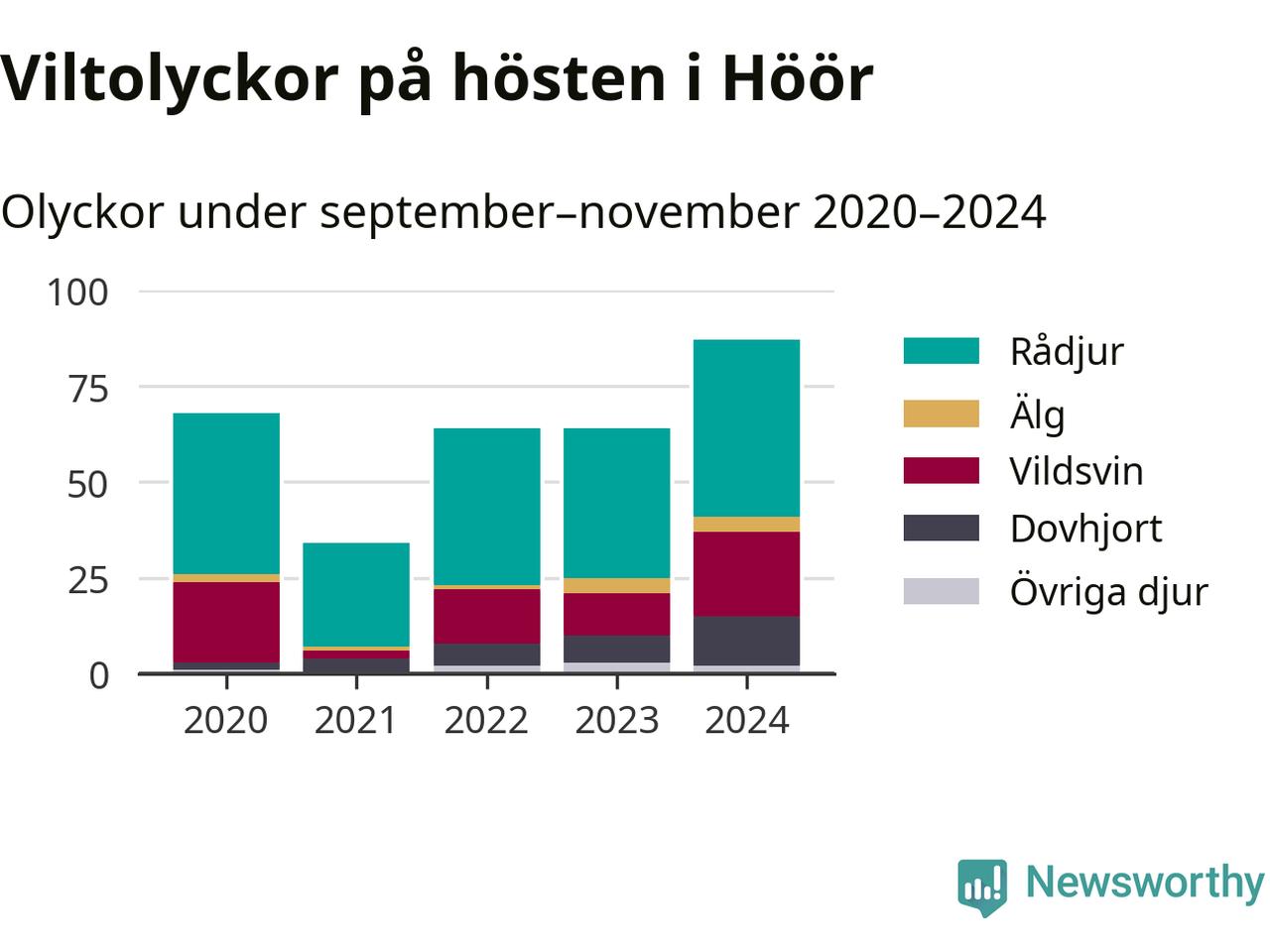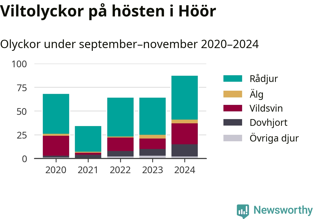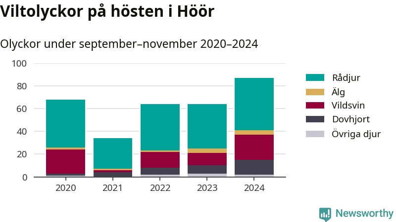 Viltolyckor i Höör 2020–2024 uppdelat på viltslag