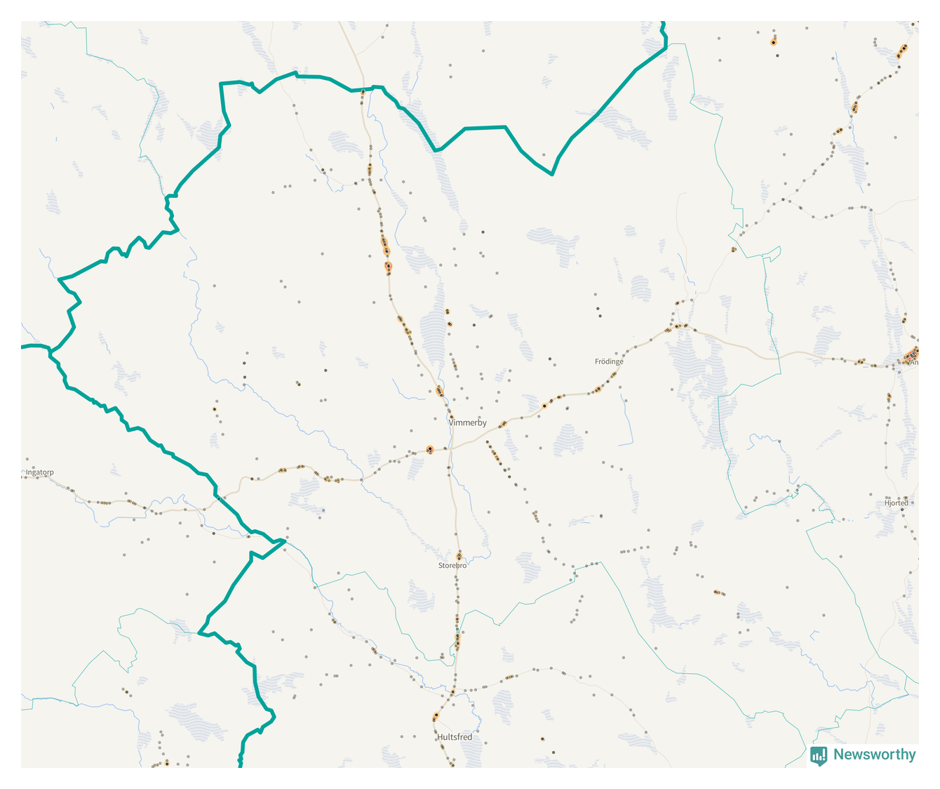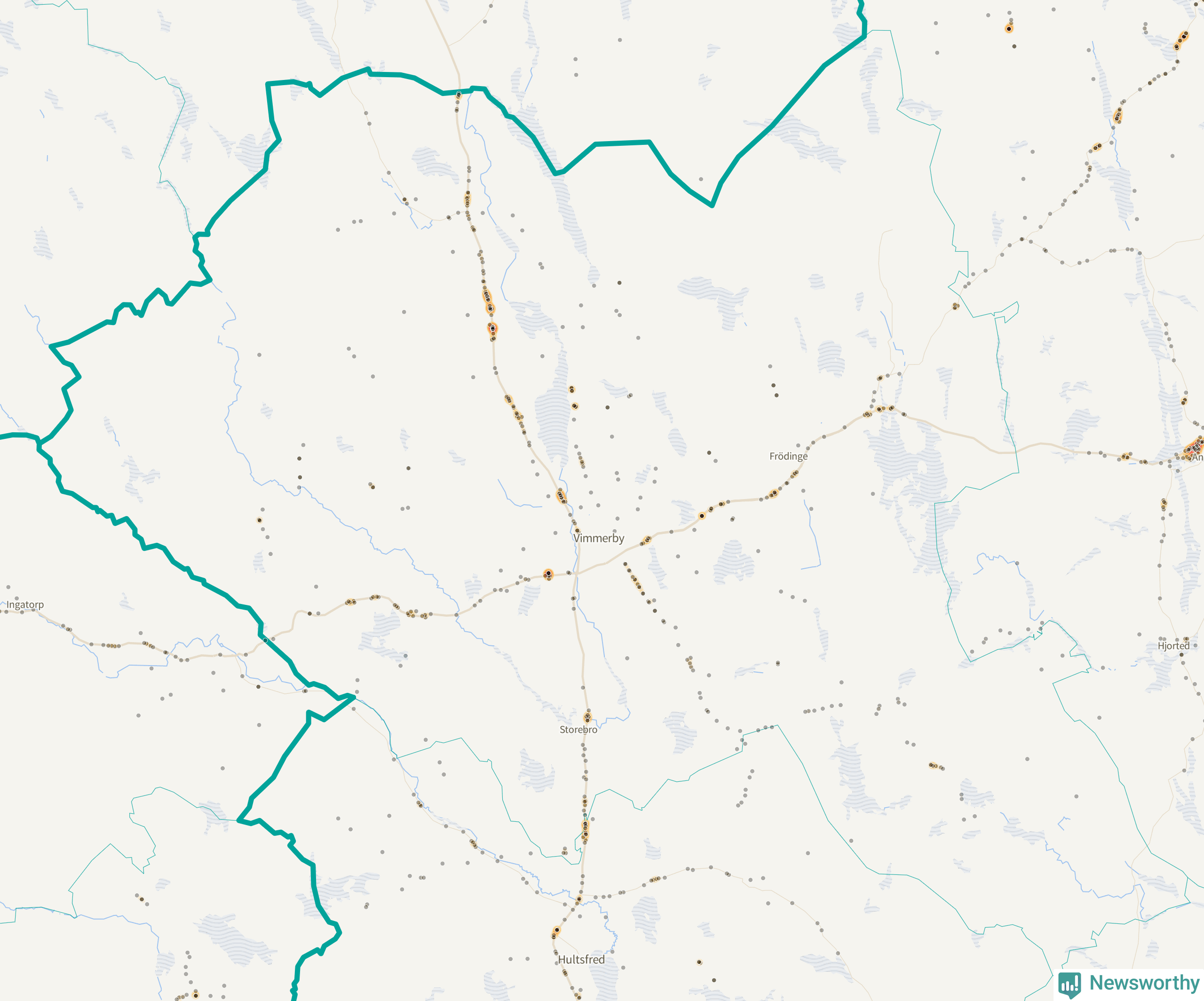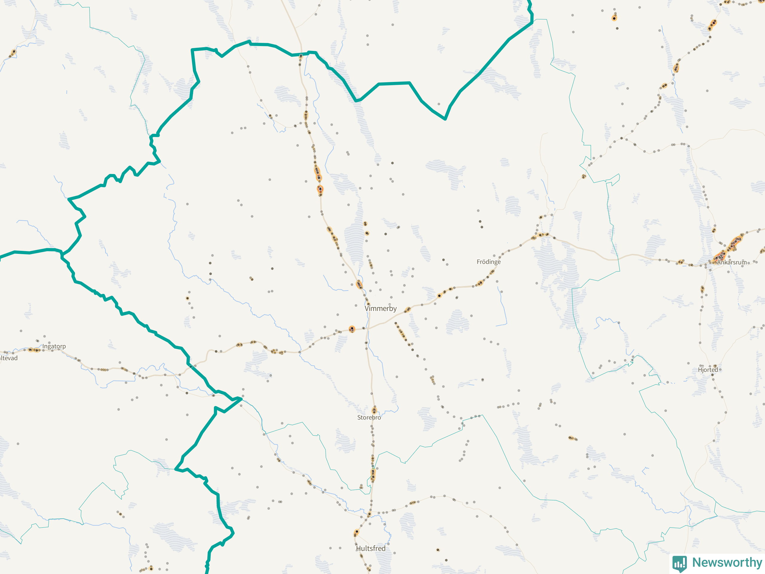 Flest olyckor i kommunen – 119 stycken – har skett längs väg 23 (då räknar vi in 116 olyckor där väg 23 har gemensam sträckning med väg 34). Av dessa orsakades 75 av rådjur. Längs väg 34 har 116 viltolyckor rapporterats under motsvarande period.