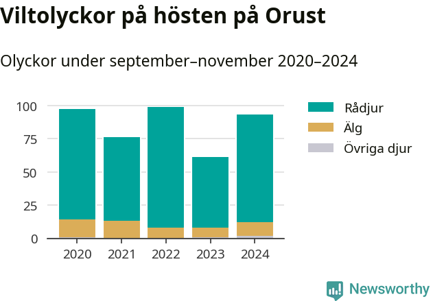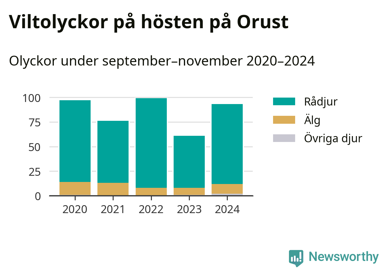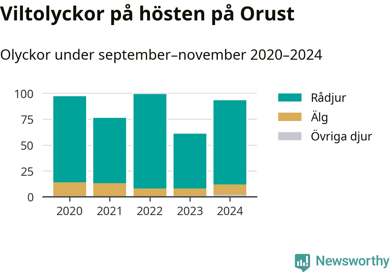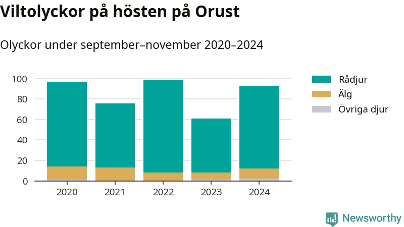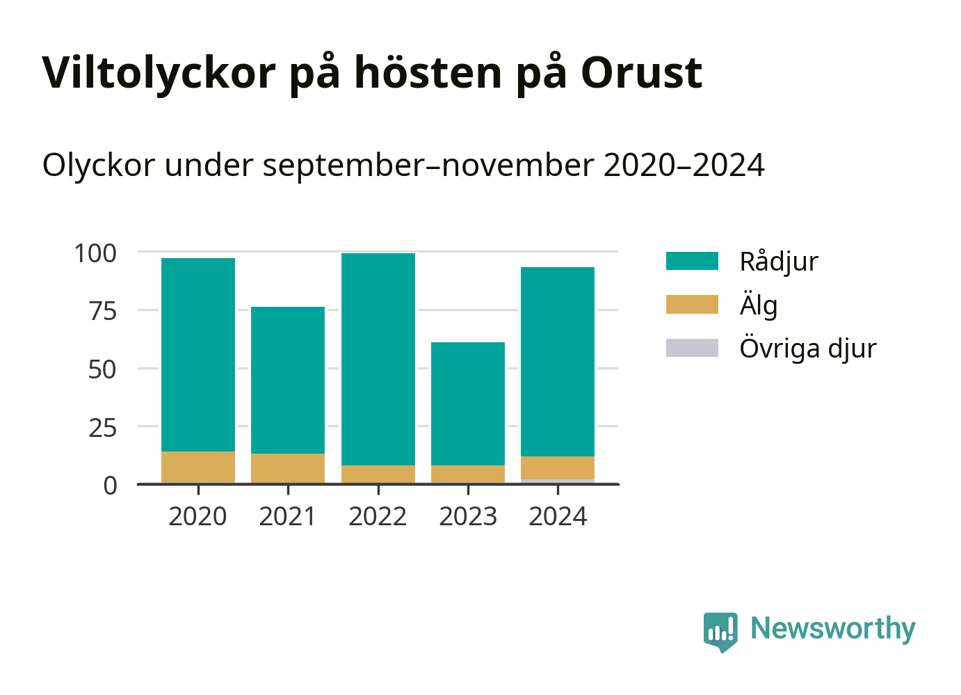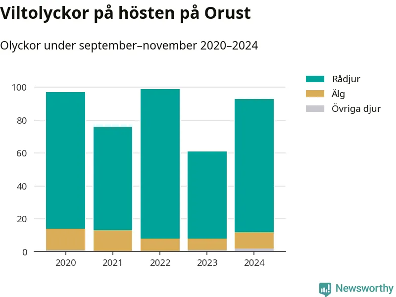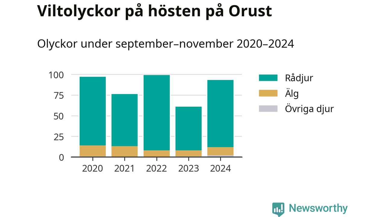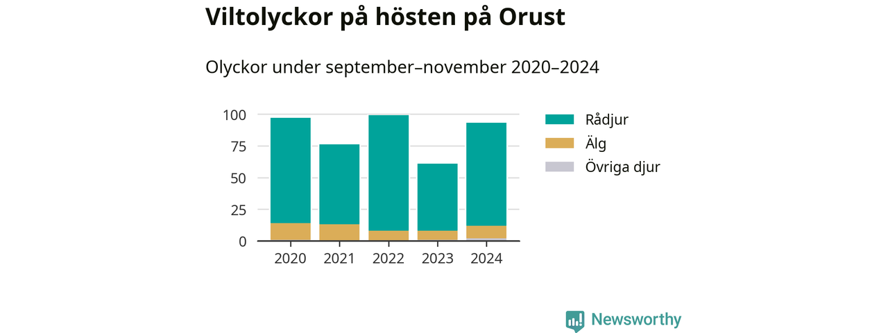 Under de senaste höstarna har antalet viltolyckor ökat i Sverige. Den höst med flest viltolyckor på Orust hittills under 2020-talet var 2022, 99 olyckor. I fjol höst rapporterades totalt 93 olyckor.
