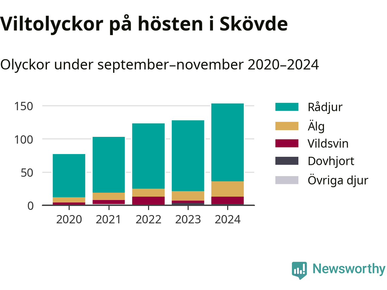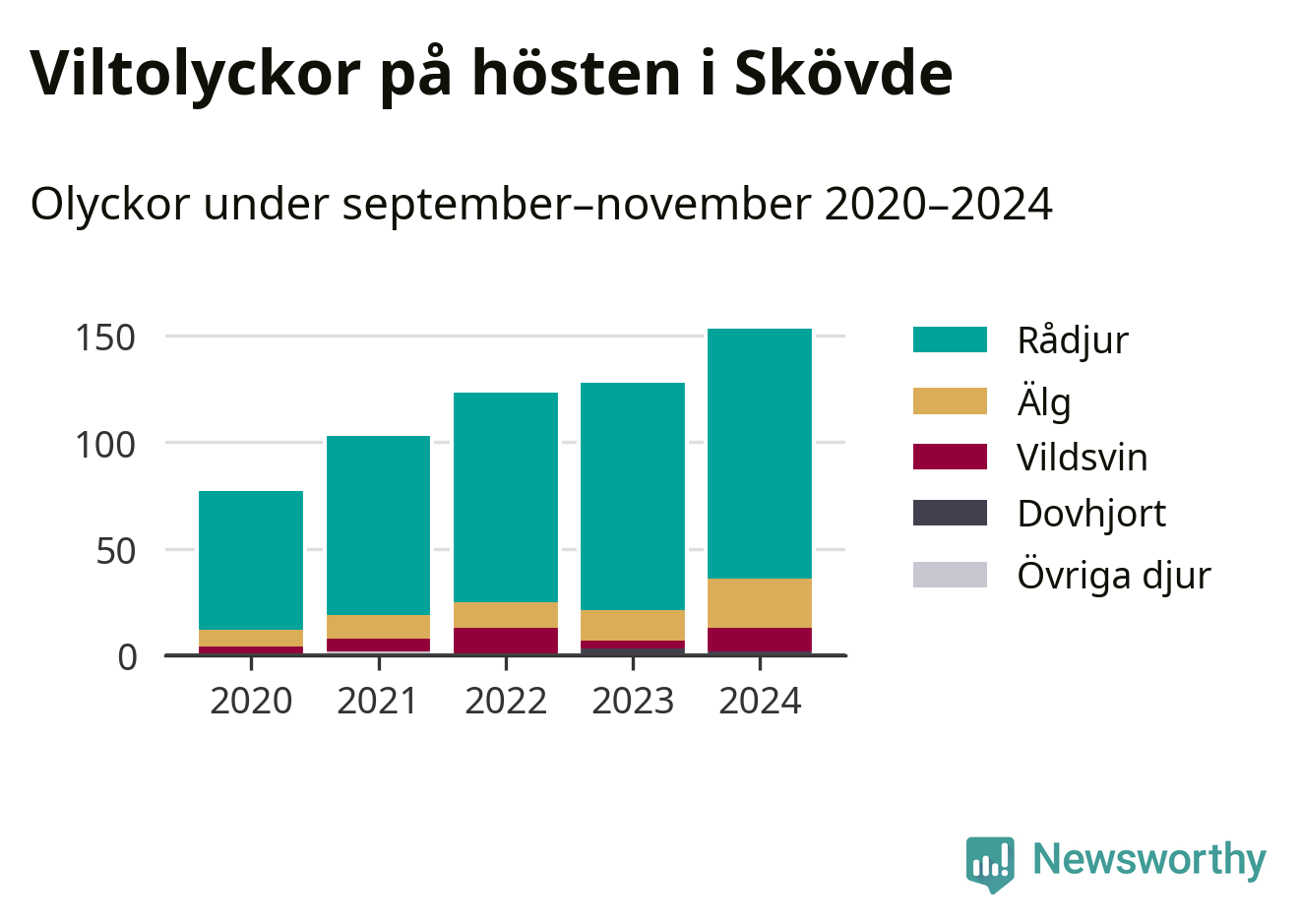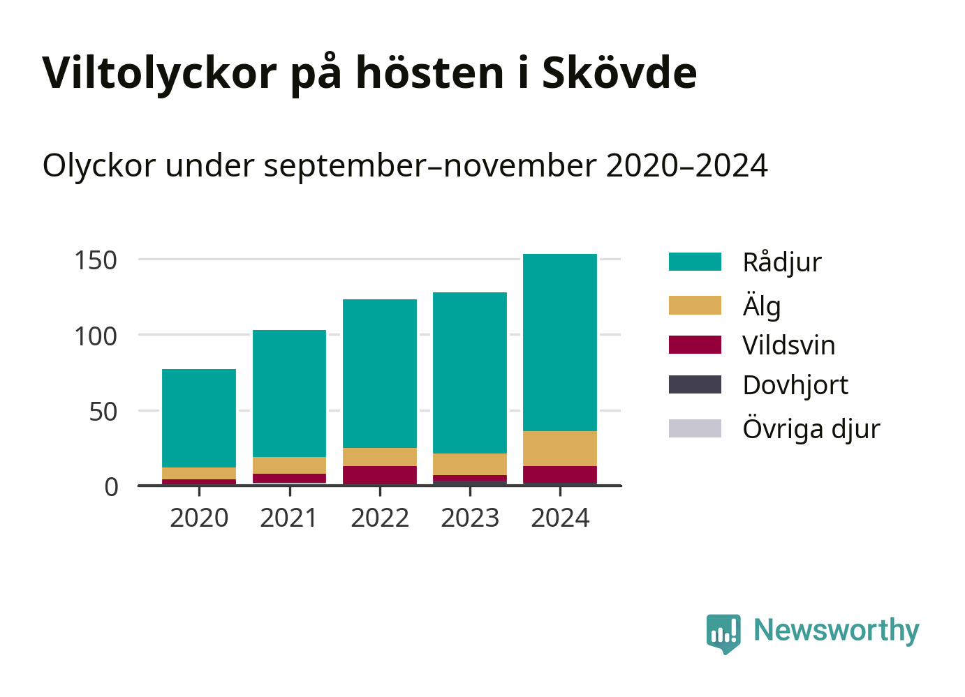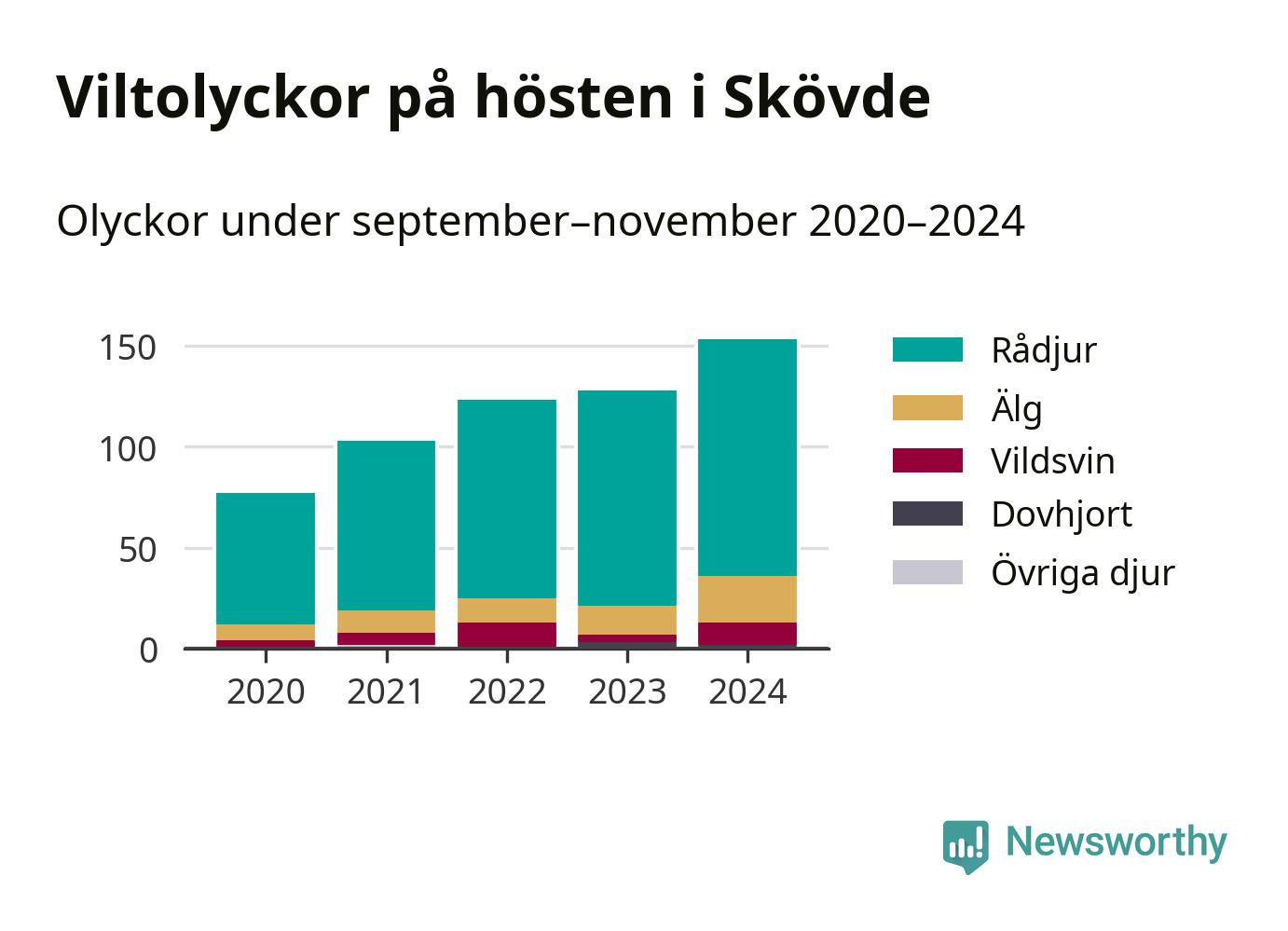 Under de senaste höstarna har antalet viltolyckor ökat i Sverige. Så också i Skövde, där antalet viltolyckor stadigt blivit fler – från 77 hösten 2020 till 153 olyckor i fjol.