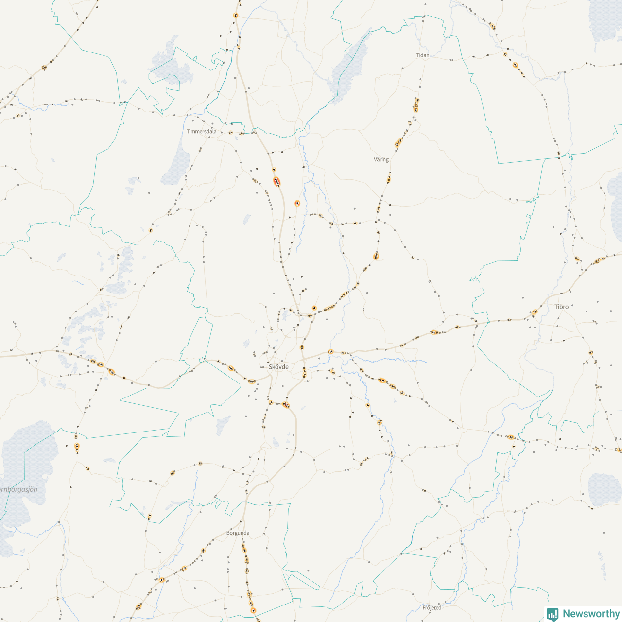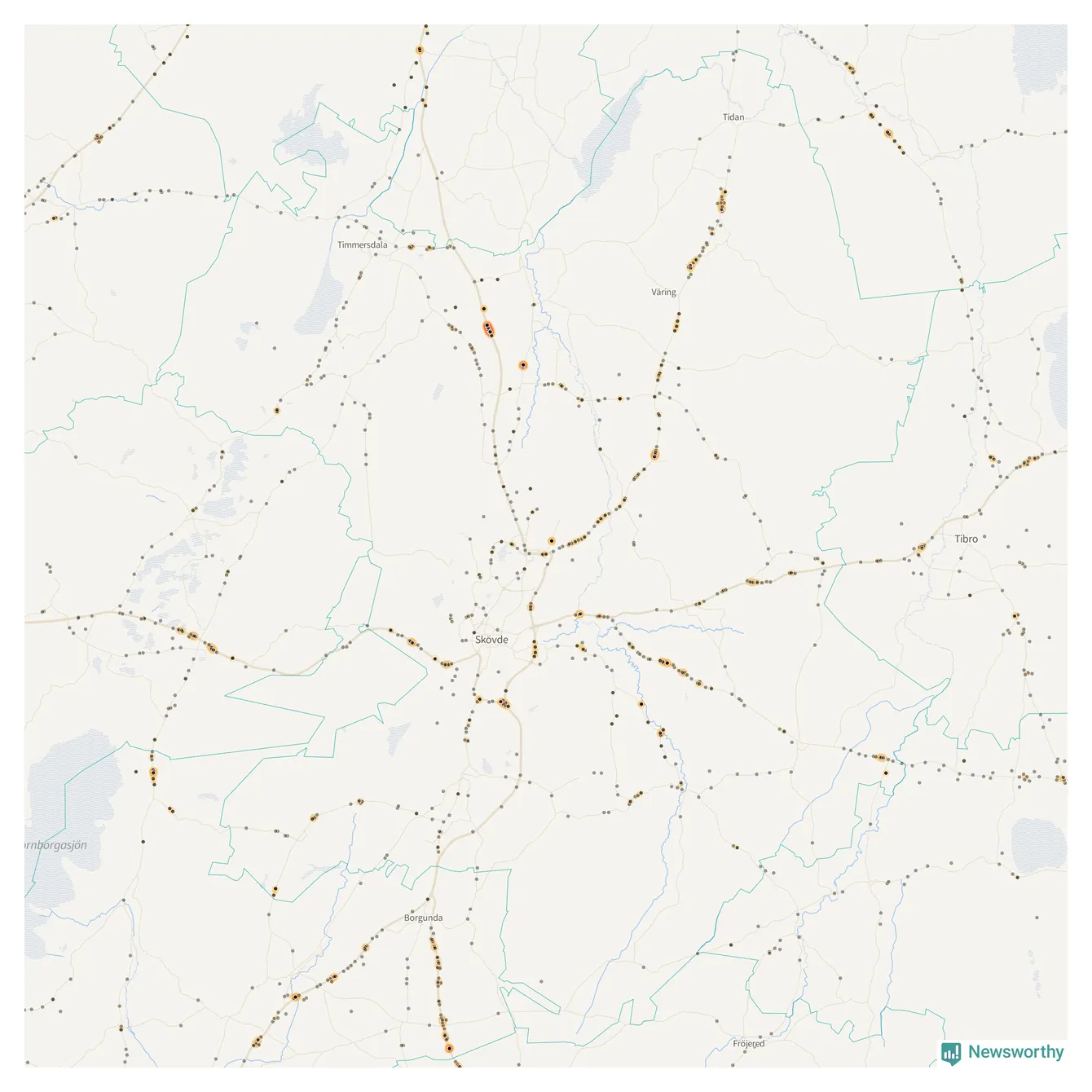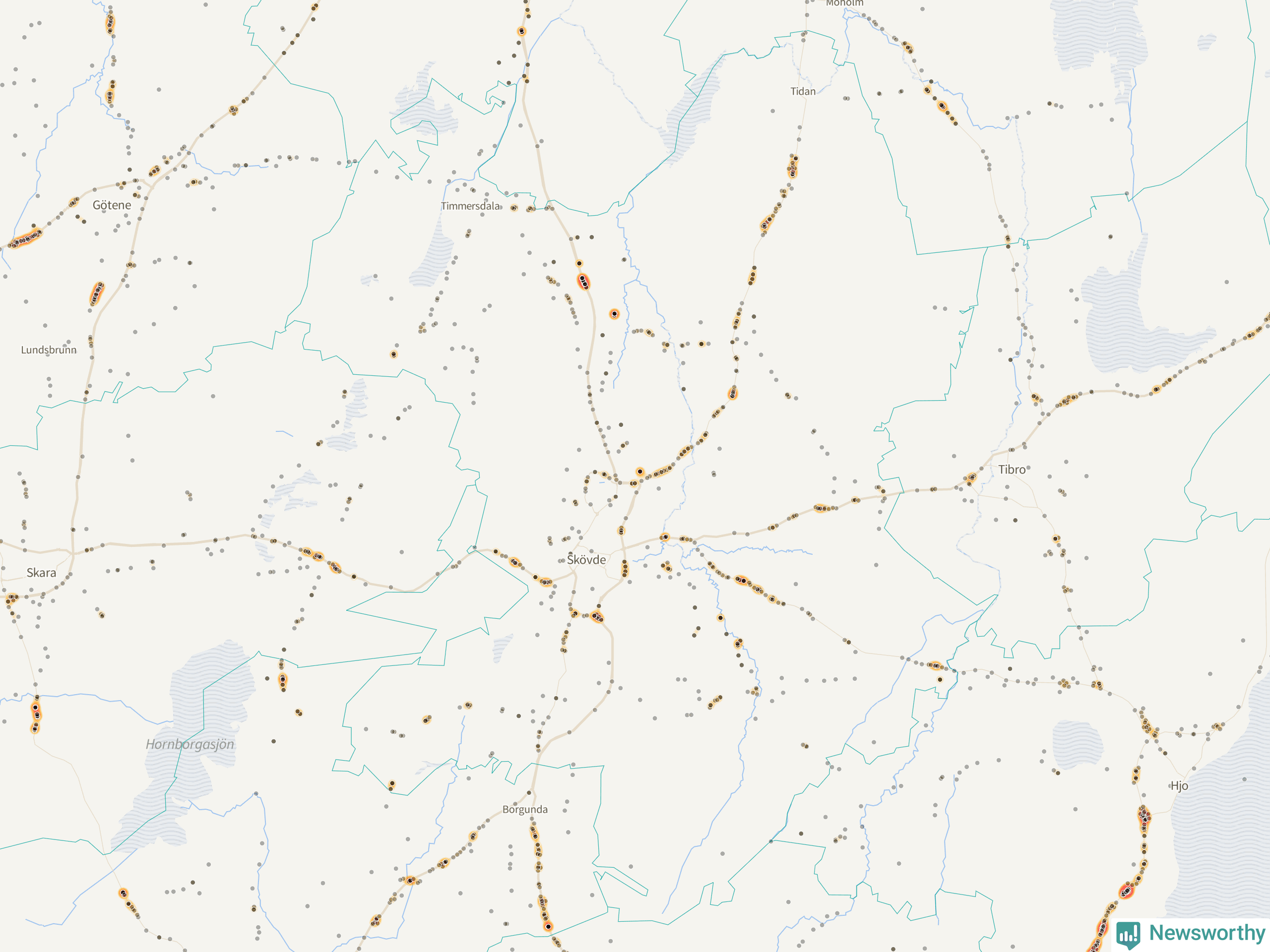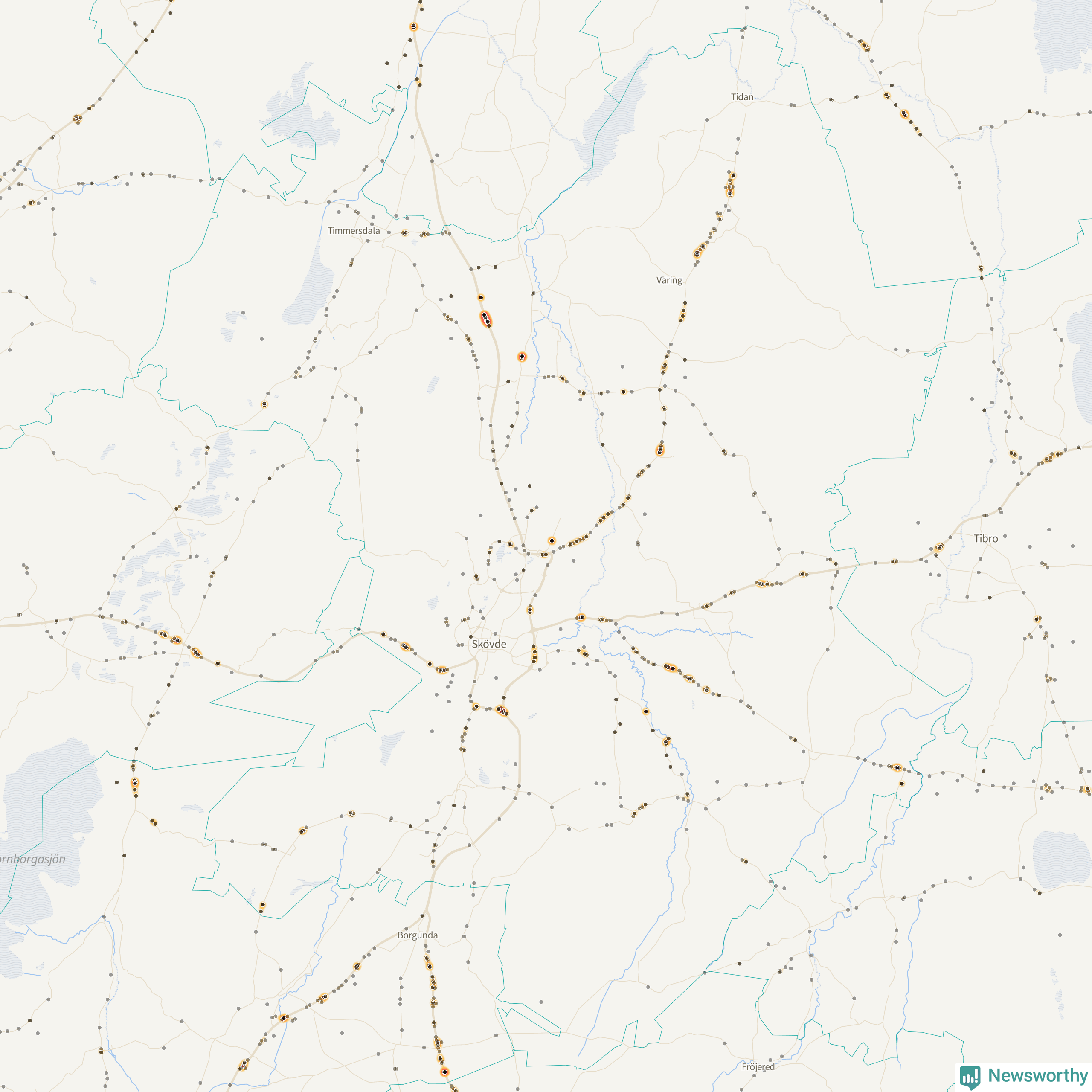 | Väg 2885 (Skövdevägen) | 18 | rådjur (13 olyckor) |