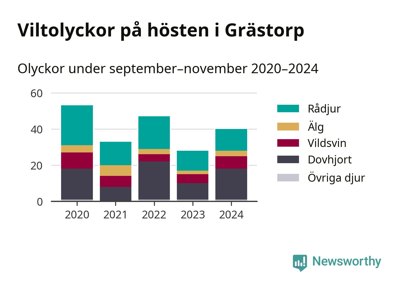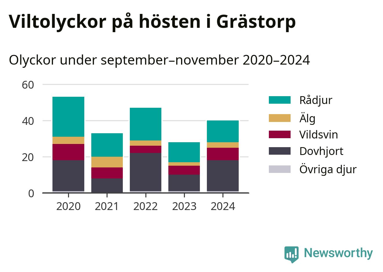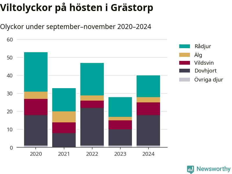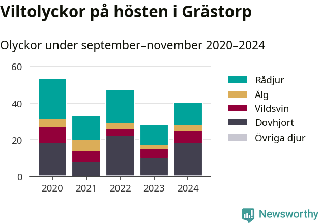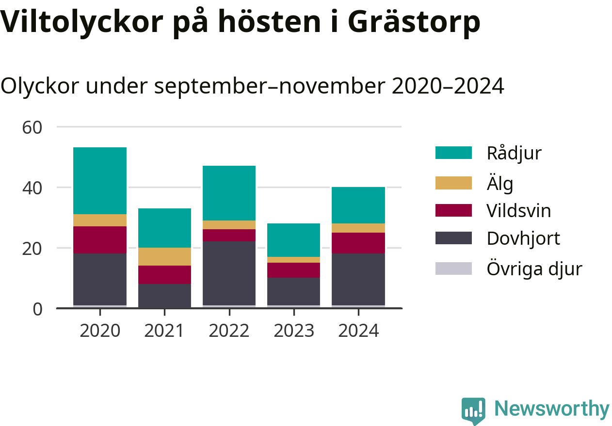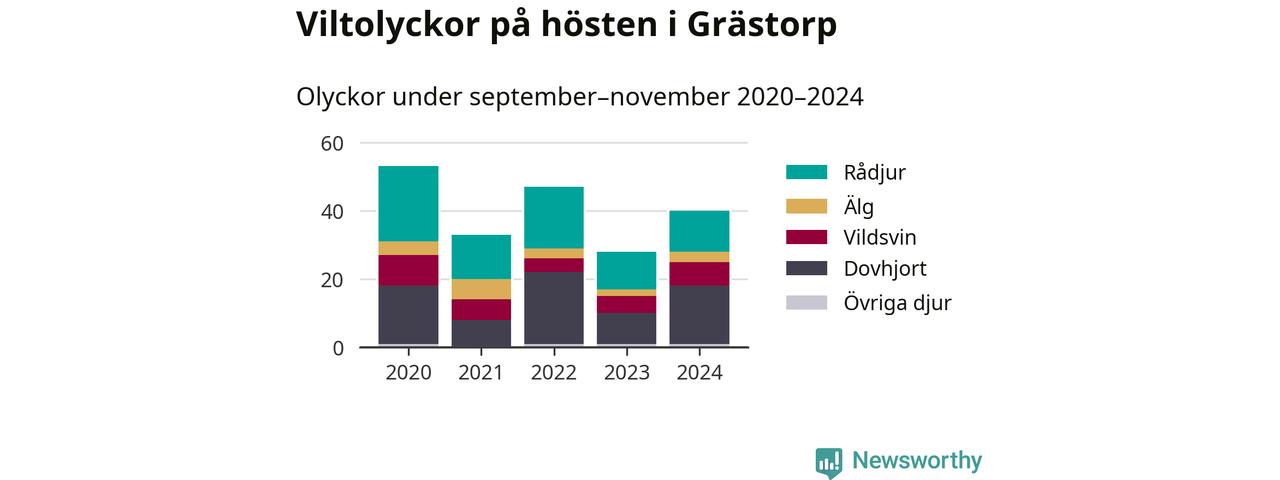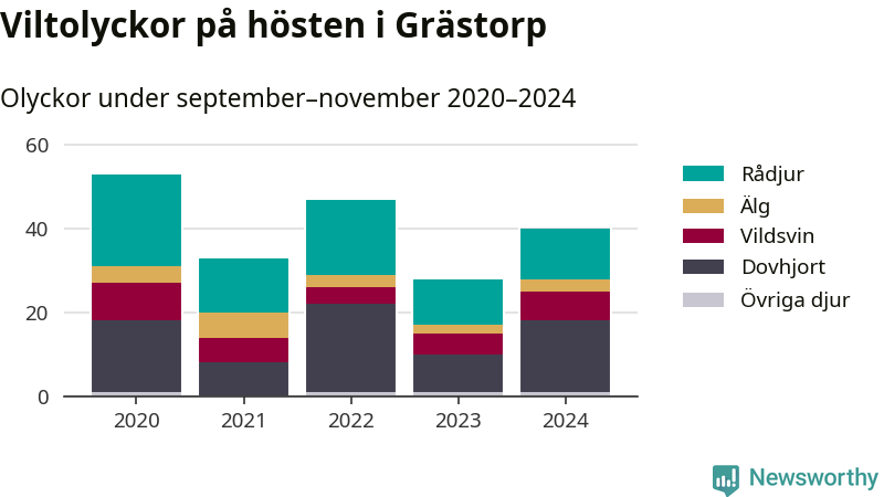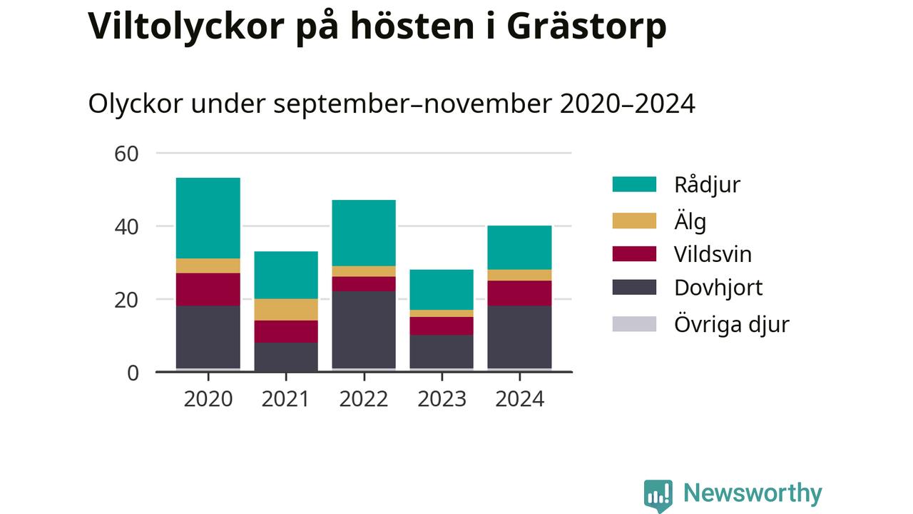 Under de senaste höstarna har antalet viltolyckor ökat i Sverige. Den höst med flest viltolyckor i Grästorp hittills under 2020-talet var 2020, 53 olyckor. I fjol höst rapporterades totalt 40 olyckor.
