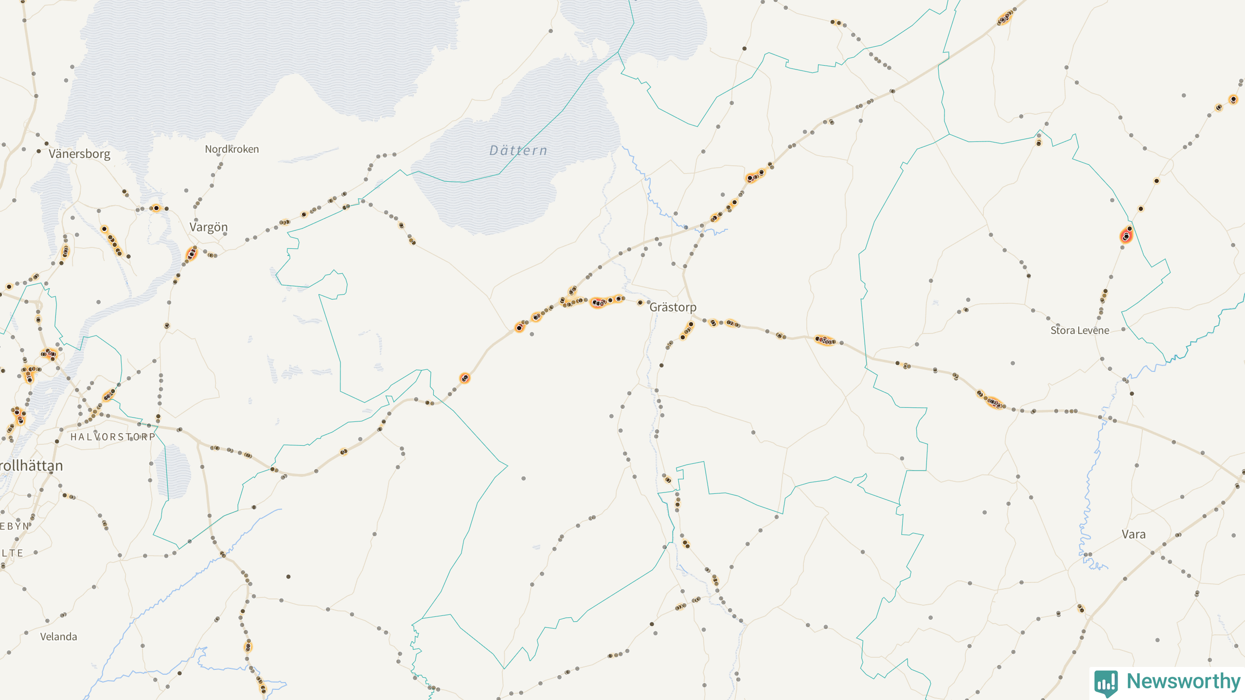 Den mest olycksdrabbade vägen i Västra Götaland är väg 190, med totalt 399 rapporterade viltolyckor i länet under femårsperioden. Flest olyckor längs väg 190 – 282 stycken – skedde i Alingsås kommun. Alingsås är också den kommun med flest registrerade viltolyckor i länet totalt, 907 stycken under perioden september–november 2020–2024.