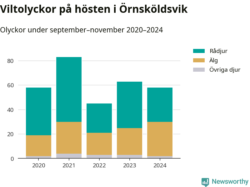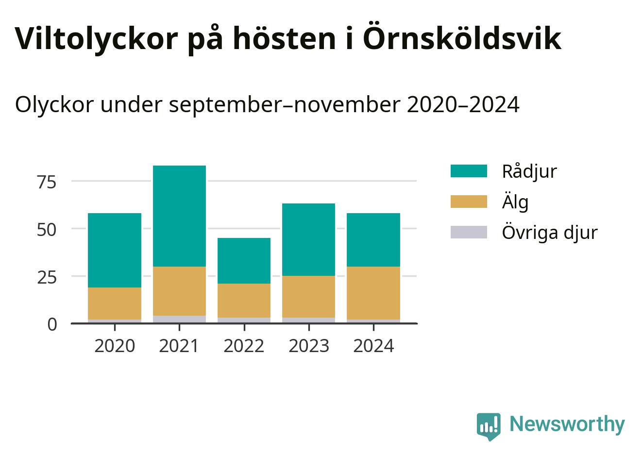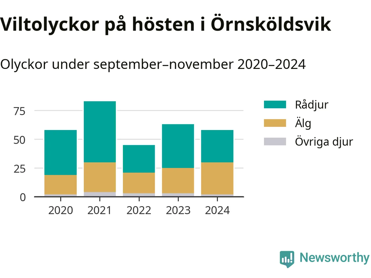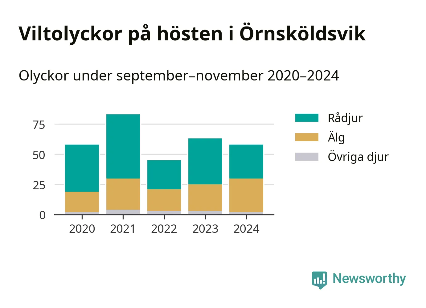 Under de senaste höstarna har antalet viltolyckor ökat i Sverige. Den höst med flest viltolyckor i Örnsköldsvik hittills under 2020-talet var 2021, 83 olyckor. I fjol höst rapporterades totalt 58 olyckor.