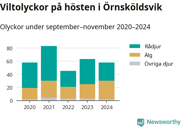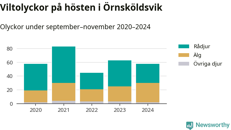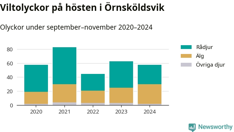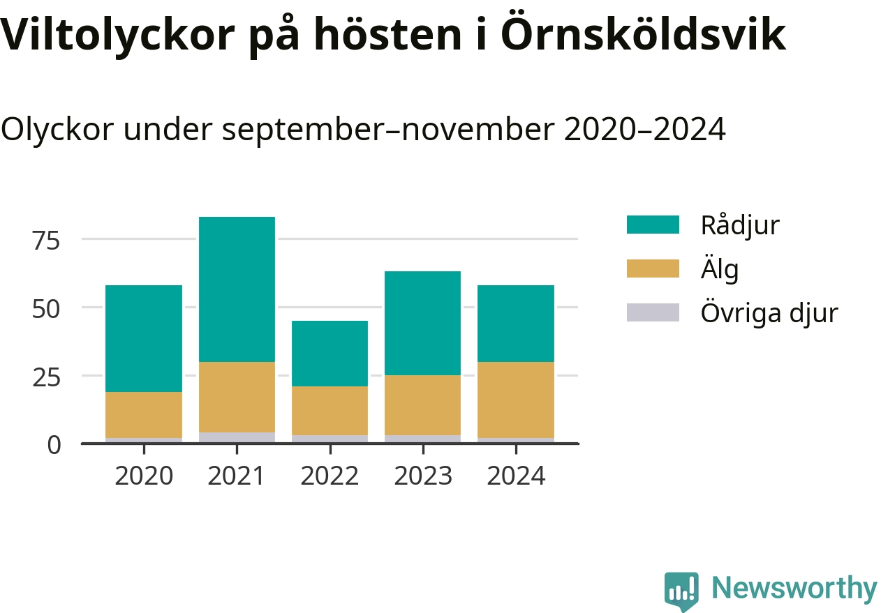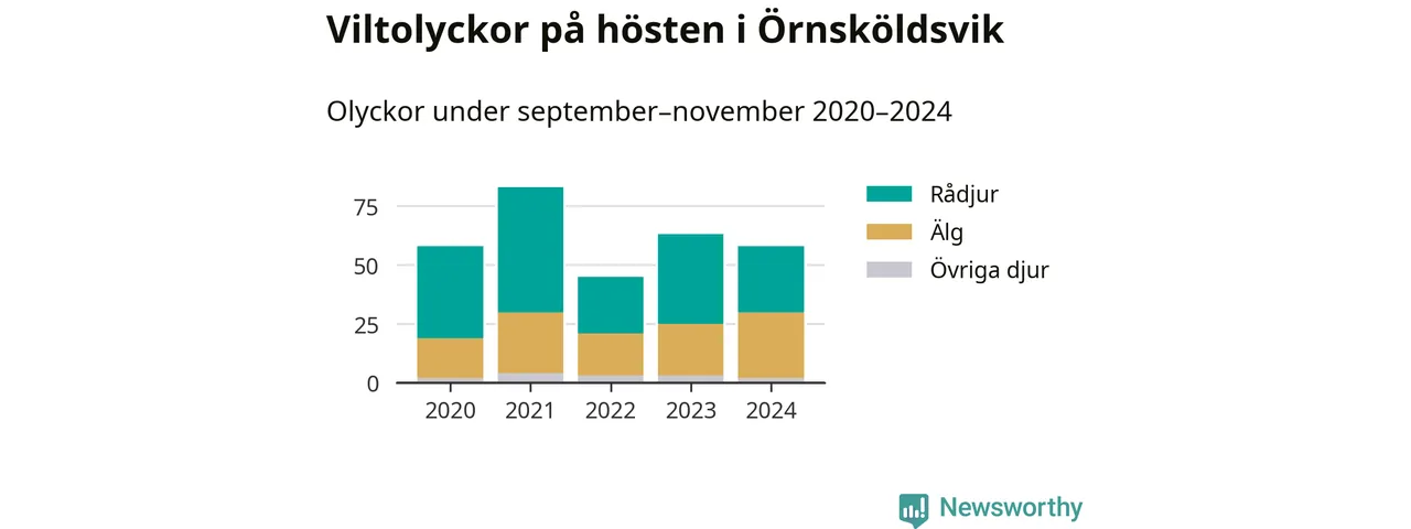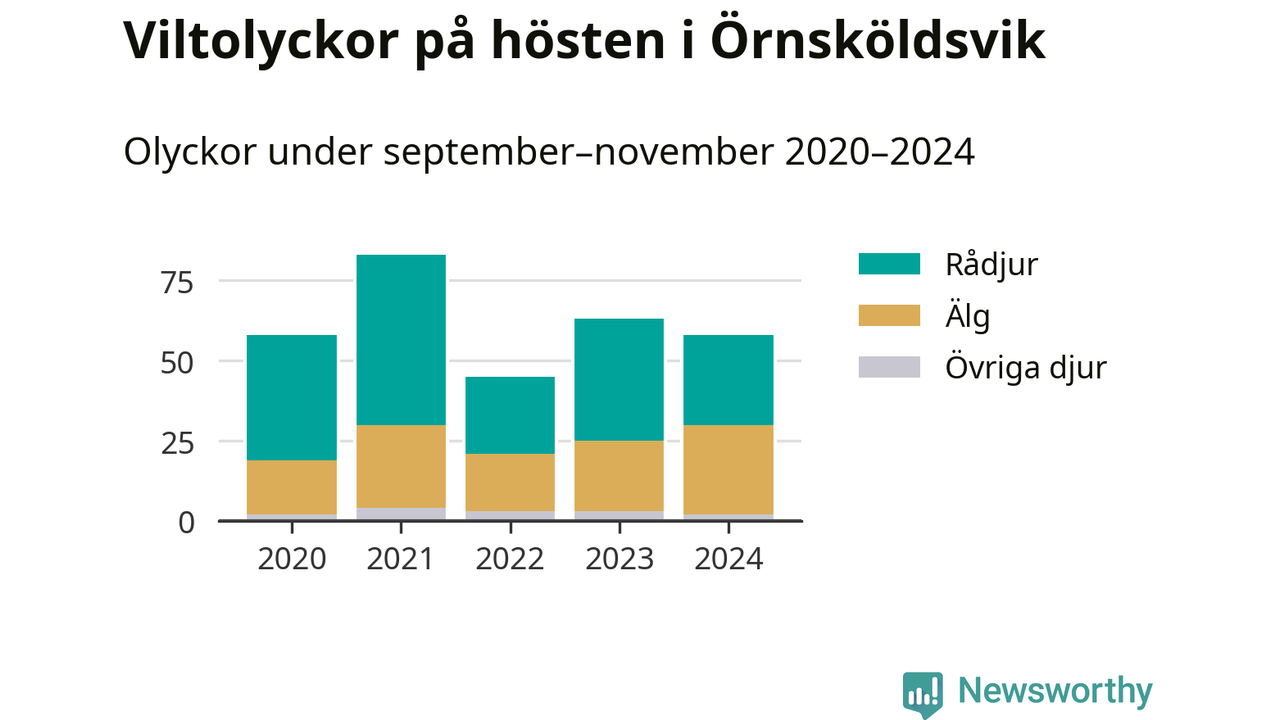 Under de senaste höstarna har antalet viltolyckor ökat i Sverige. Den höst med flest viltolyckor i Örnsköldsvik hittills under 2020-talet var 2021, 83 olyckor. I fjol höst rapporterades totalt 58 olyckor.