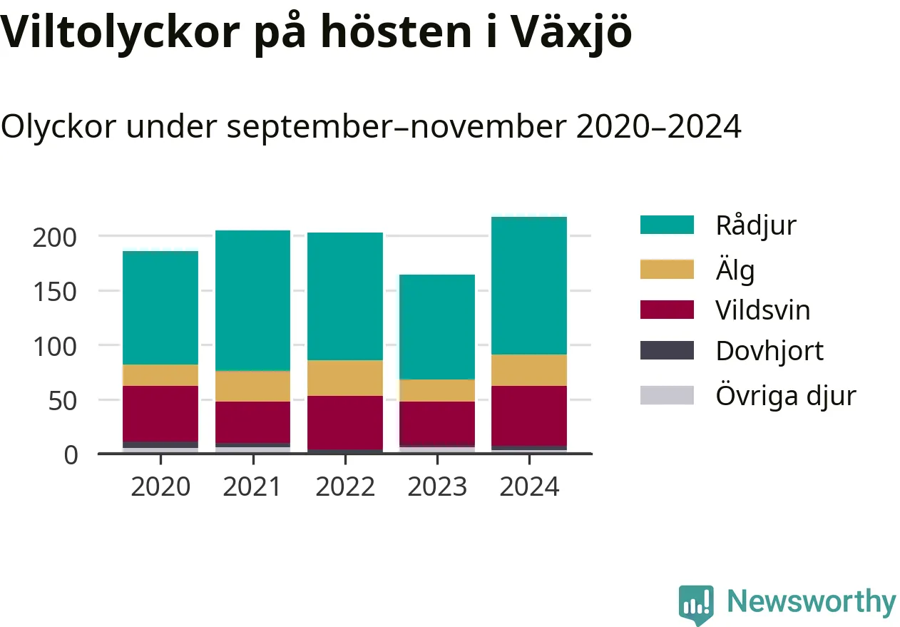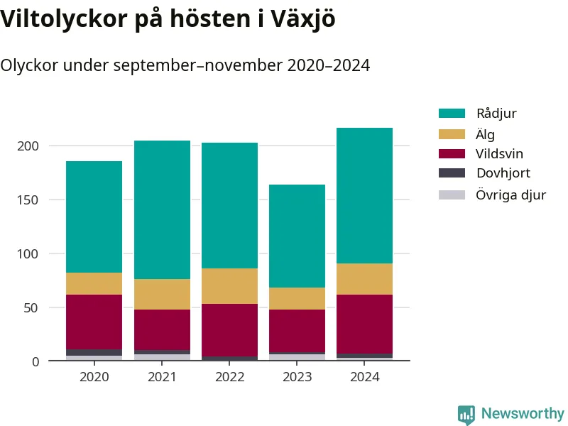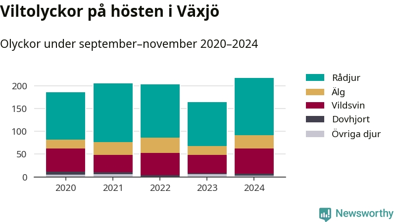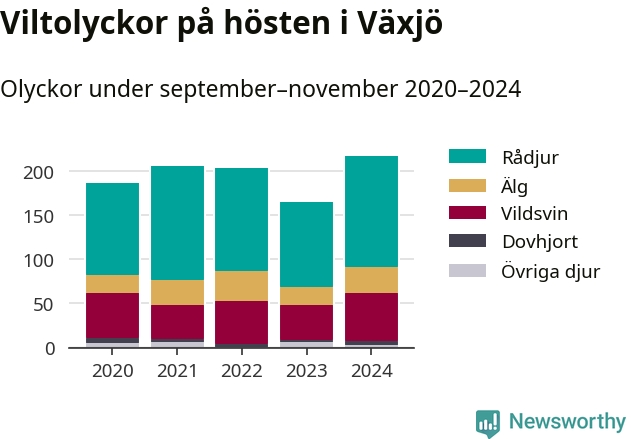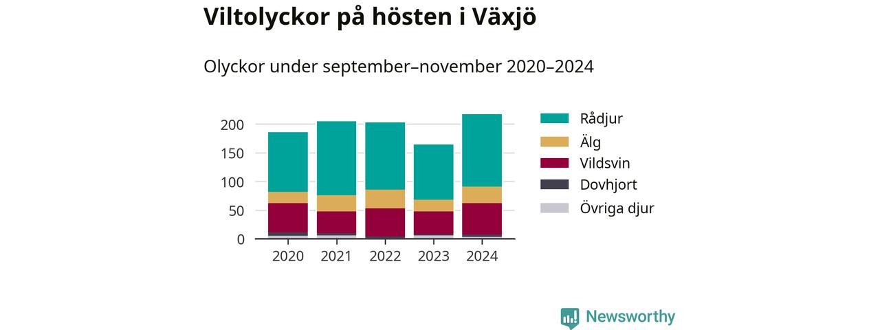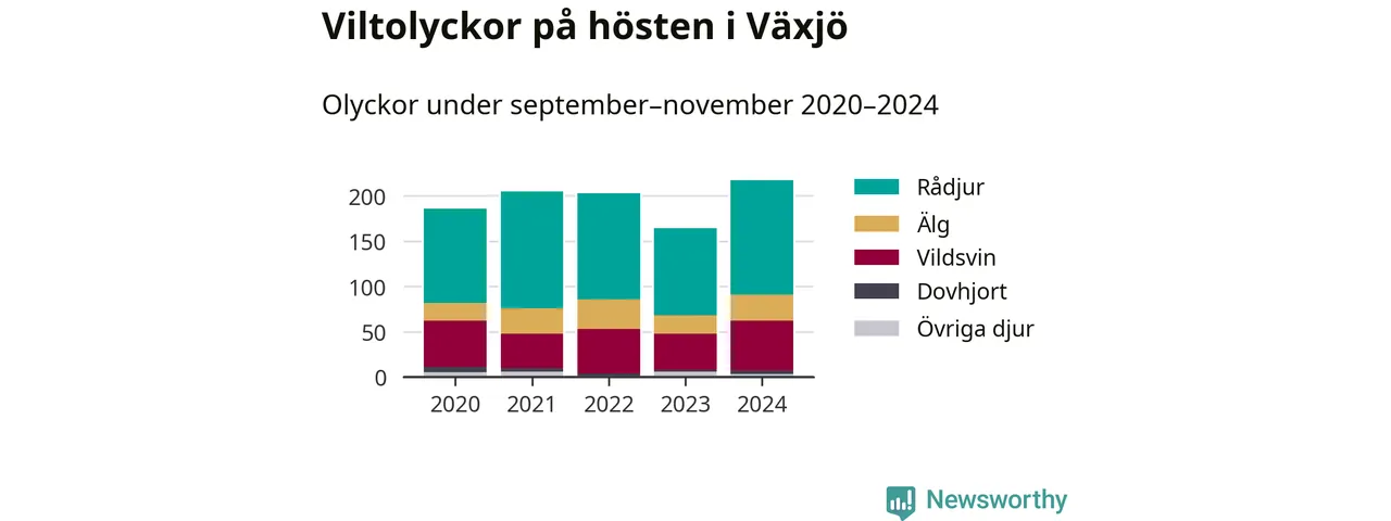 Viltolyckor i Växjö 2020–2024 uppdelat på viltslag