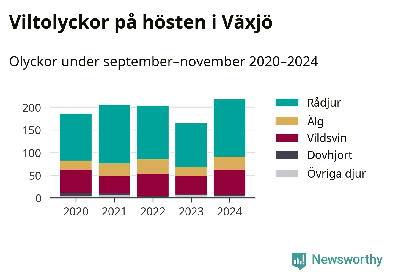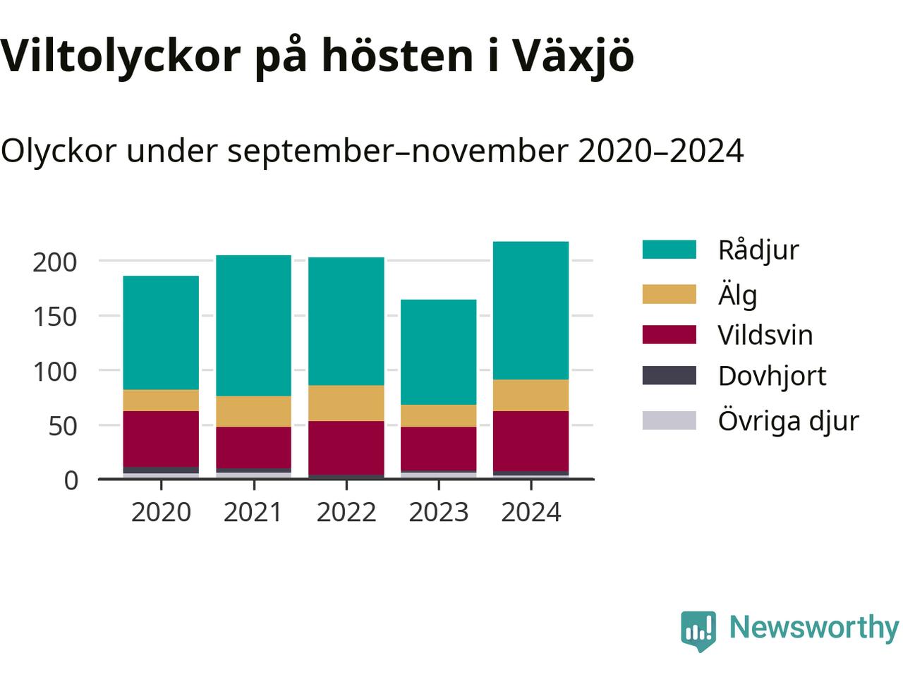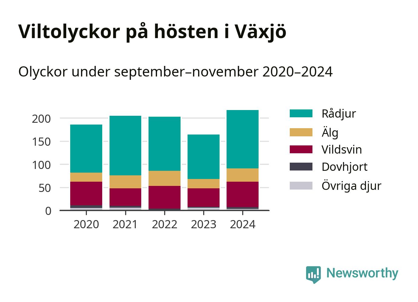 Viltolyckor i Växjö 2020–2024 uppdelat på viltslag