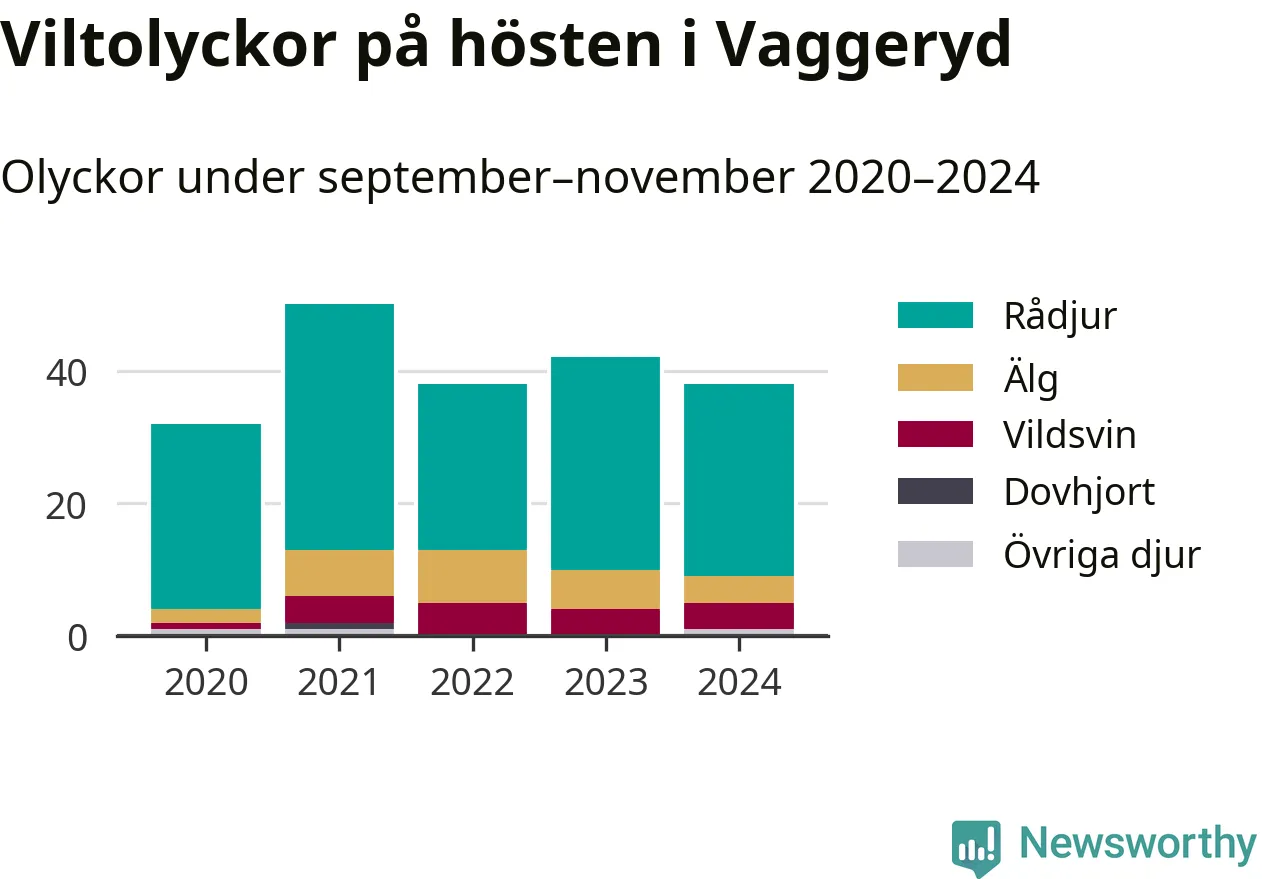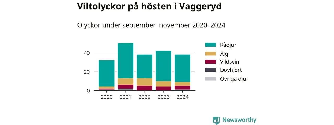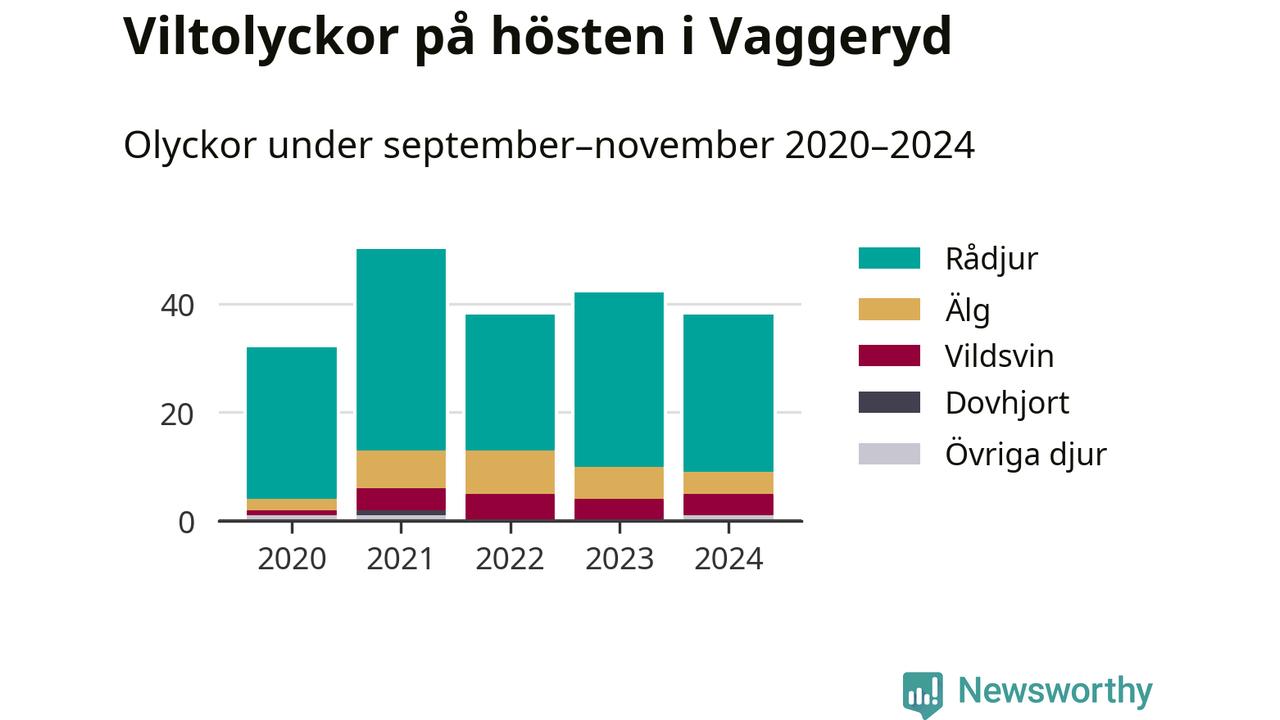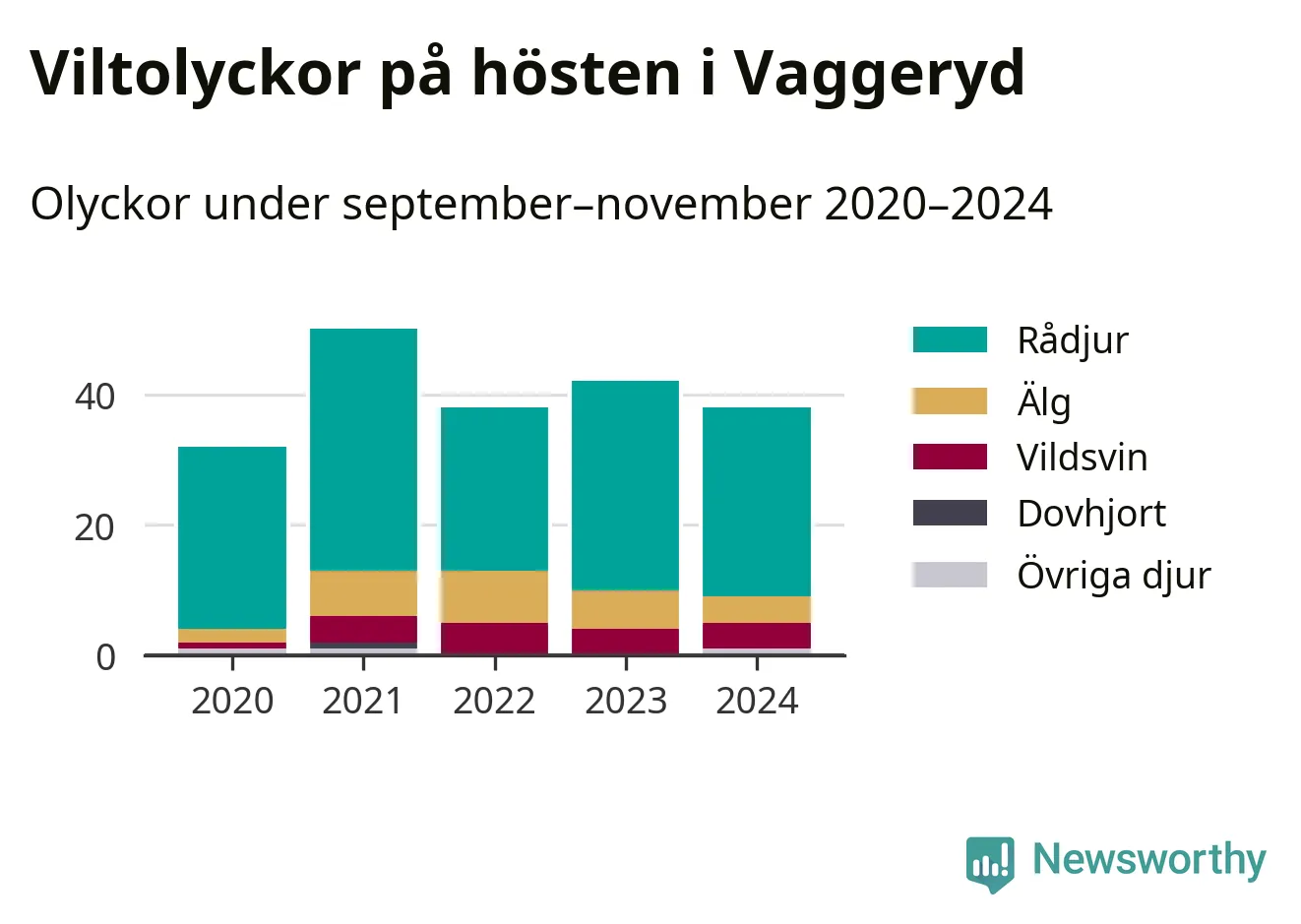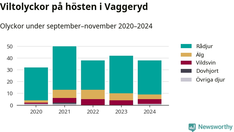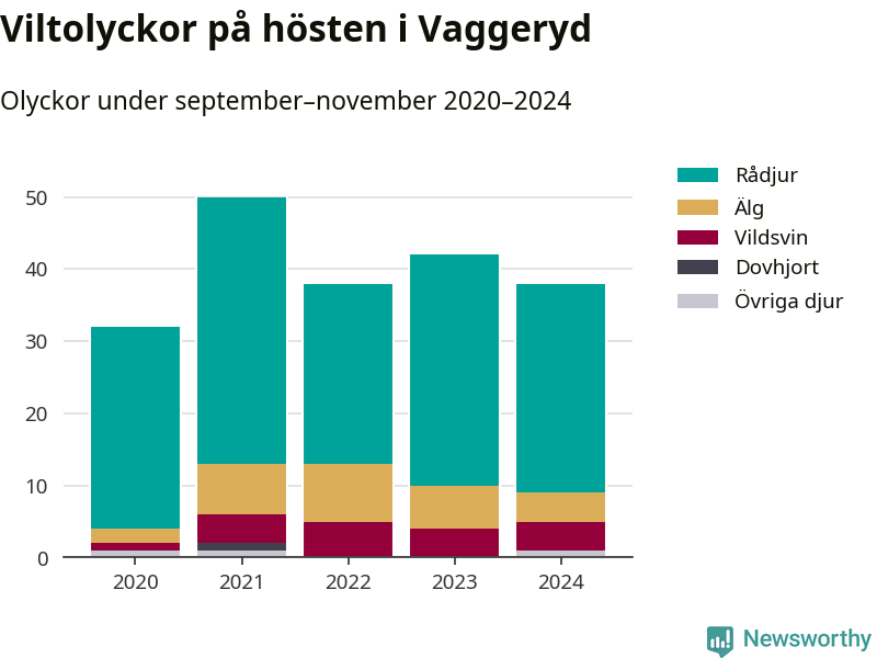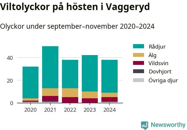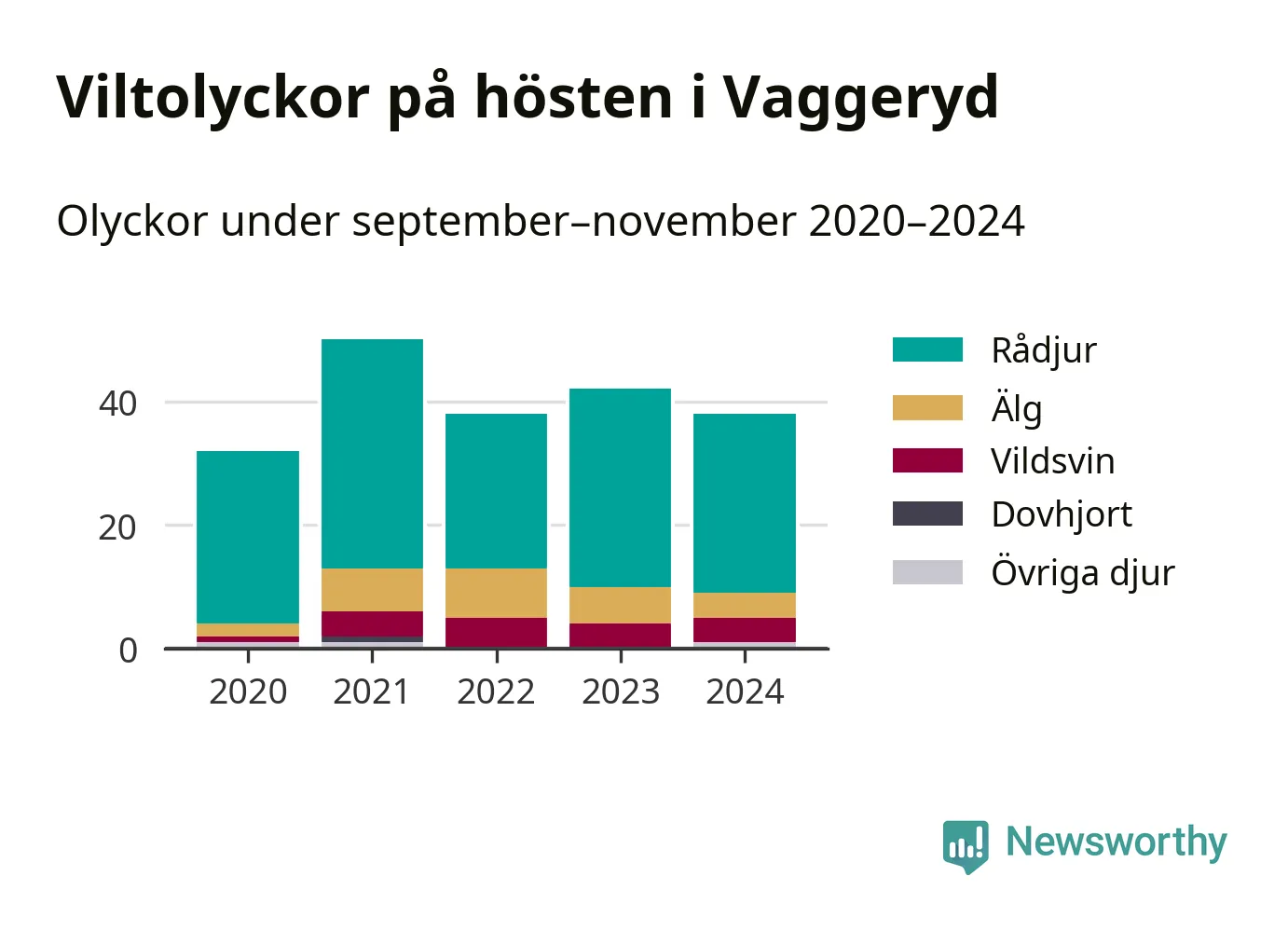 Under de senaste höstarna har antalet viltolyckor ökat i Sverige. Den höst med flest viltolyckor i Vaggeryd hittills under 2020-talet var 2021, 50 olyckor. I fjol höst rapporterades totalt 38 olyckor.