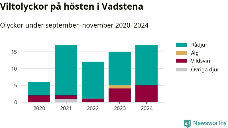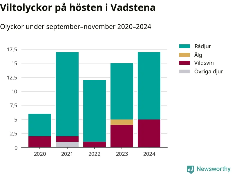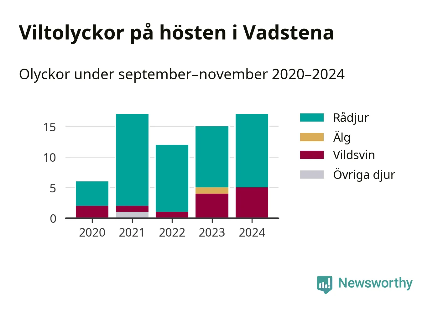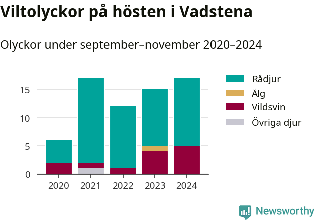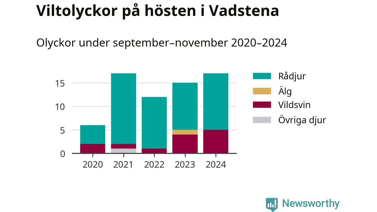 Under de senaste höstarna har antalet viltolyckor ökat i Sverige. I fjol höst noterades också flest viltolyckor i Vadstena hittills under 2020-talet, totalt 17 stycken.