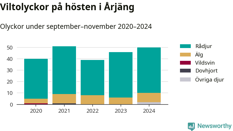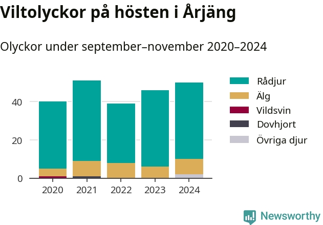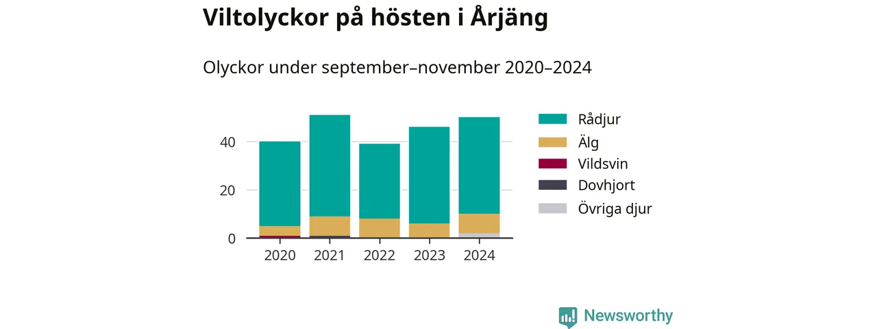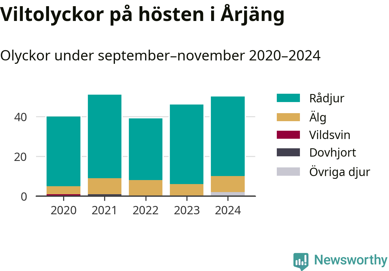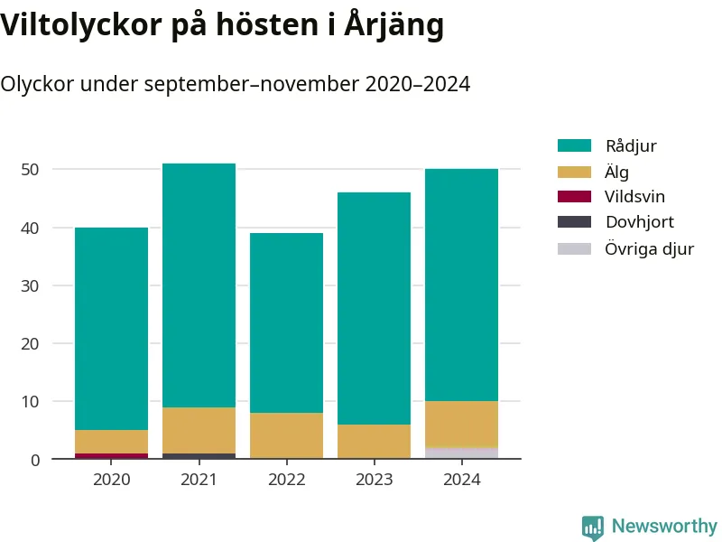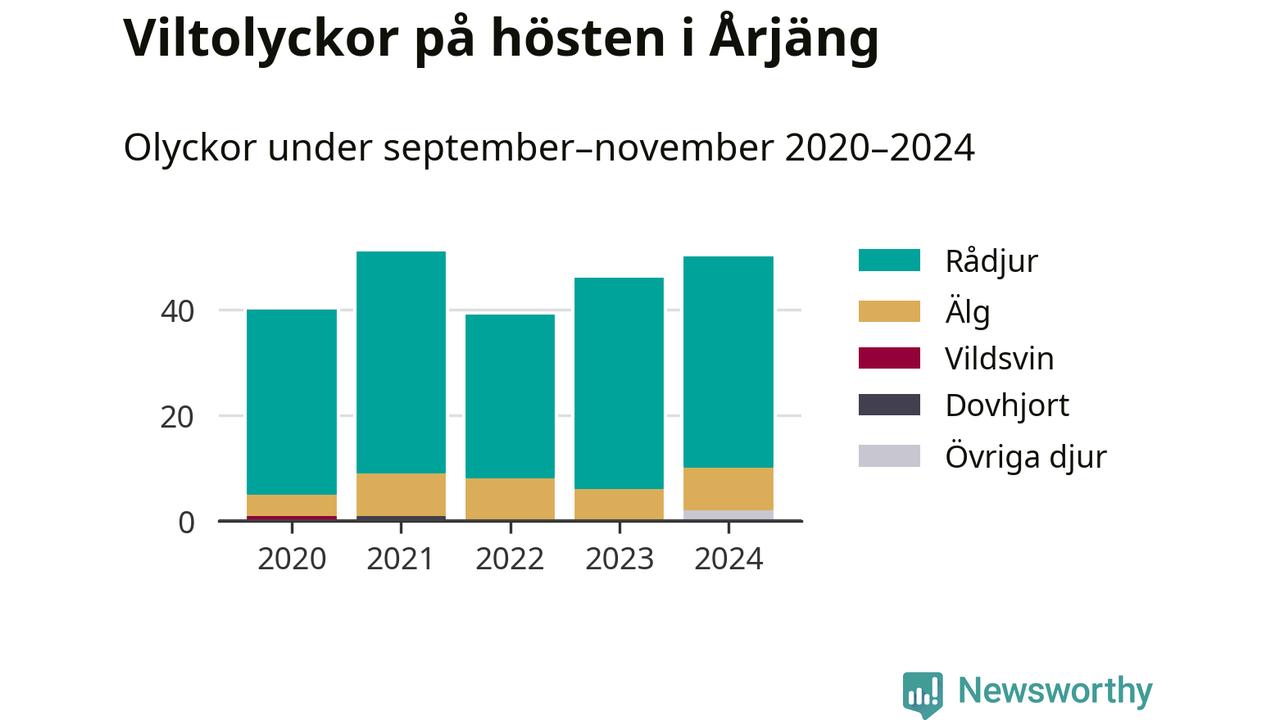 Under de senaste höstarna har antalet viltolyckor ökat i Sverige. Den höst med flest viltolyckor i Årjäng hittills under 2020-talet var 2021, 51 olyckor. I fjol höst rapporterades totalt 50 olyckor.