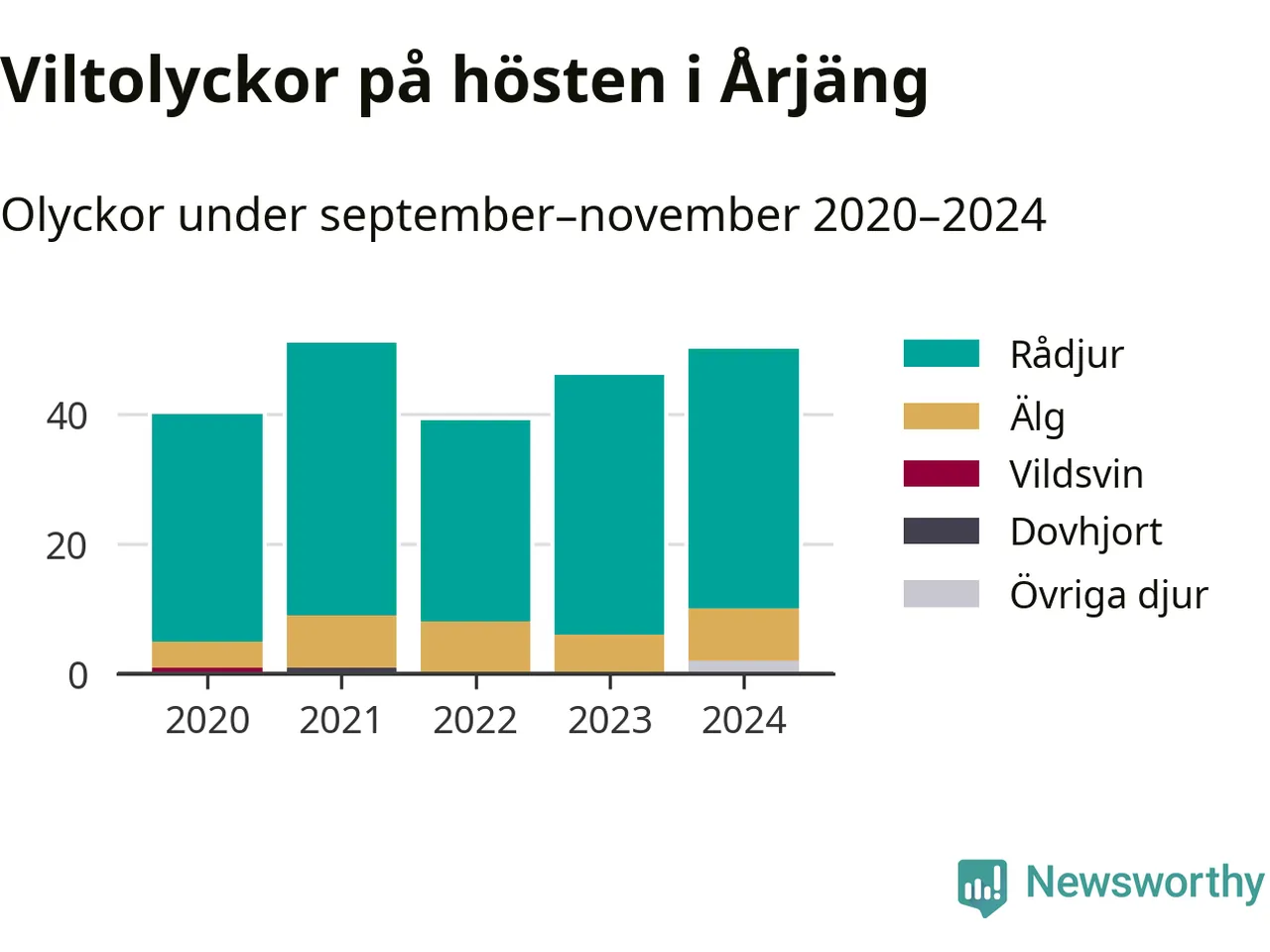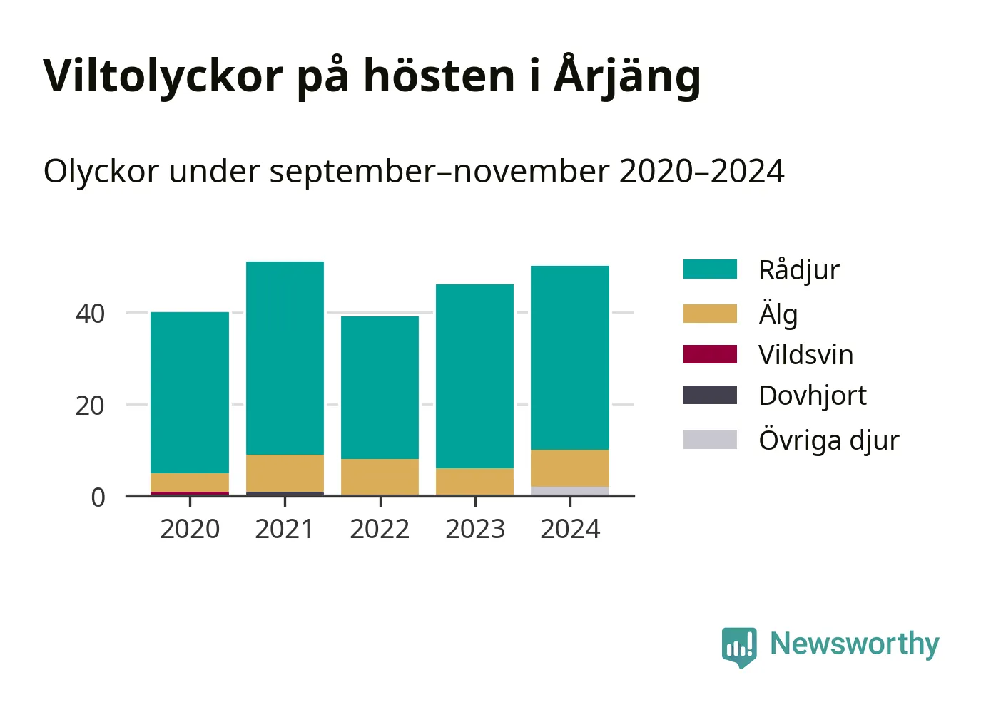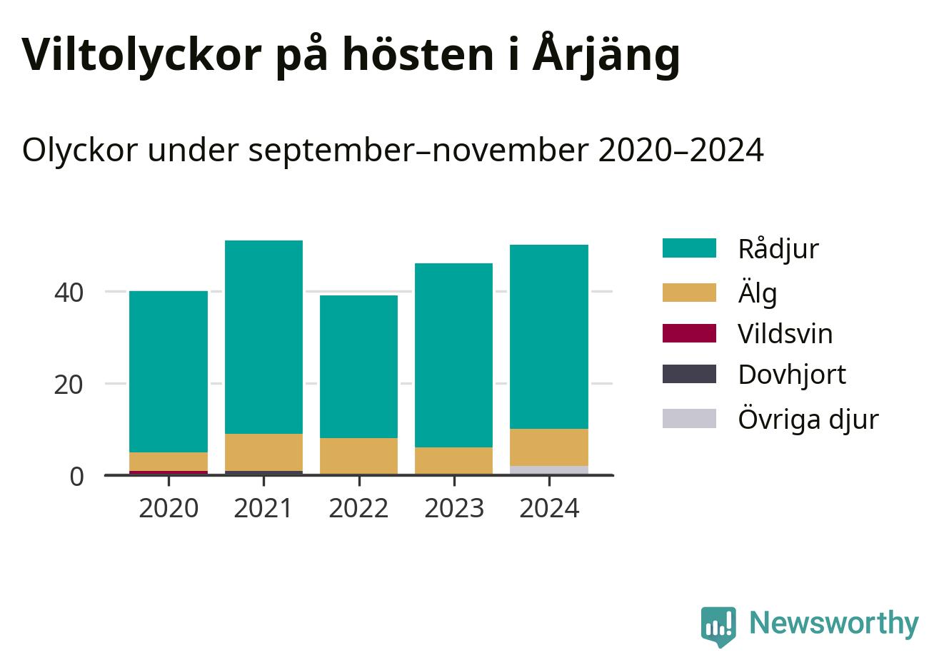 Under de senaste höstarna har antalet viltolyckor ökat i Sverige. Den höst med flest viltolyckor i Årjäng hittills under 2020-talet var 2021, 51 olyckor. I fjol höst rapporterades totalt 50 olyckor.