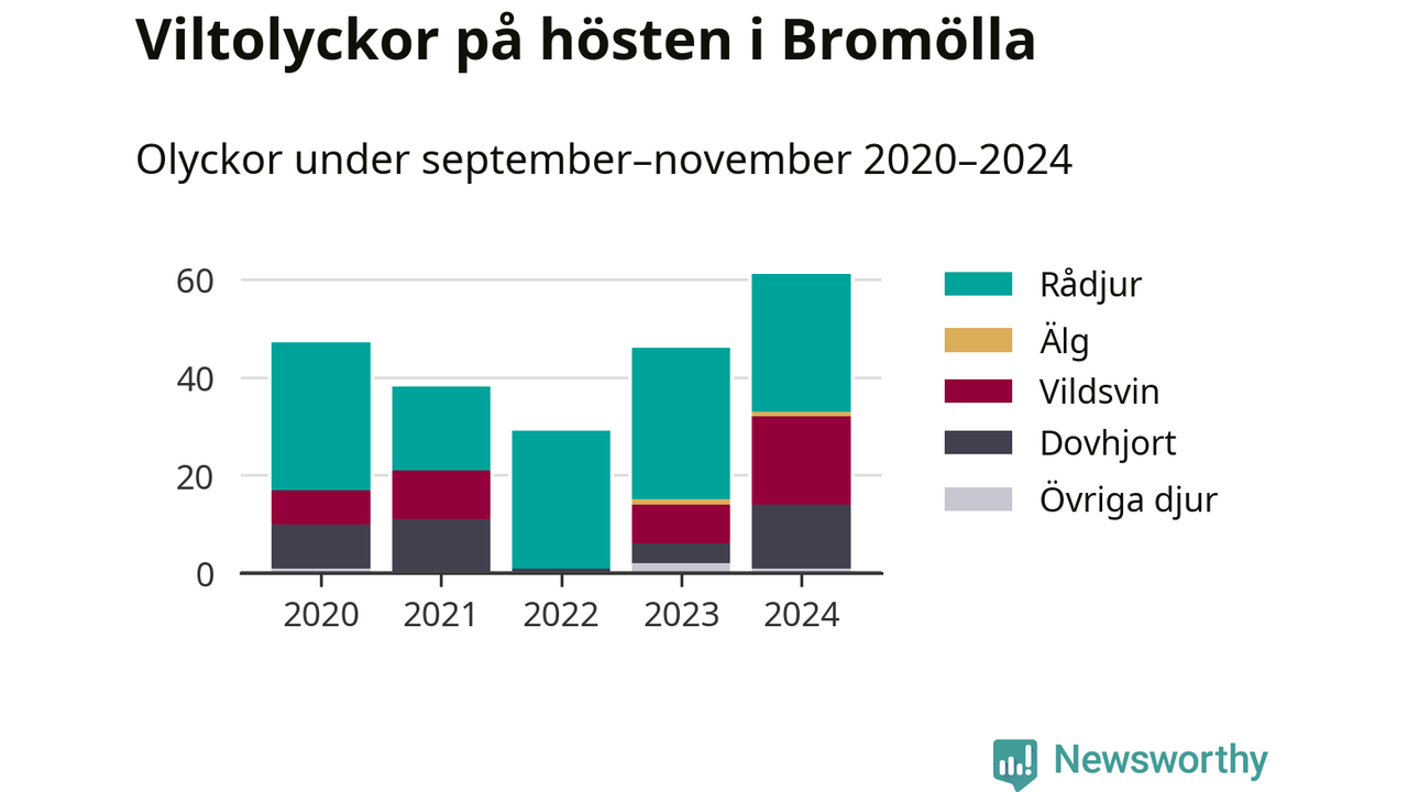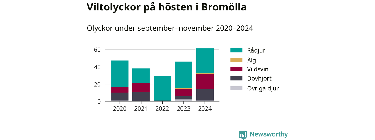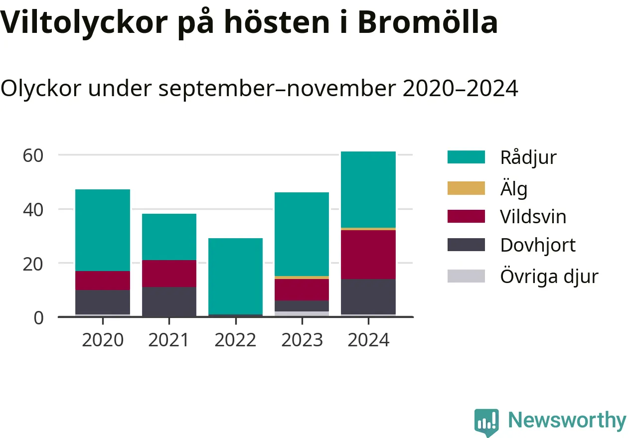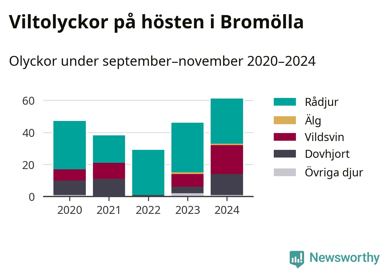 Under de senaste höstarna har antalet viltolyckor ökat i Sverige. I fjol höst noterades också flest viltolyckor i Bromölla hittills under 2020-talet, totalt 61 stycken.